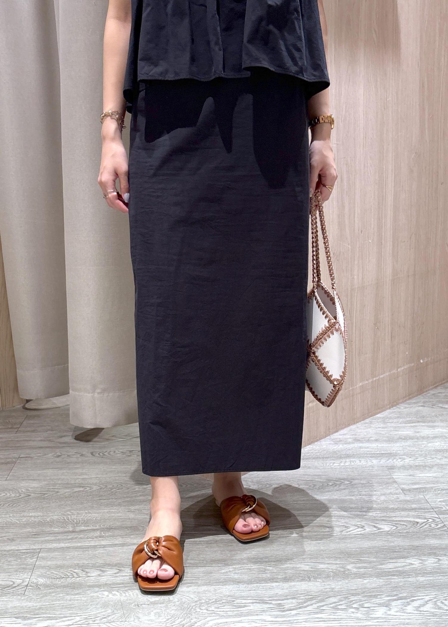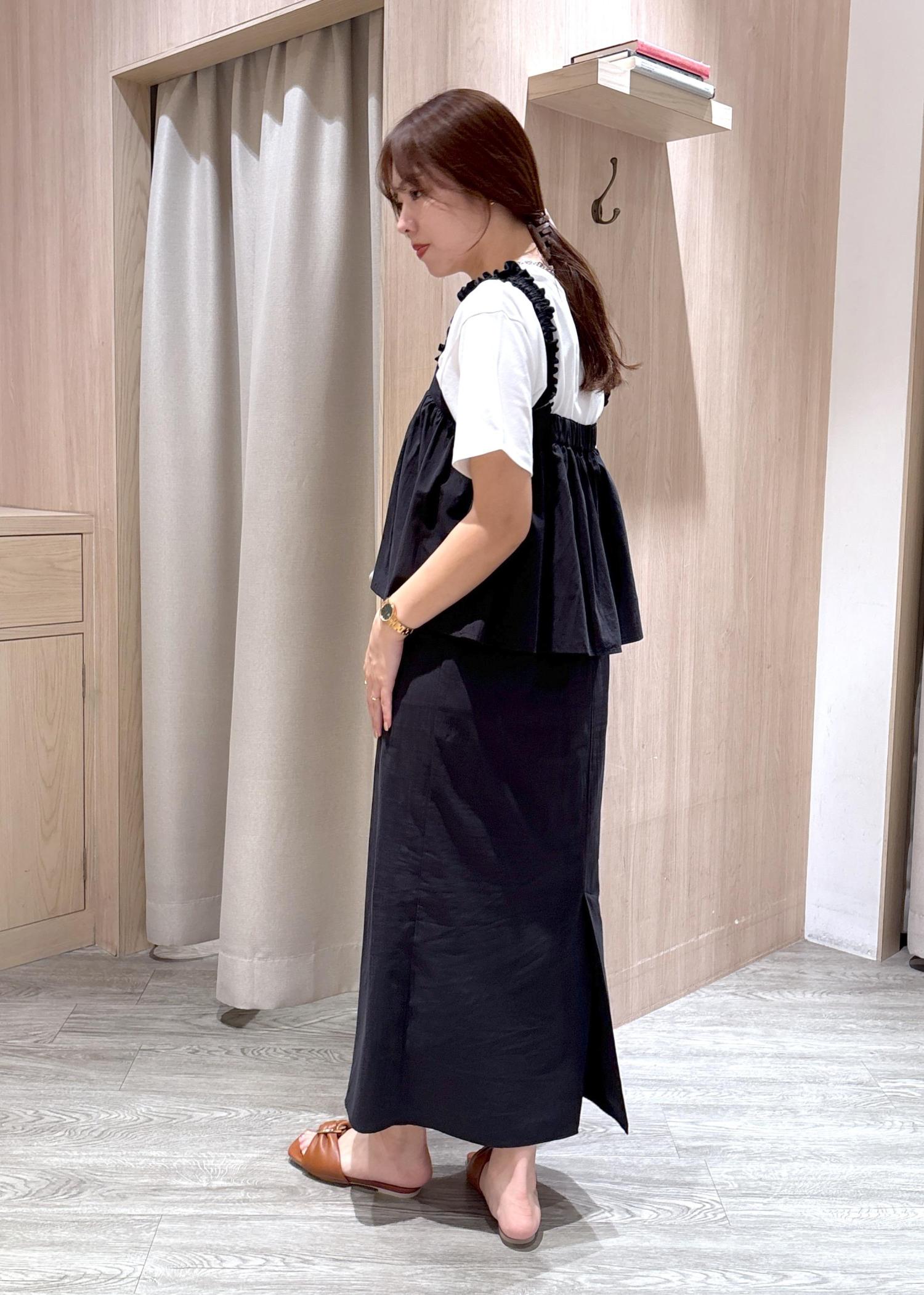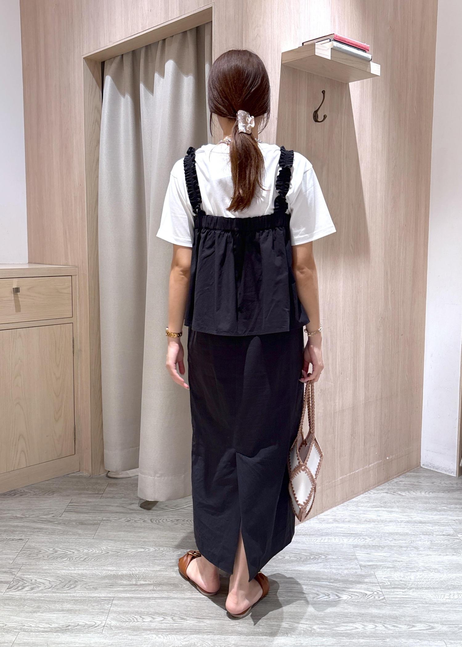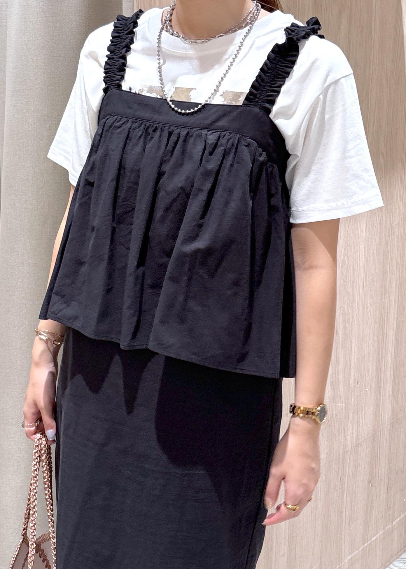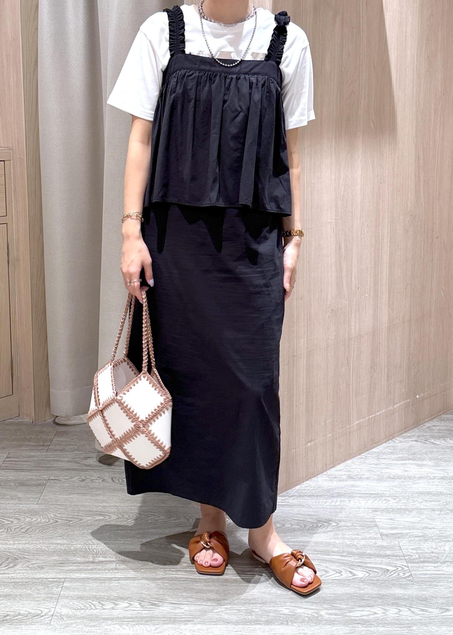 Tシャツを合わせることでフェミニンすぎずカジュアルなスタイルに!
