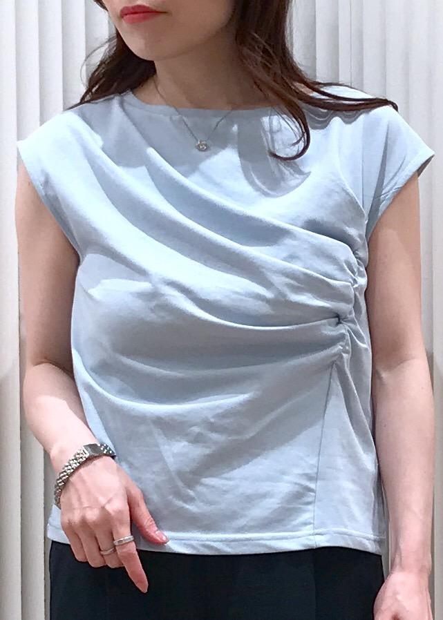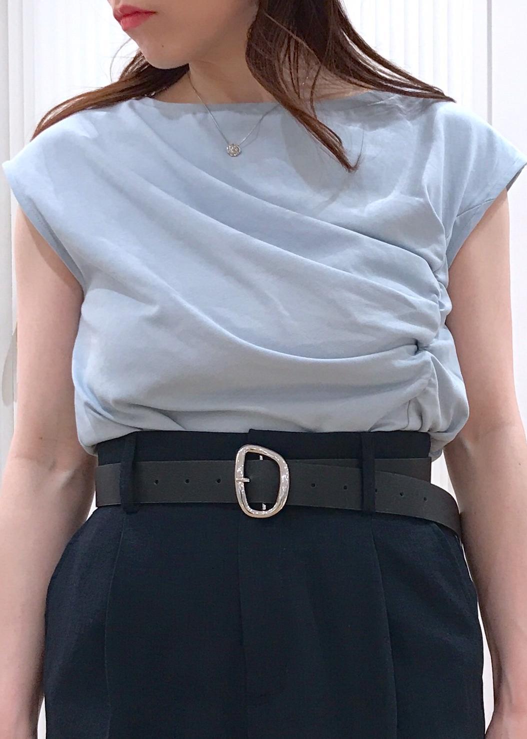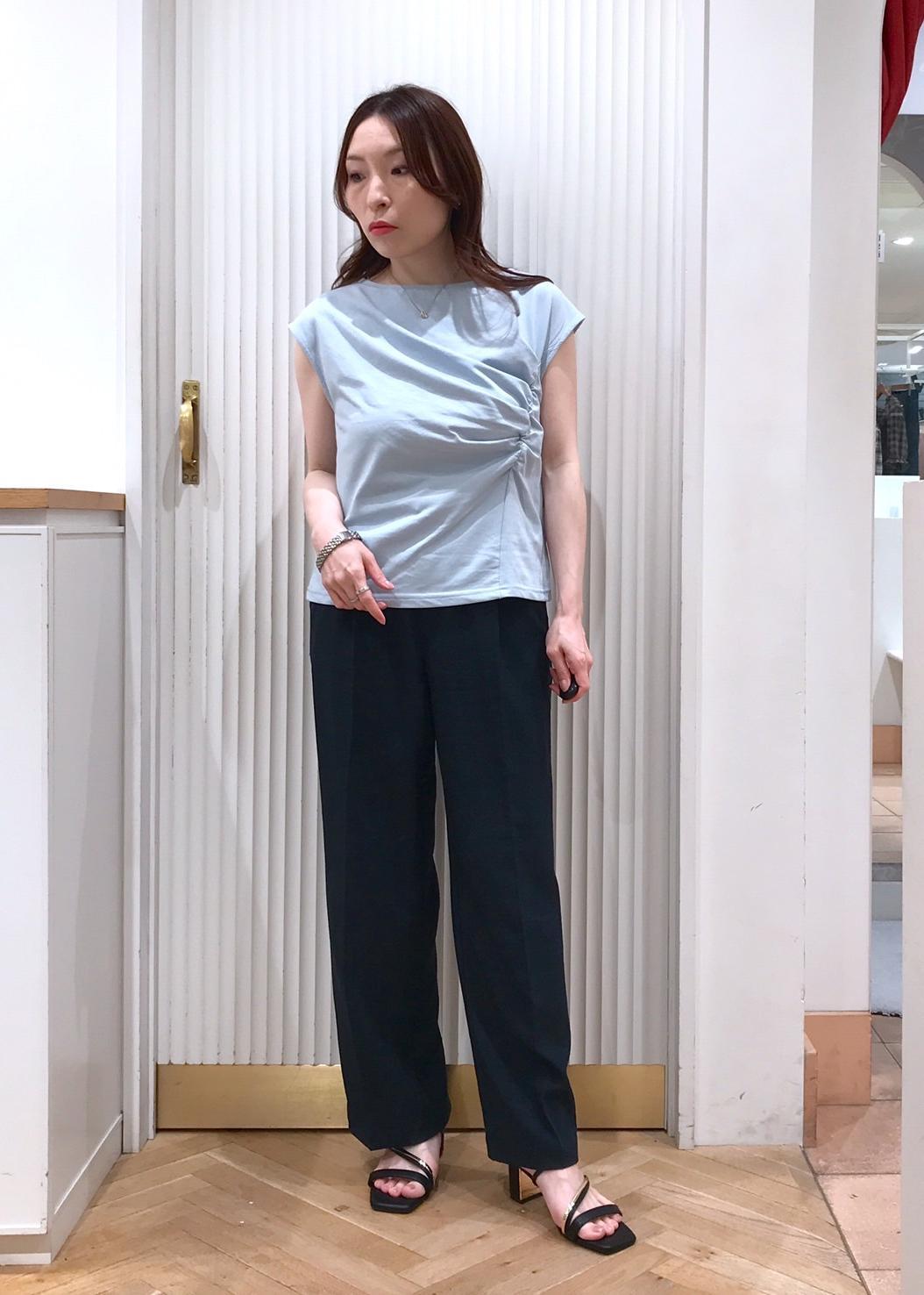 ぱっと着るだけで着映える、ドレープの入ったカットソーをきれいめパンツでお仕事コーデに。