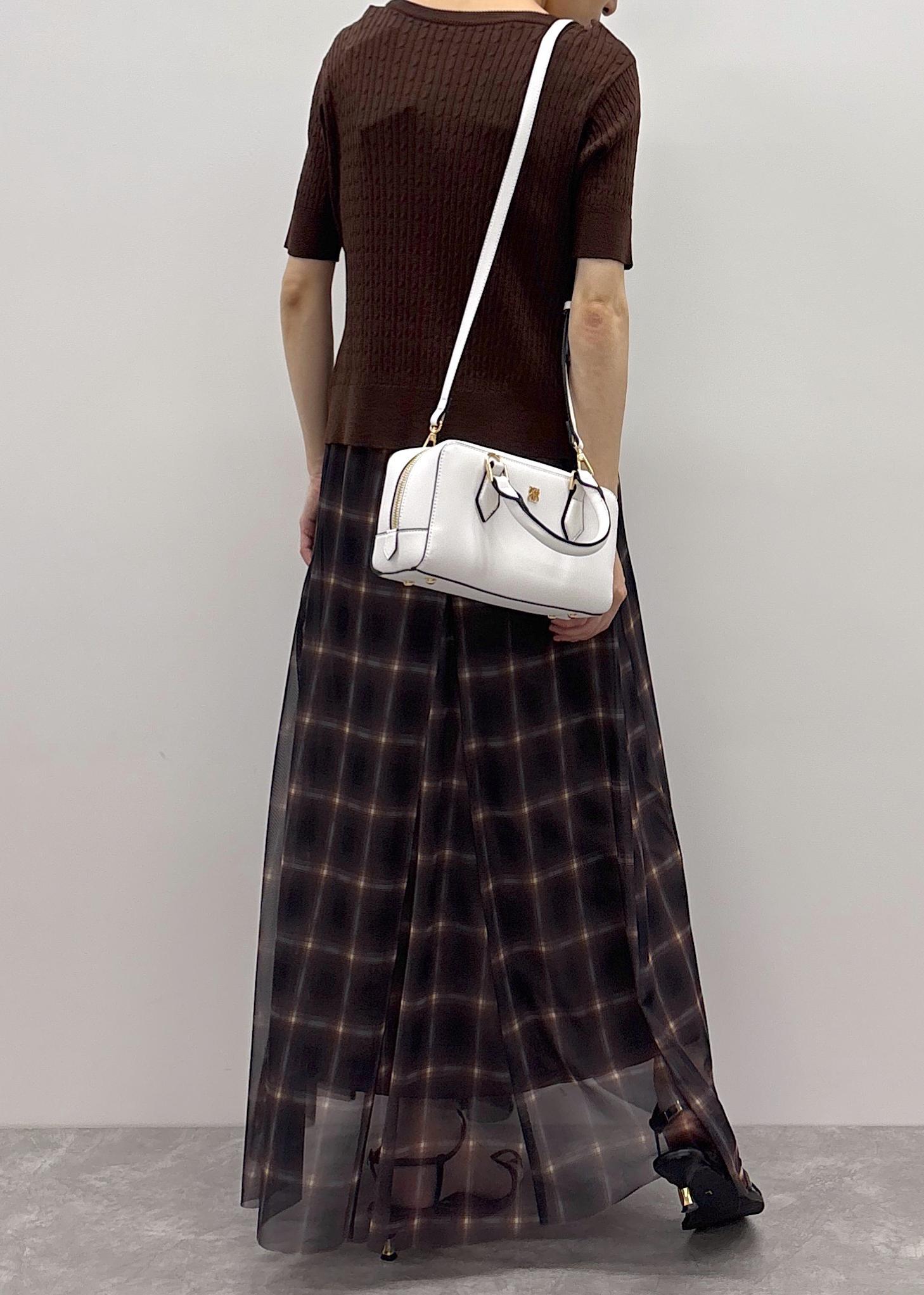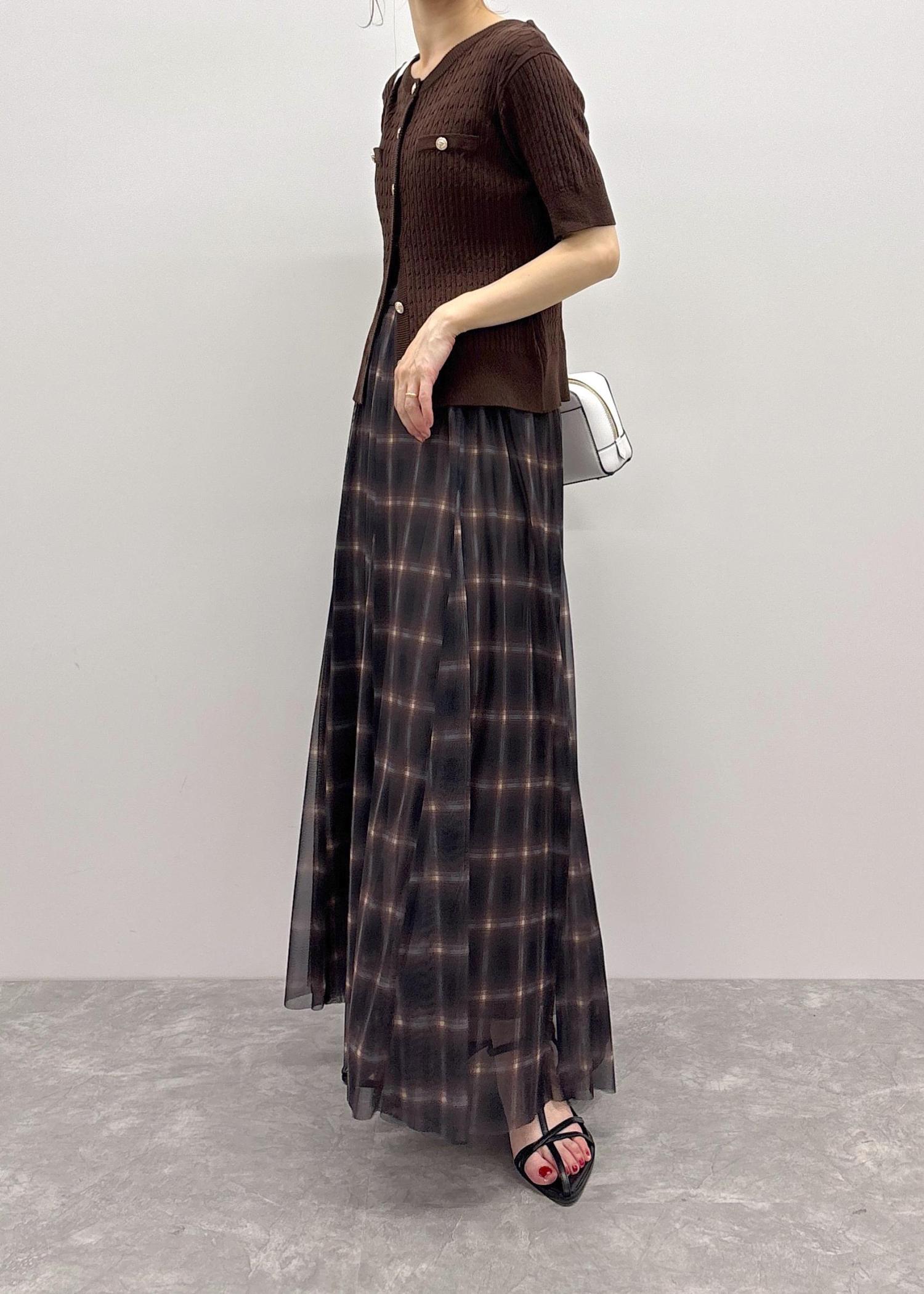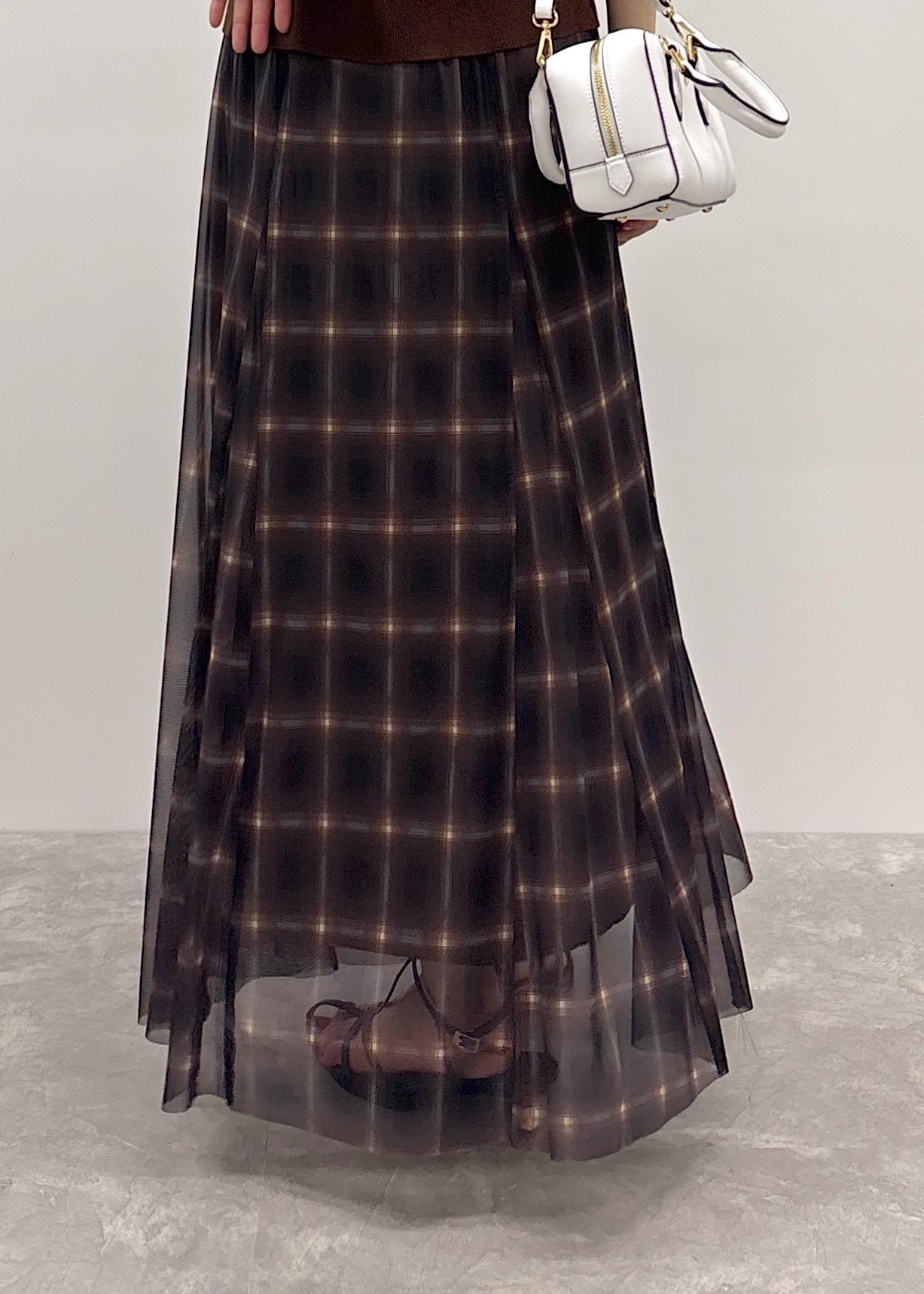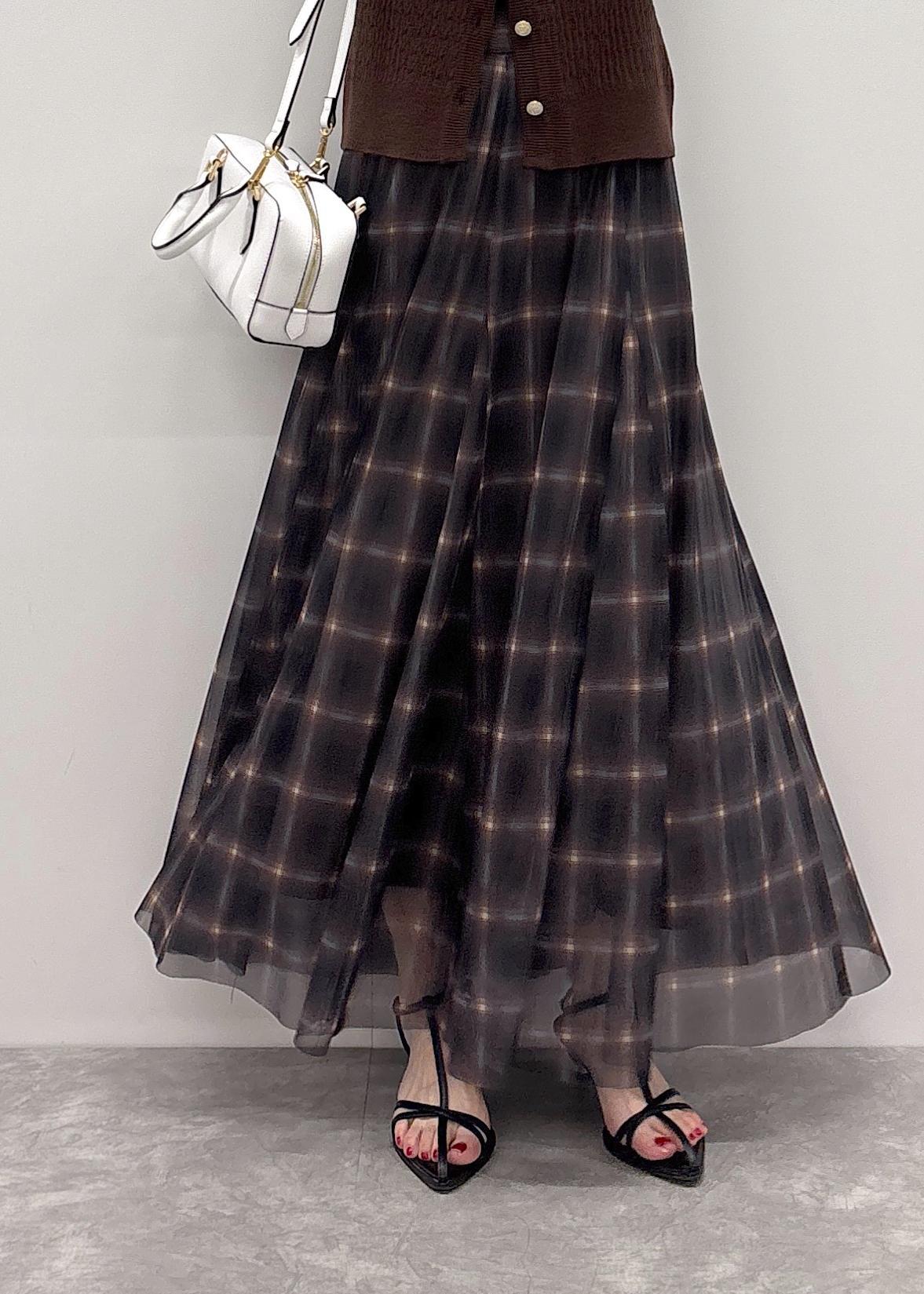 ふんわりチュールが大人可愛いスカート♪こちらチュールに少し大きめなチェック柄が施された、今から秋まで着回せるカラー使いで目を惹きます。ウエストはゴムでノンストレス、広がりすぎないシルエットで甘くなり過ぎないのも嬉しいポイント◎そしてとても軽いです!全体的にややゆったりめ、着丈は足首くらいの長さで裏地が少し短めなので、重く見えない印象でした。