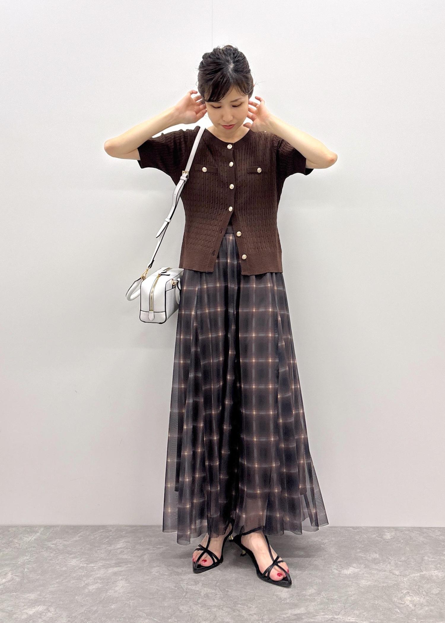 メタル釦が目を惹く大人可愛いカーディガンをメインに、チェックスカートで合わせたキレイめカジュアルスタイル♪今年らしいブラウンは落ち着きがありつつ、安心感のある女性の印象見えするのでお仕事、プライベート共に活躍◎また素材を変えることでワントーンもやぼったく見えなくてオススメです。