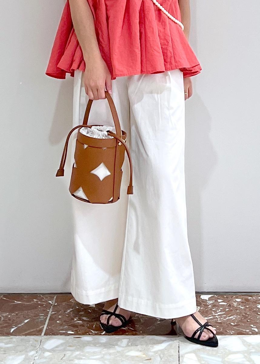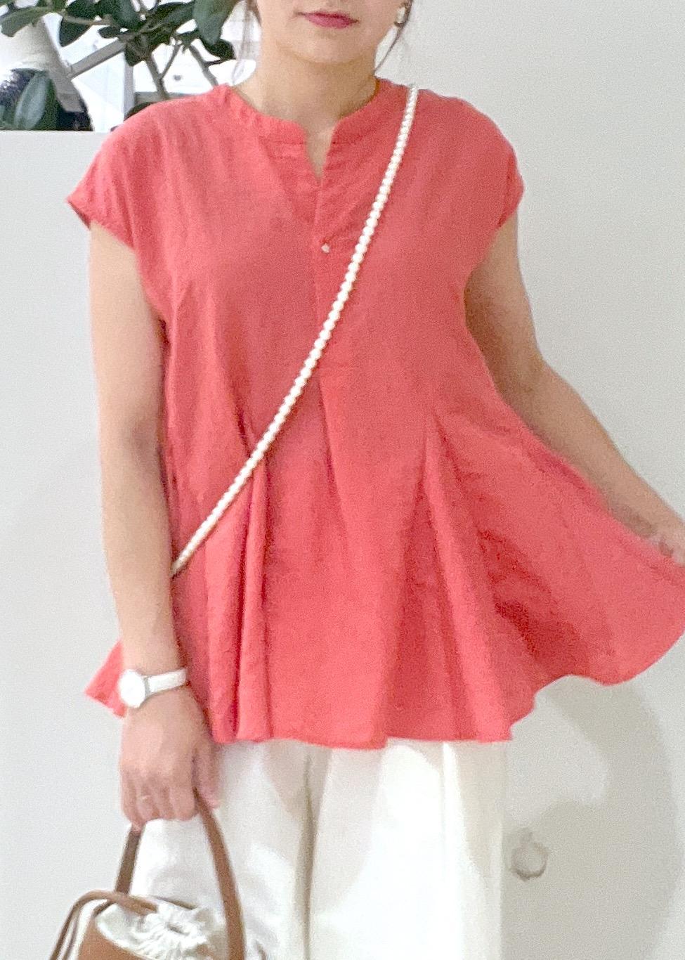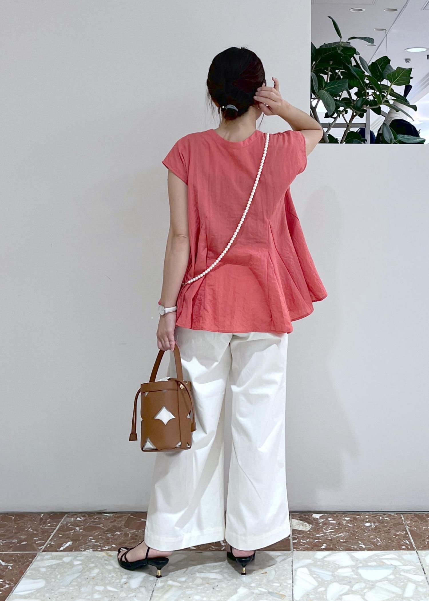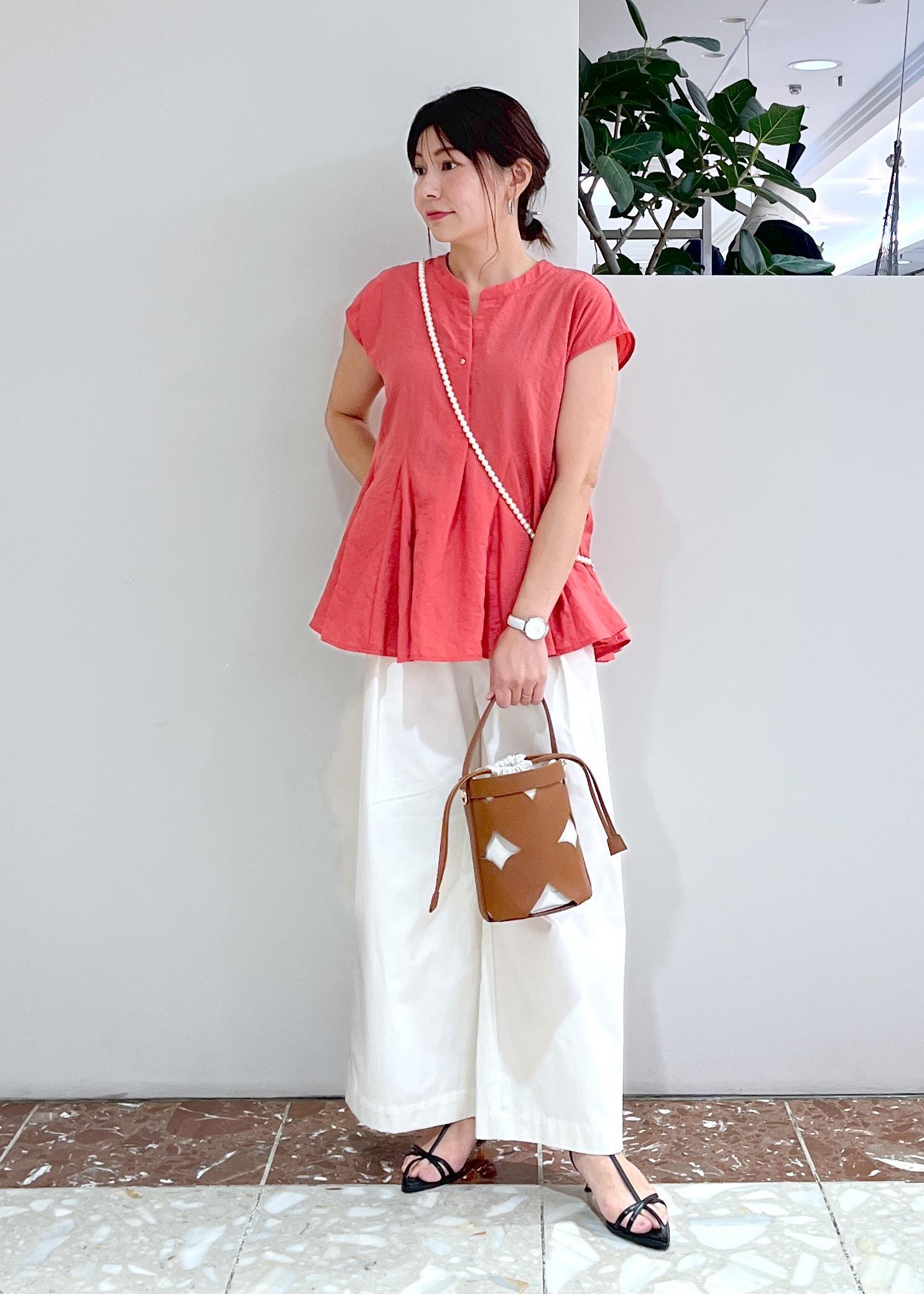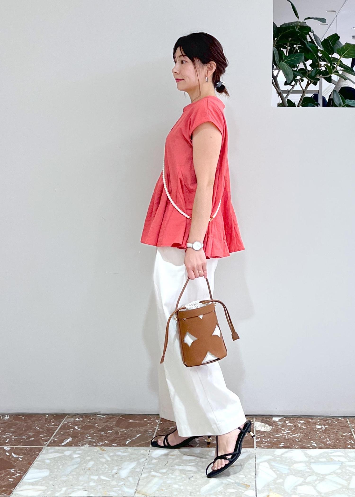 夏に映える明るめカラーのトップスに白のパンツを合わせて、爽やかに見えるコーデにしてみました。