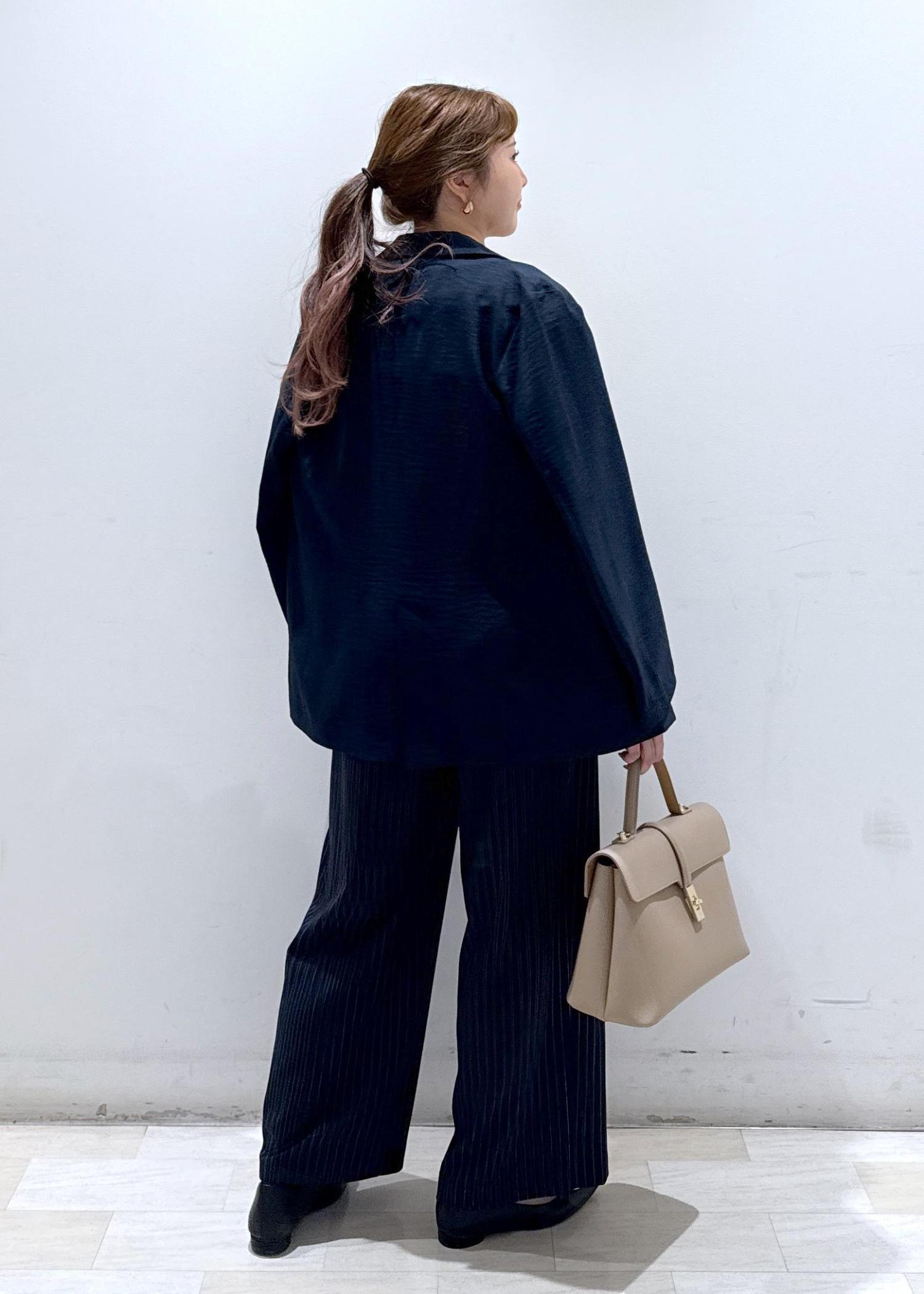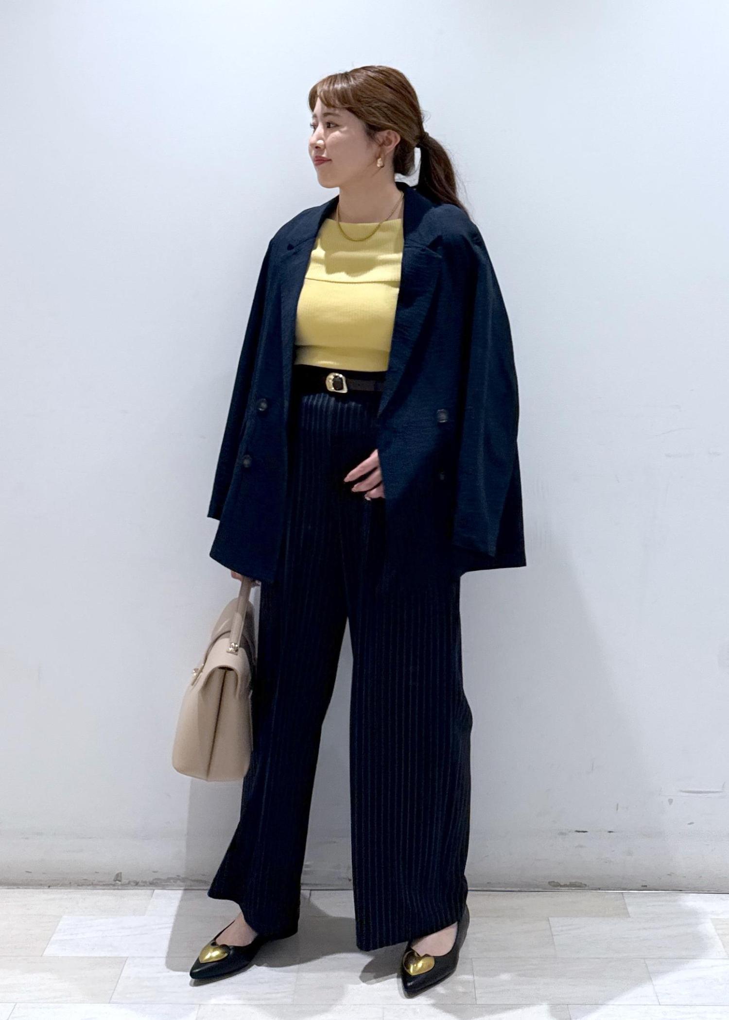 セットアップ風にして、ネイビーのストライプのボトムスと合わせてお仕事の通勤着としても使える綺麗めなコーディネートにしてみました♪
