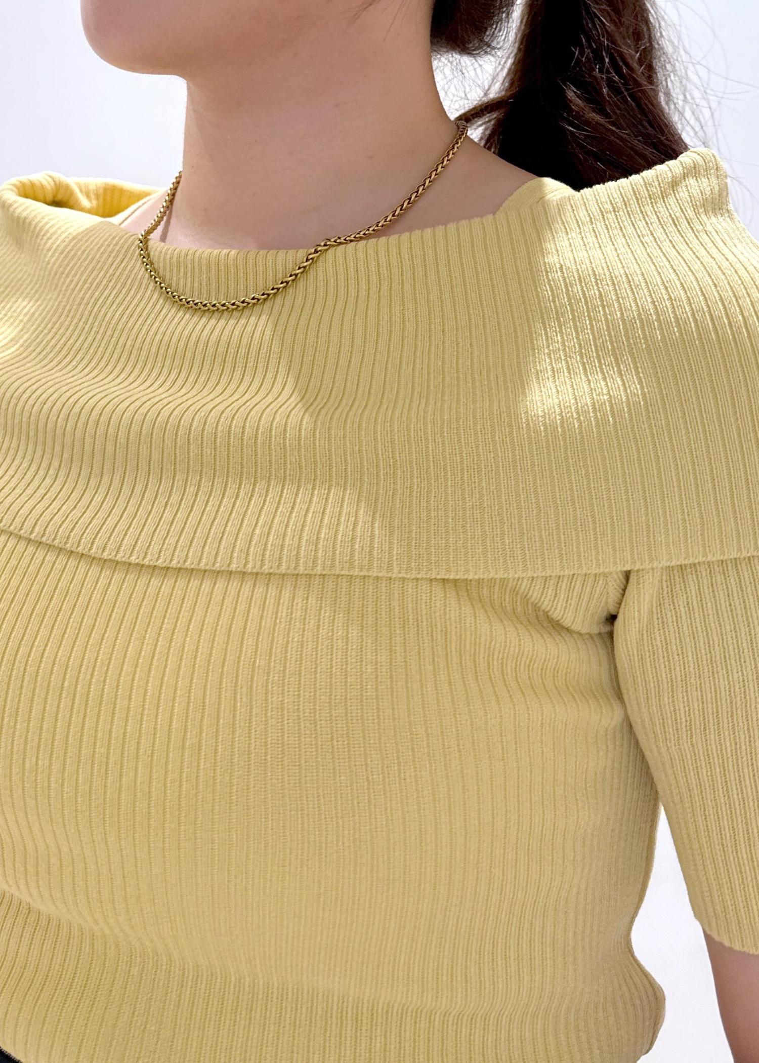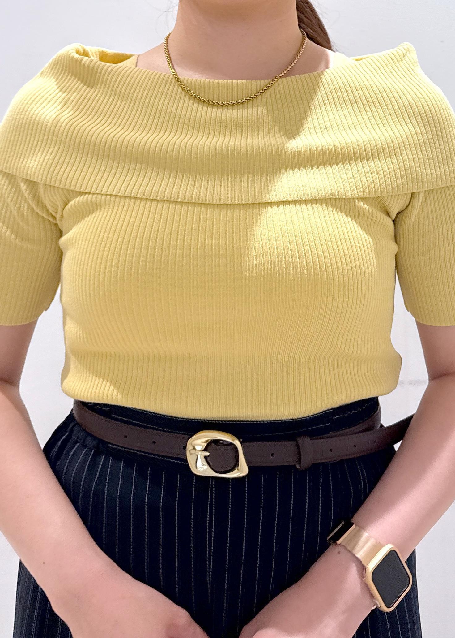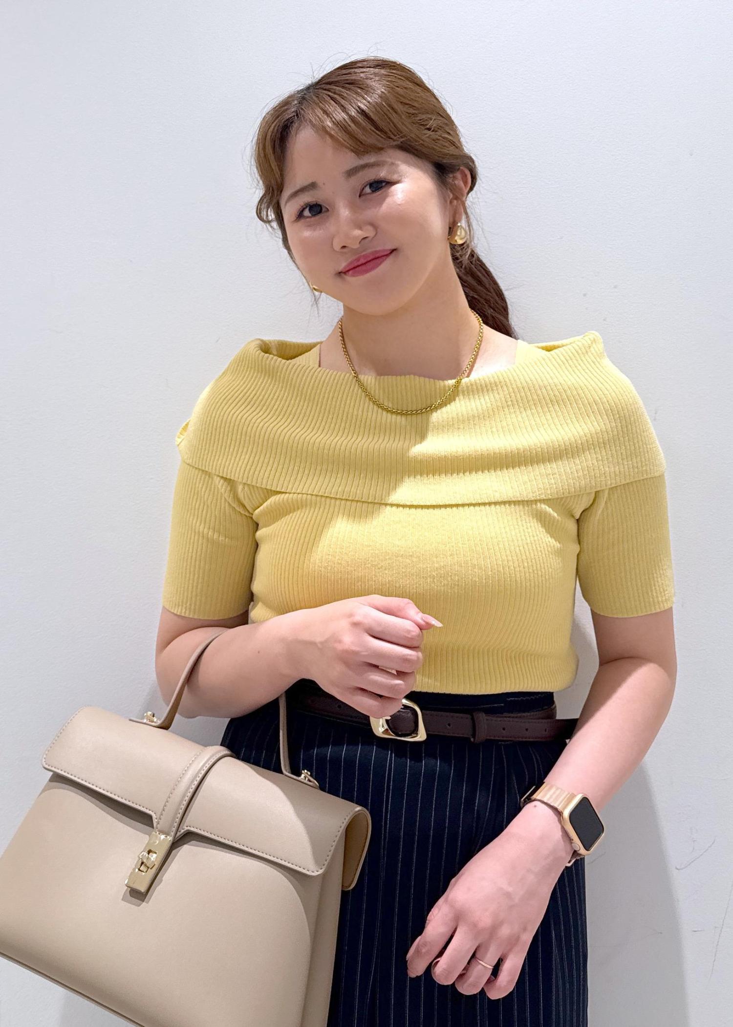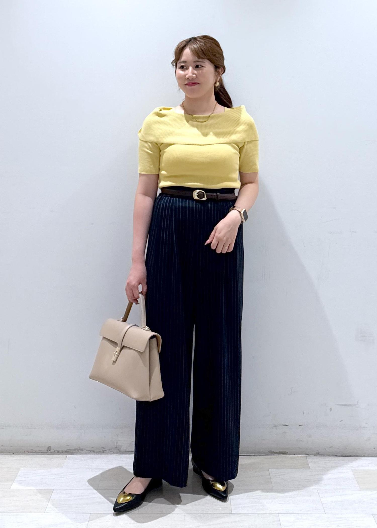 ジャケットの中から新色カラーのイエローのオフショル風トップスがチラッと見えるので、全体的に纏まり感があってオシャレに見えるようにしてます。