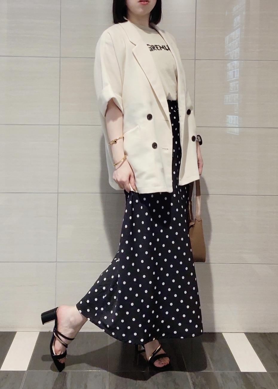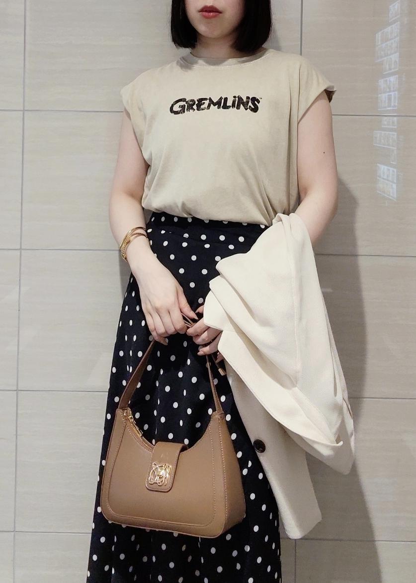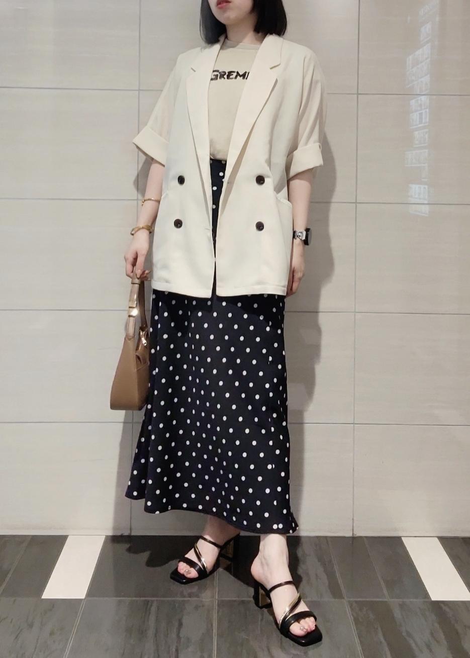 カジュアルなギズモプリントTシャツにドットスカートを合わせてMIXコーデにしました♪ゆったりめのジャケットで体型カバー力◎