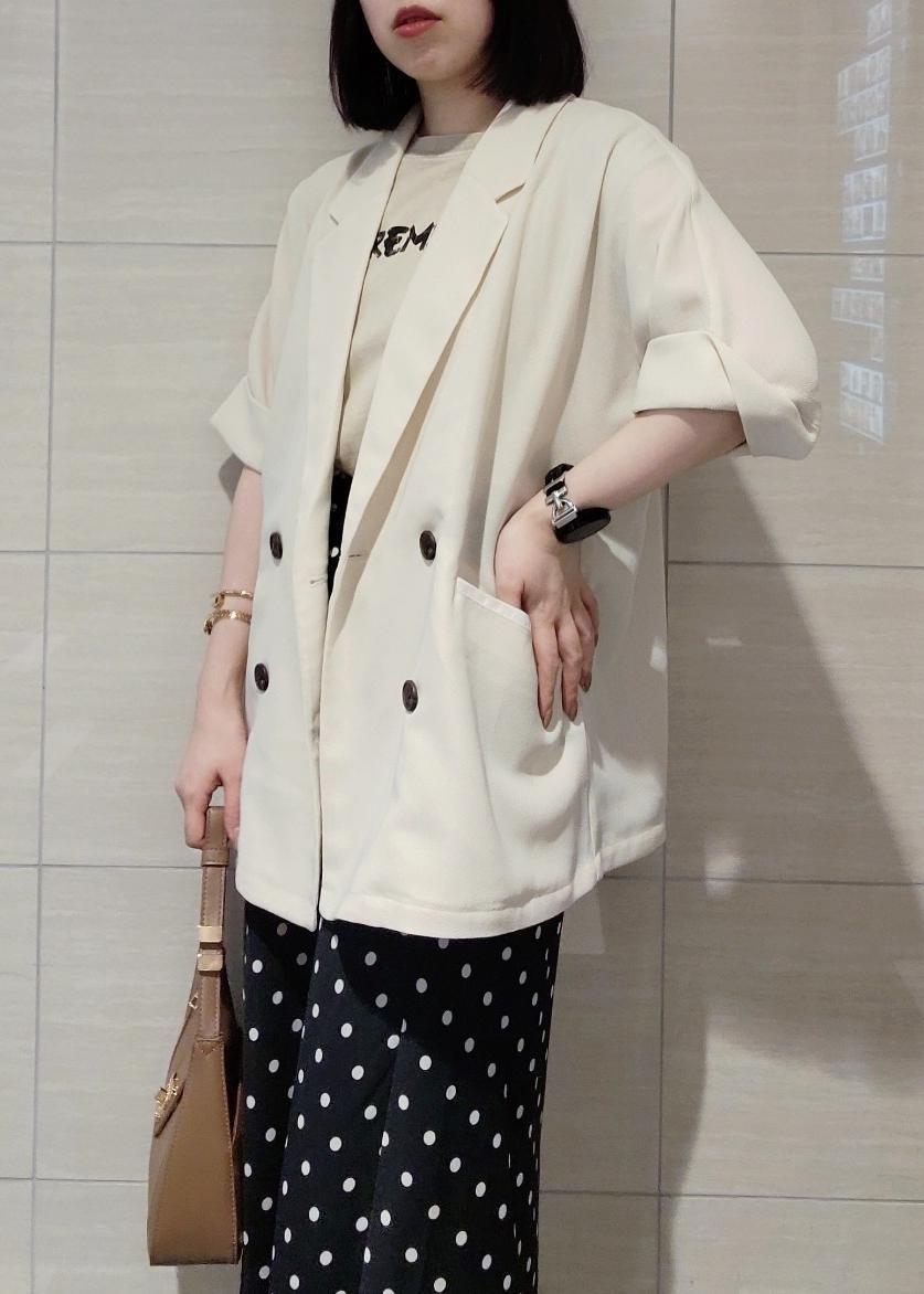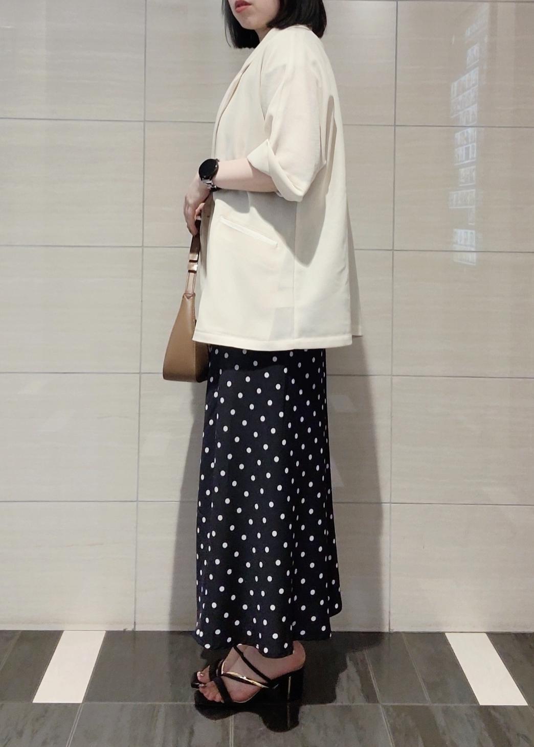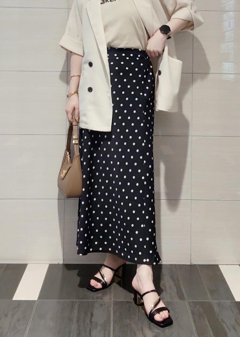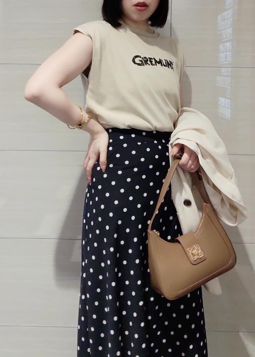 カジュアルなギズモプリントTシャツにドットスカートを合わせてMIXコーデにしました♪ゆったりめのジャケットで体型カバー力◎