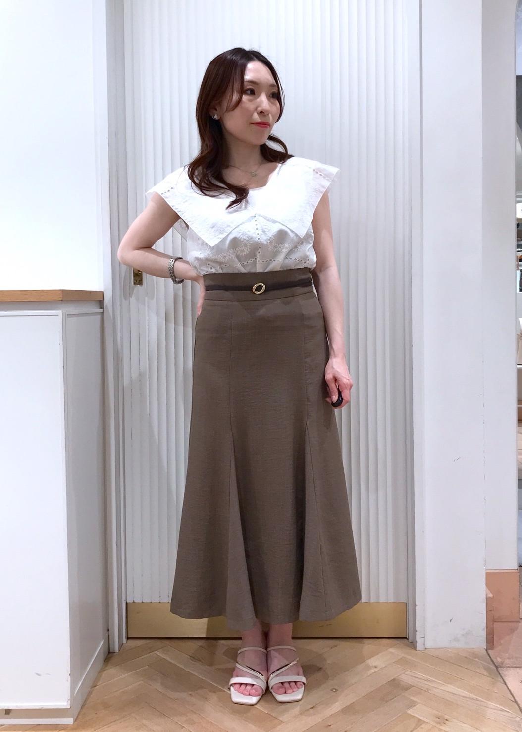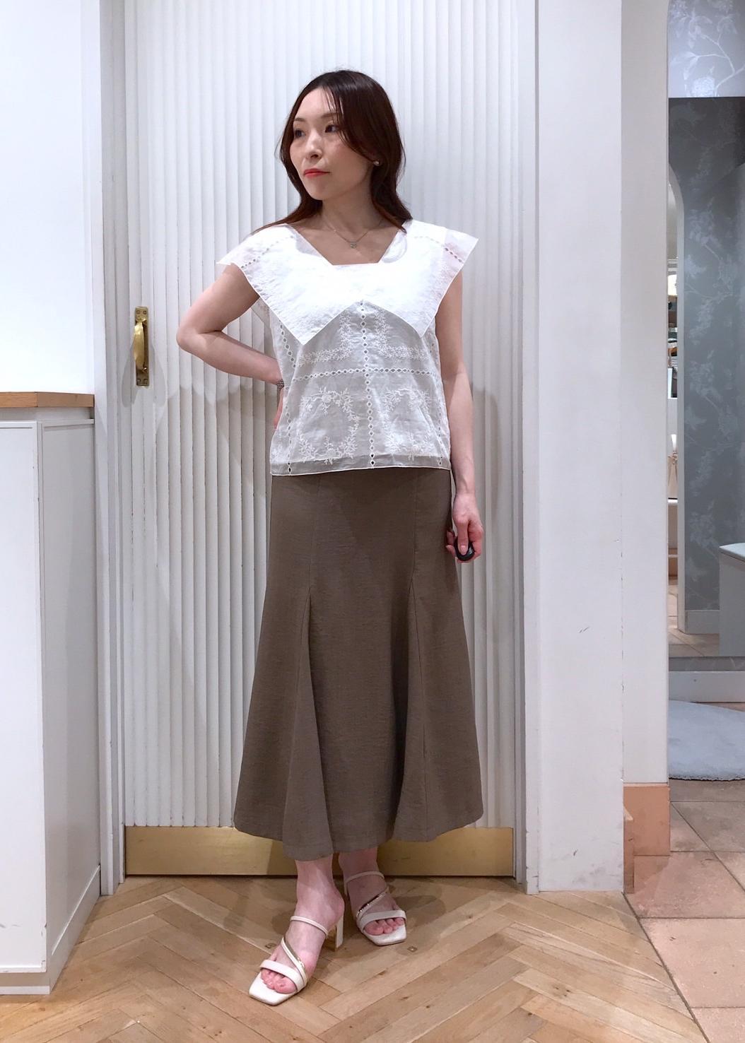 フェミニンな印象のブラウスを白×カーキの配色で涼し気に。