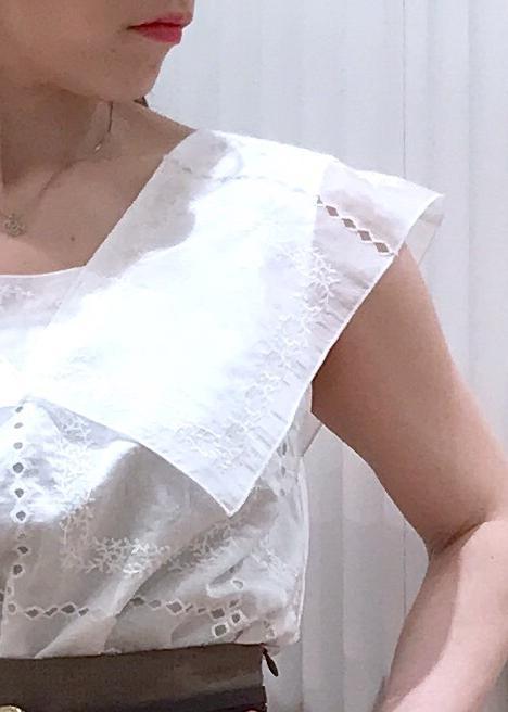 ブラウスは襟が大きめなので肩幅がしっかりした骨格ナチュラルでも目立ちにくく、女性らしく着られますよ。