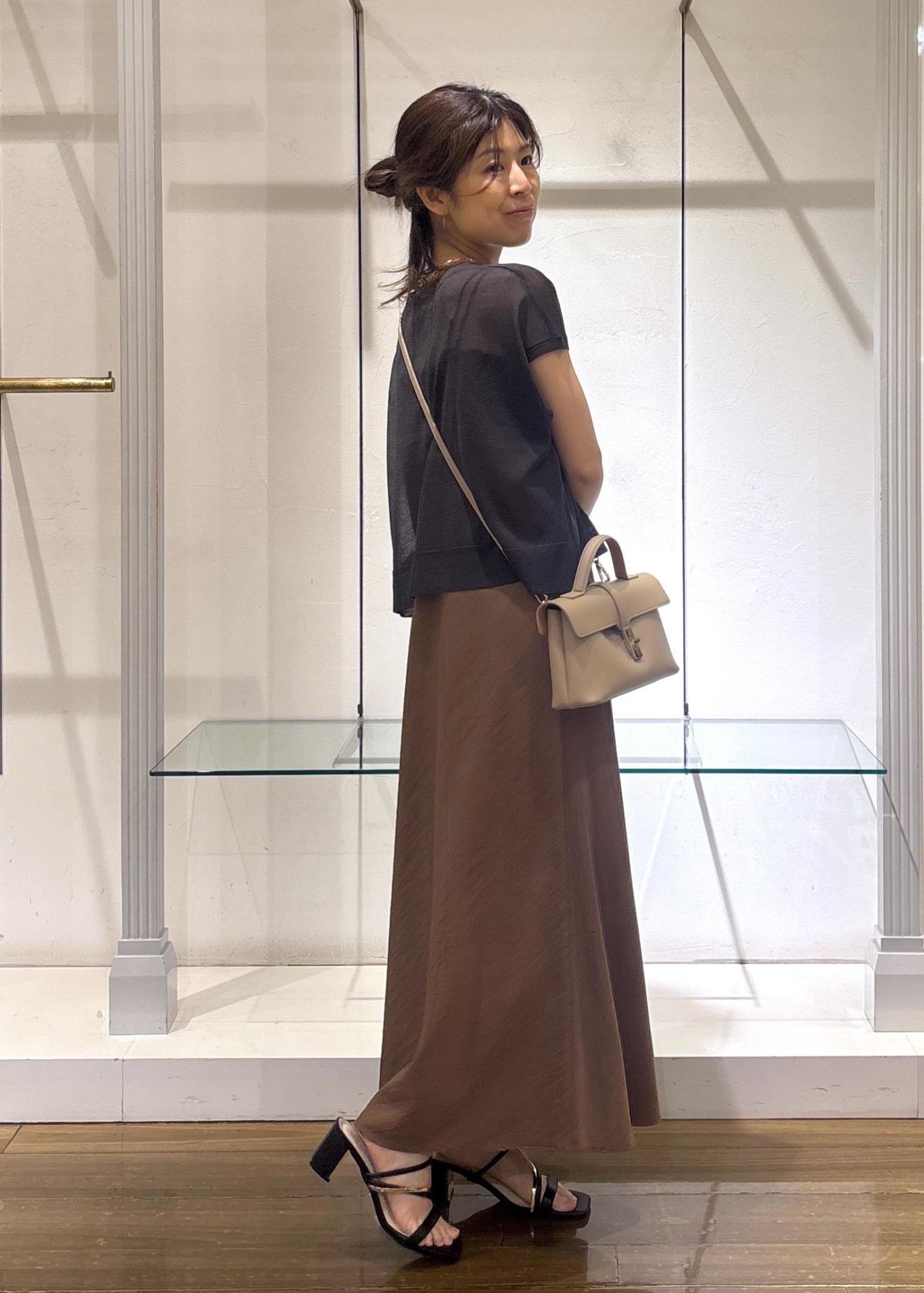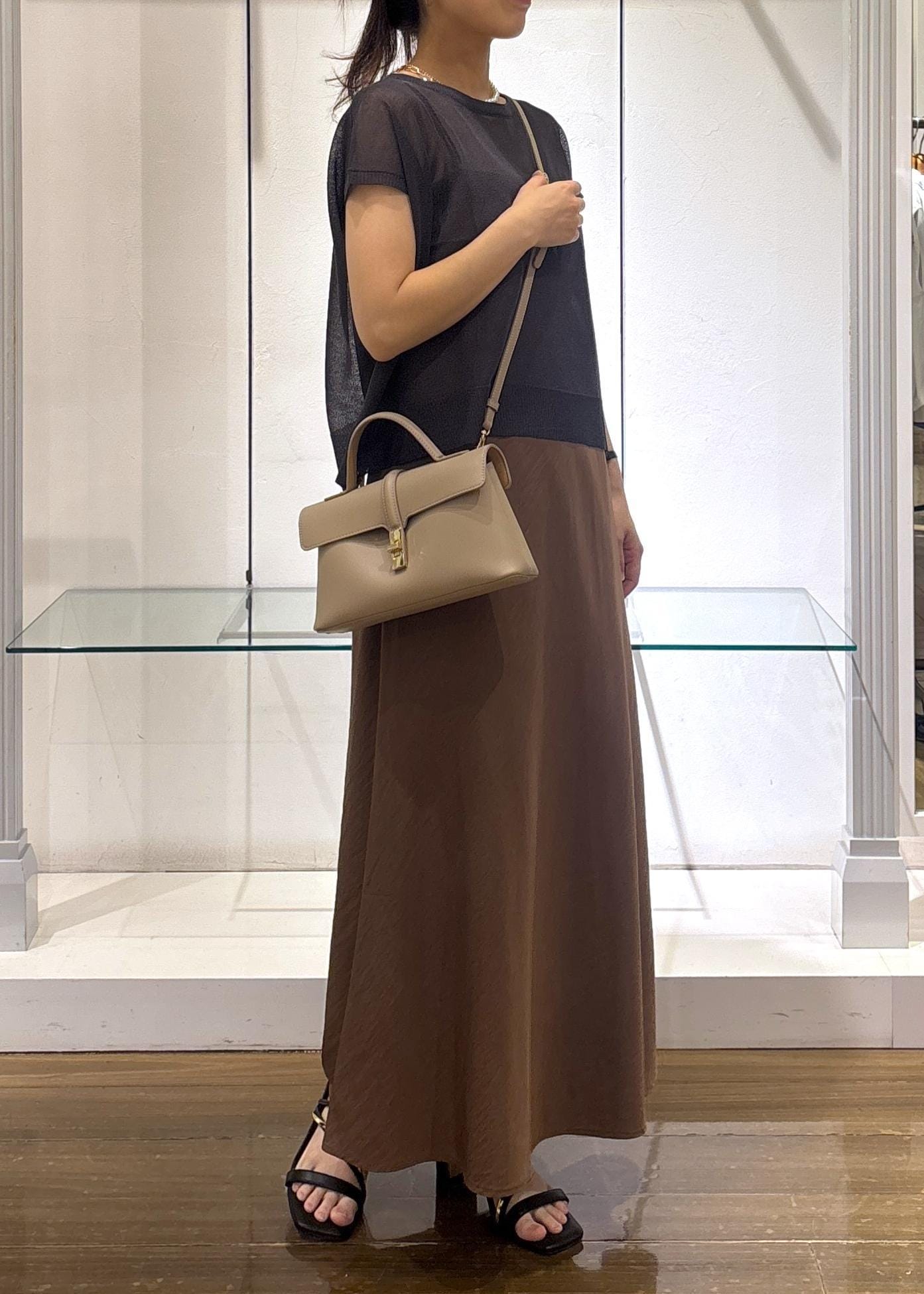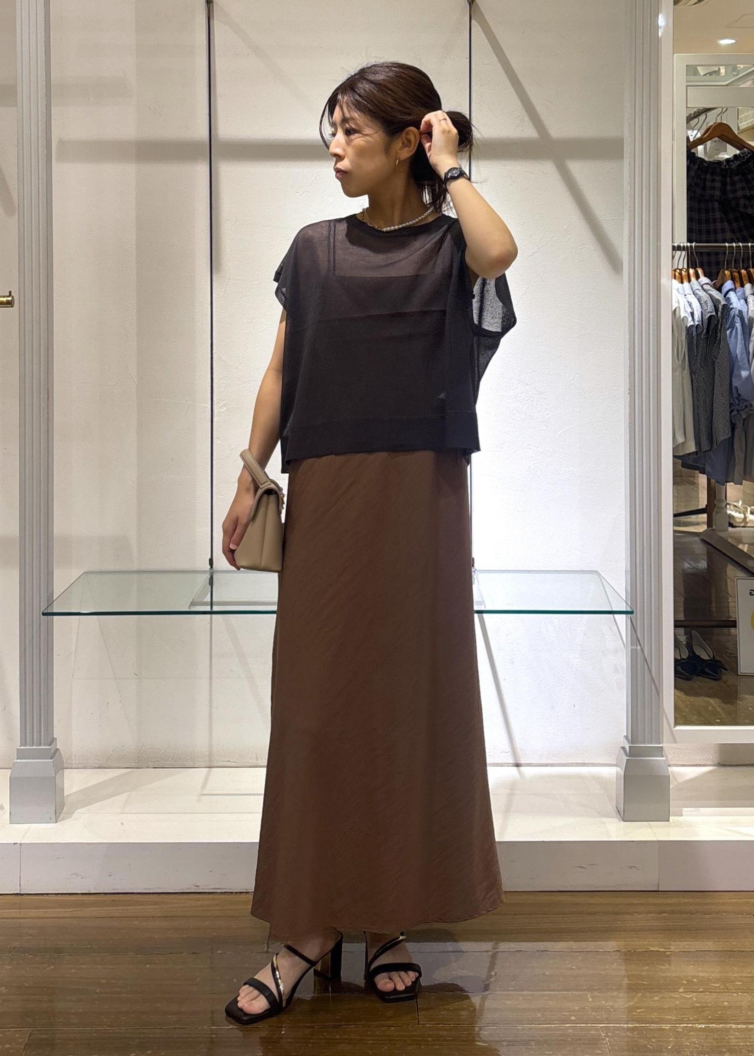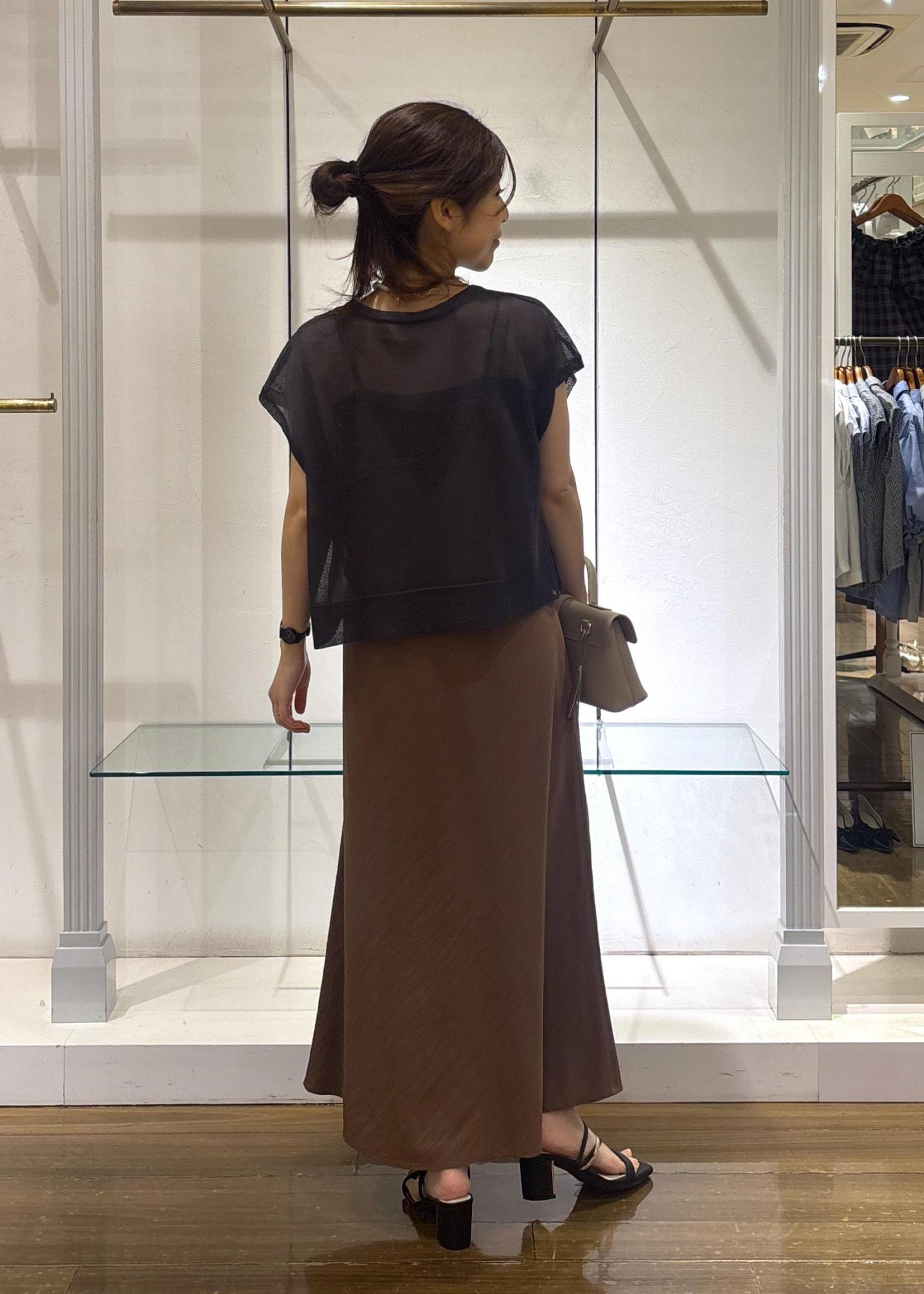 156cm/F着用。着丈は足首がぎりぎり見えるくらいの丈。身幅は少しすっきりめですがラインは拾わず、光沢感ととろみのある素材なので大人っぽく着られます◎シンプルなのでプリントTシャツやパンツを重ねたりレイヤードスタイルが楽しめますよ♪