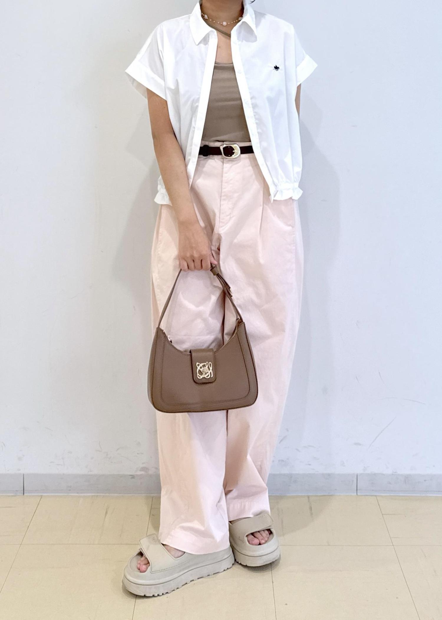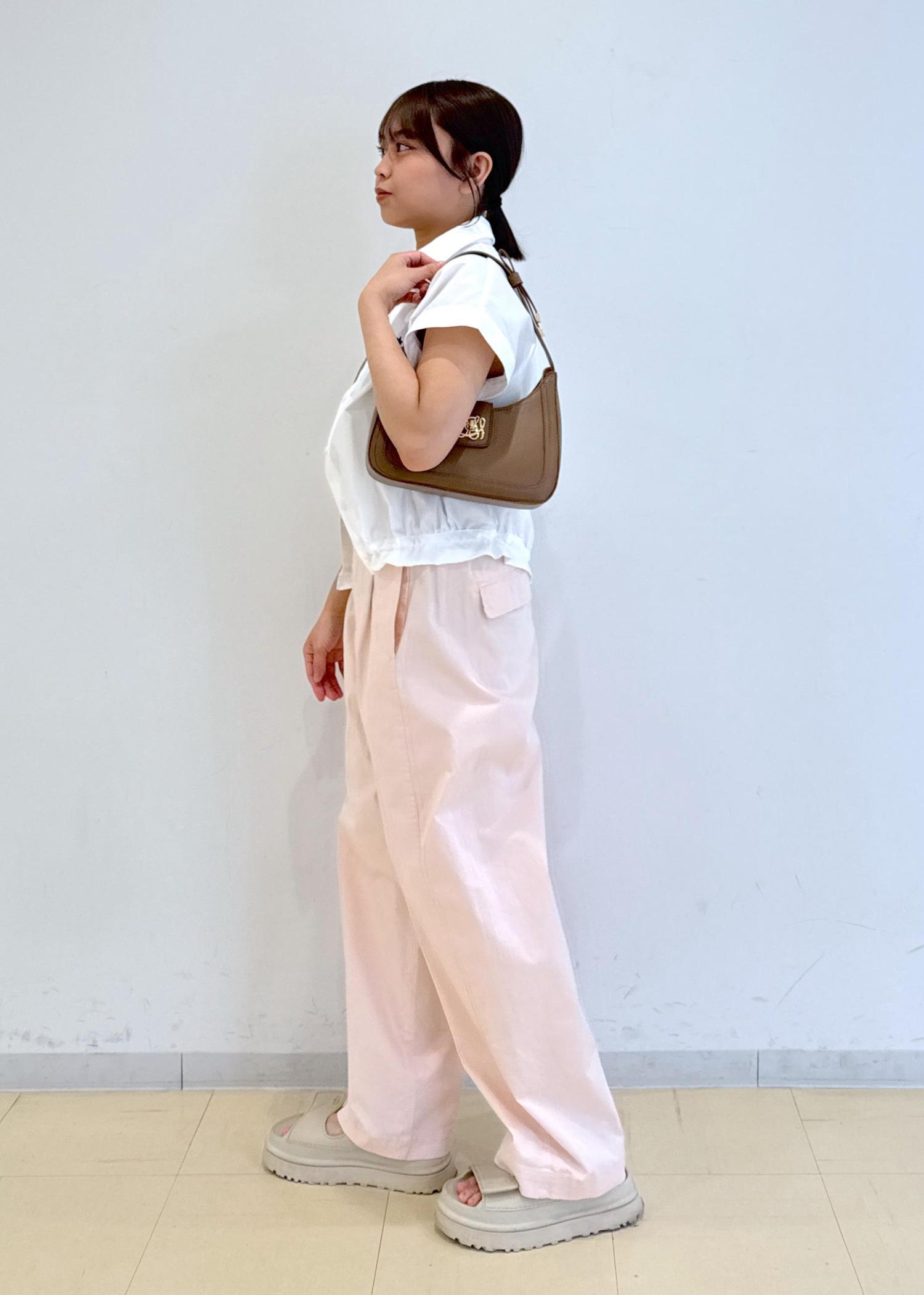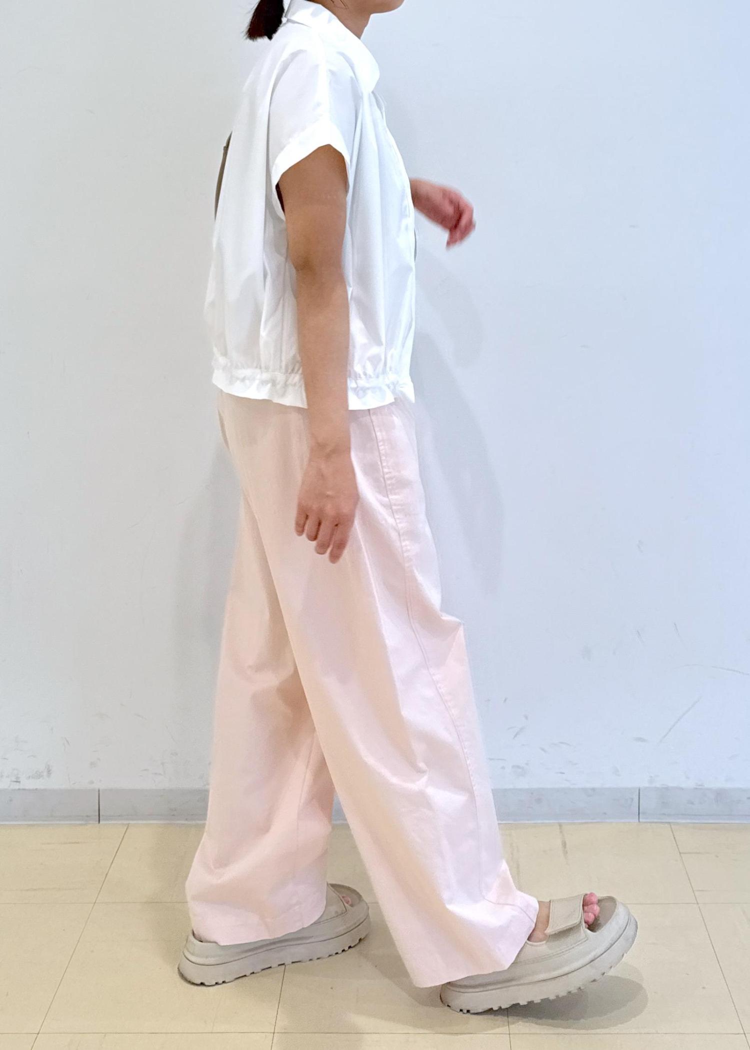 ピンクのパンツに白のシャツを合わせた柔らかいカラーのコーディネートにしました!