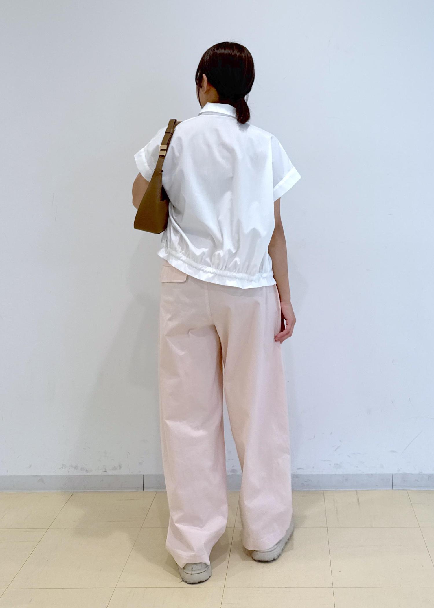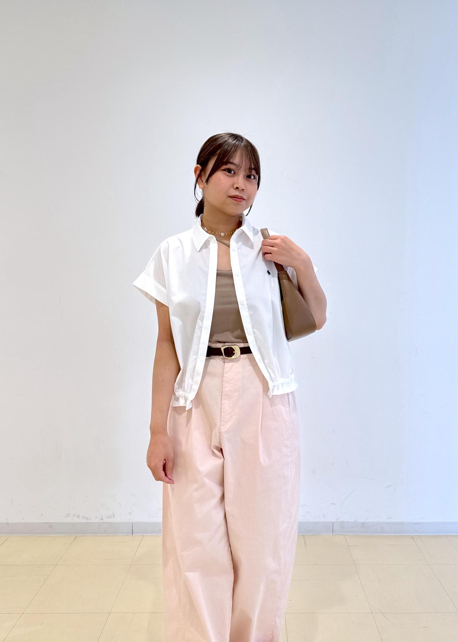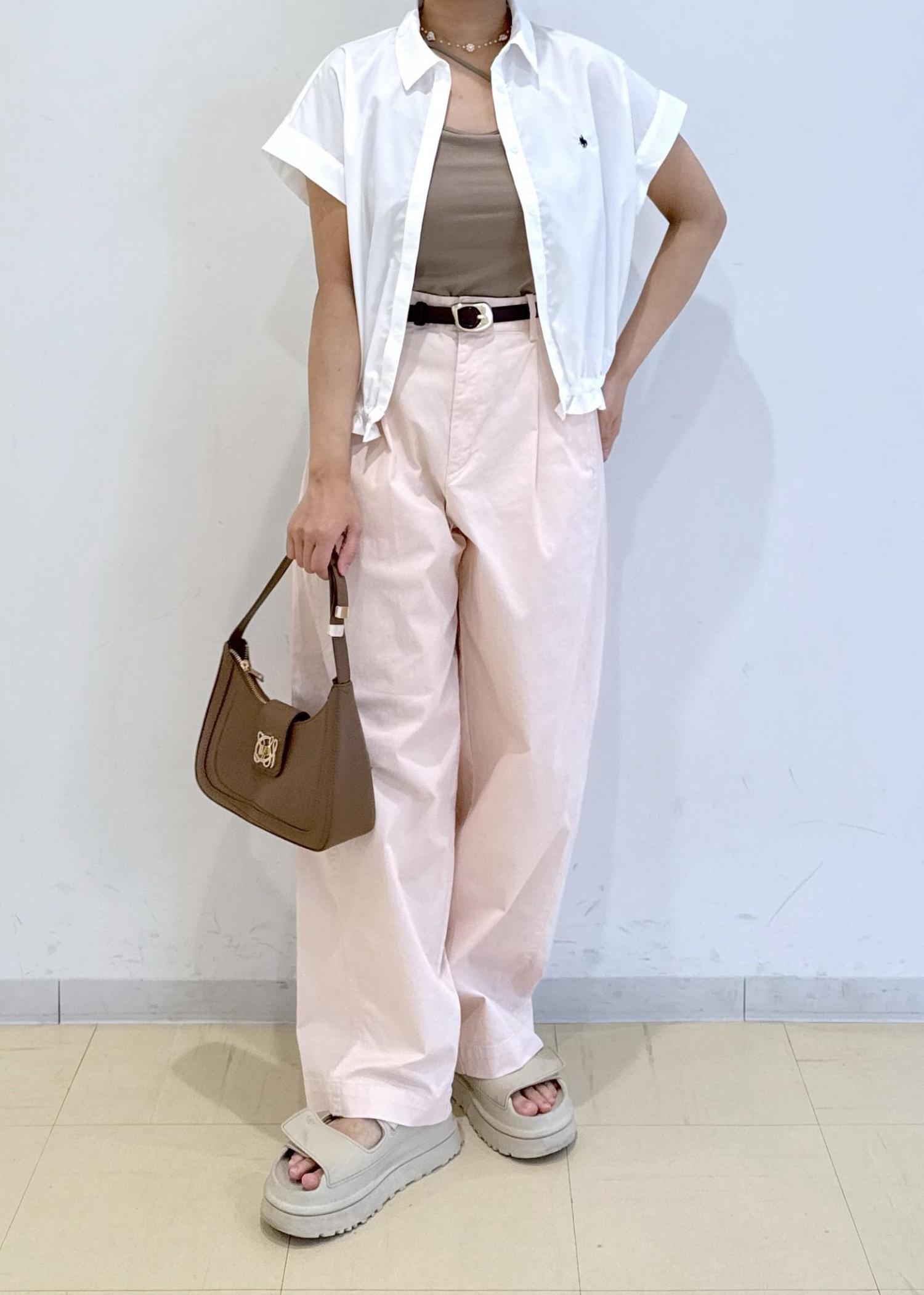 ピンクのパンツに白のシャツを合わせた柔らかいカラーのコーディネートにしました!
