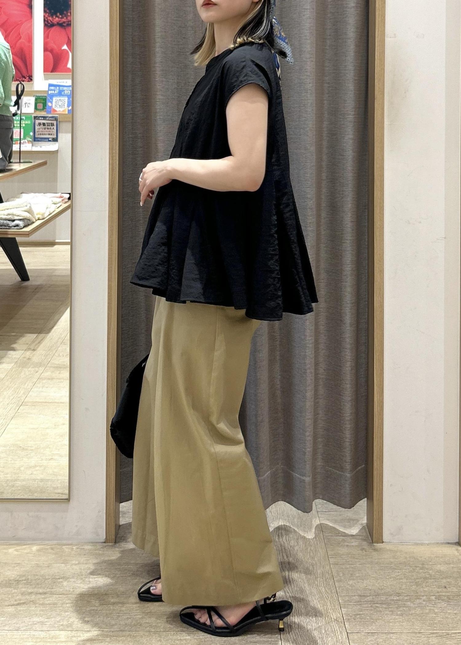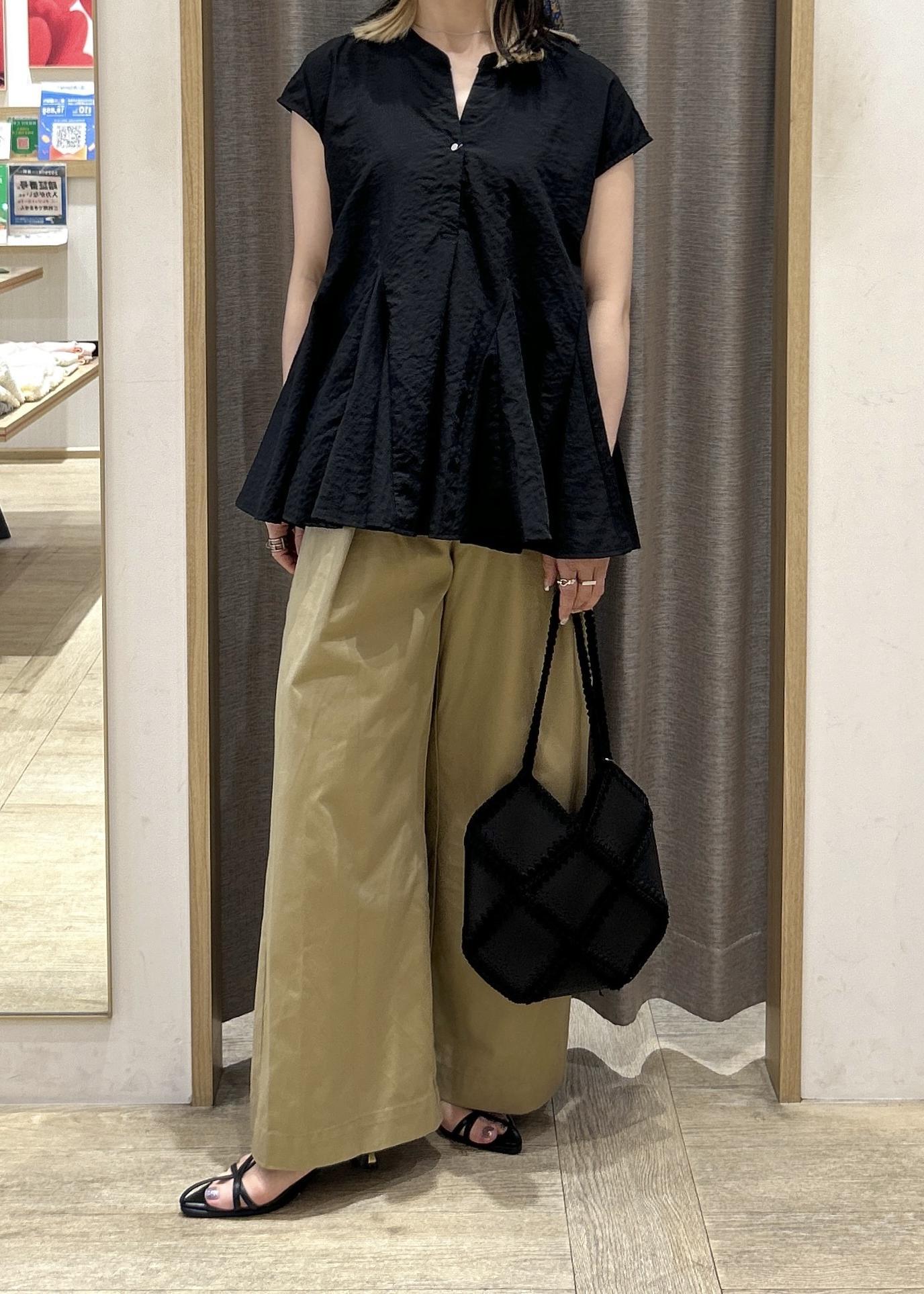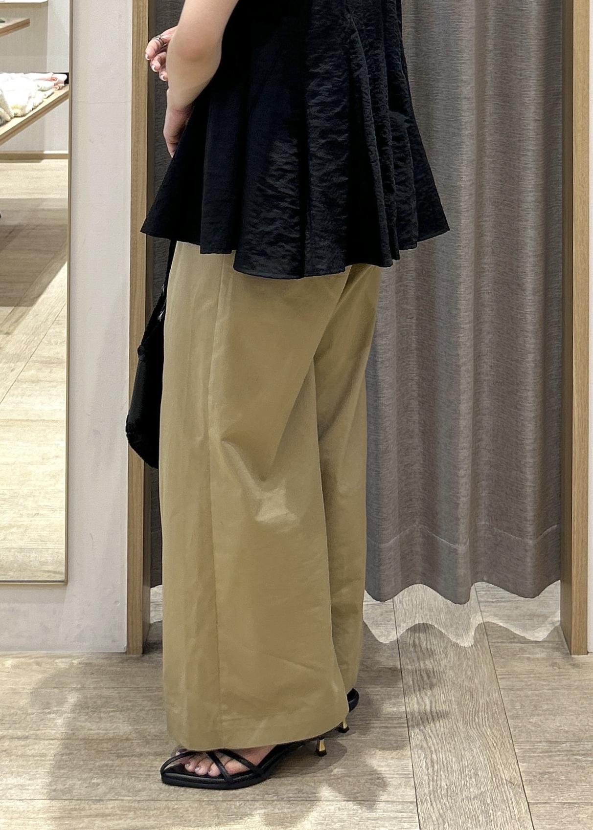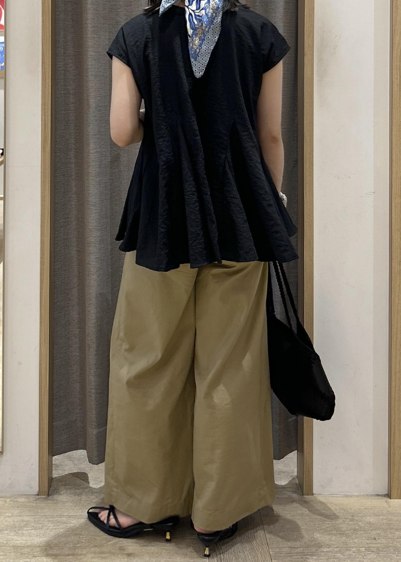 ブラウスもチノパンも裾にかけてボリュームがありますが、スキッパー+フレンチスリーブでスッキリ見えるので重たい印象にならず合わせられます◎