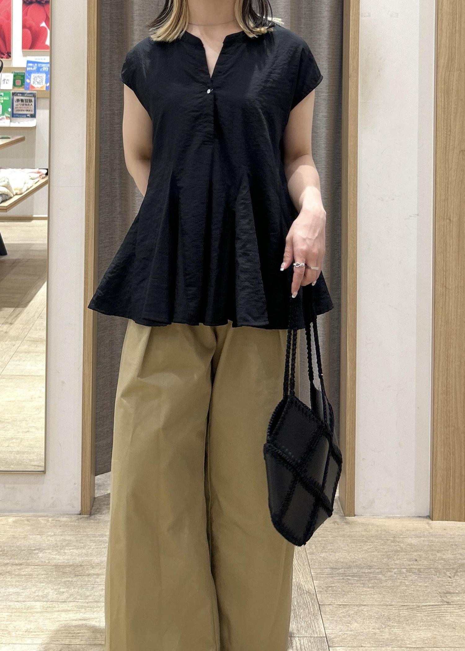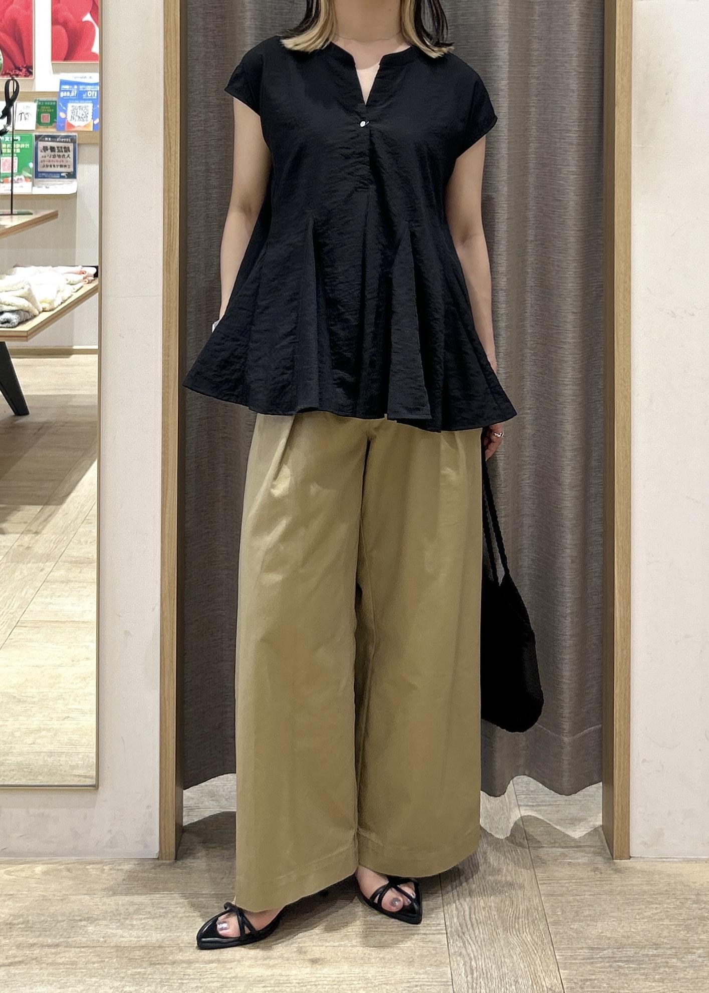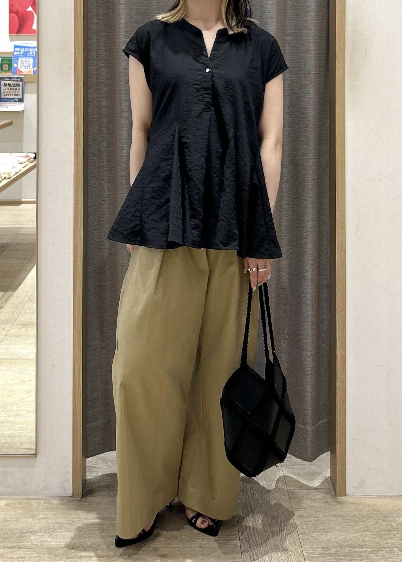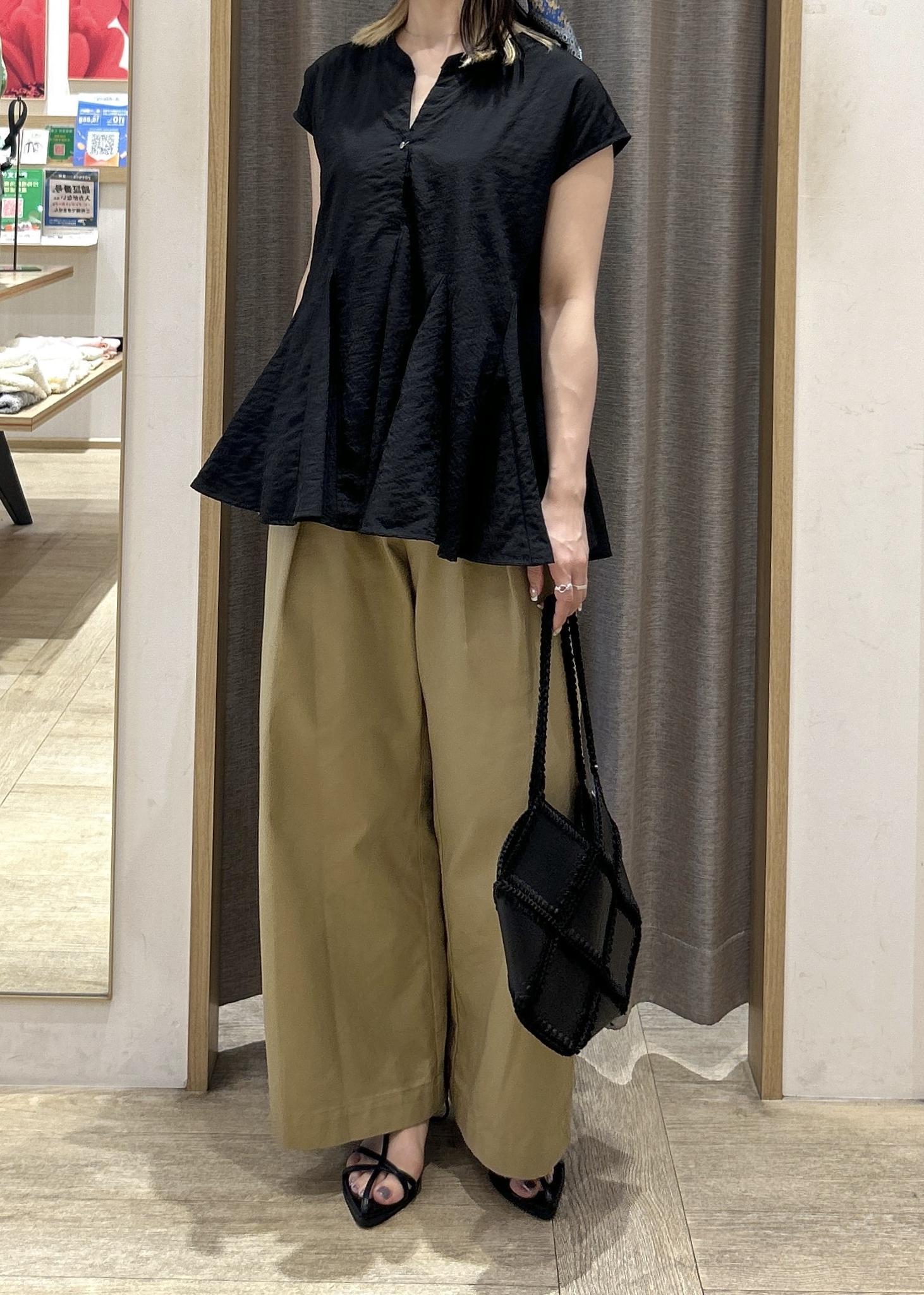 ブラウスもチノパンも裾にかけてボリュームがありますが、スキッパー+フレンチスリーブでスッキリ見えるので重たい印象にならず合わせられます◎