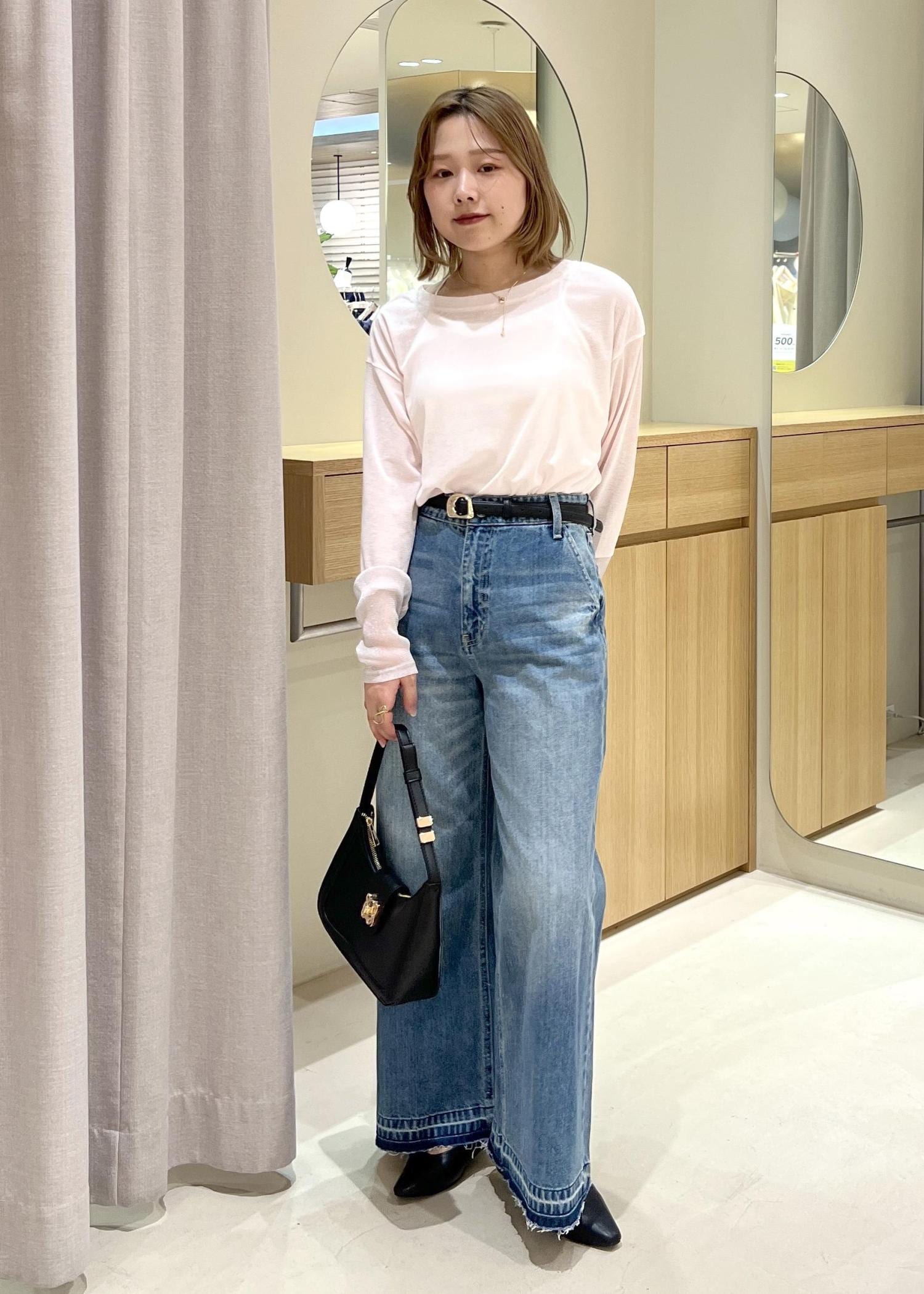ウエスト位置はハイウエストすぎず、窮屈感はありません。身長165cmでMサイズを着用。フラットなシューズをはいても床につかないくらいになりました。 -