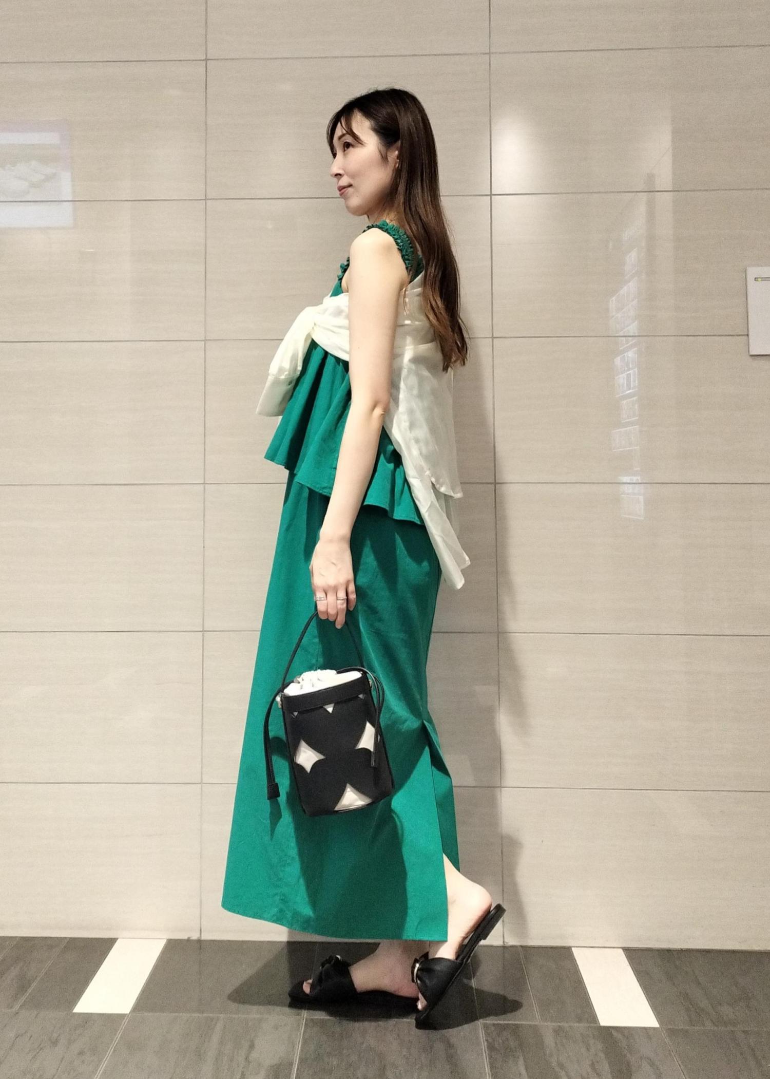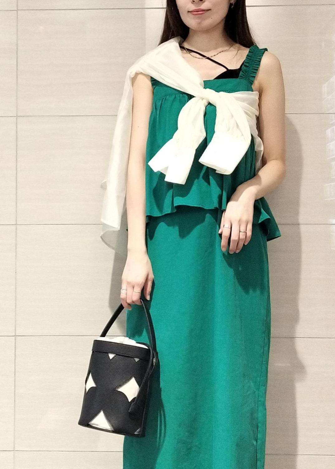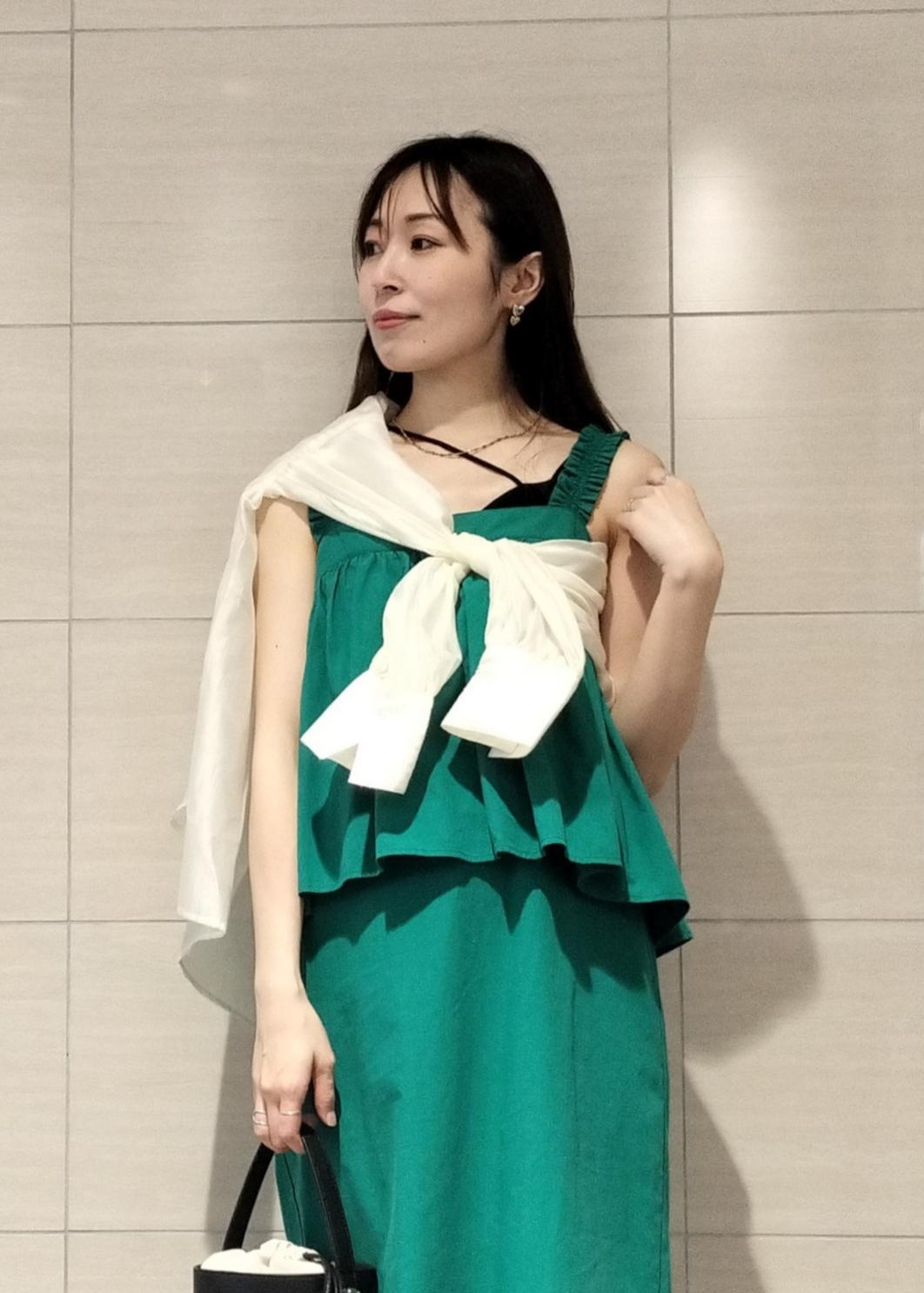 グリーンが映えるワンピースはレイヤード風になっていて涼しげな素材感が夏のリゾートスタイルにもマッチします♪