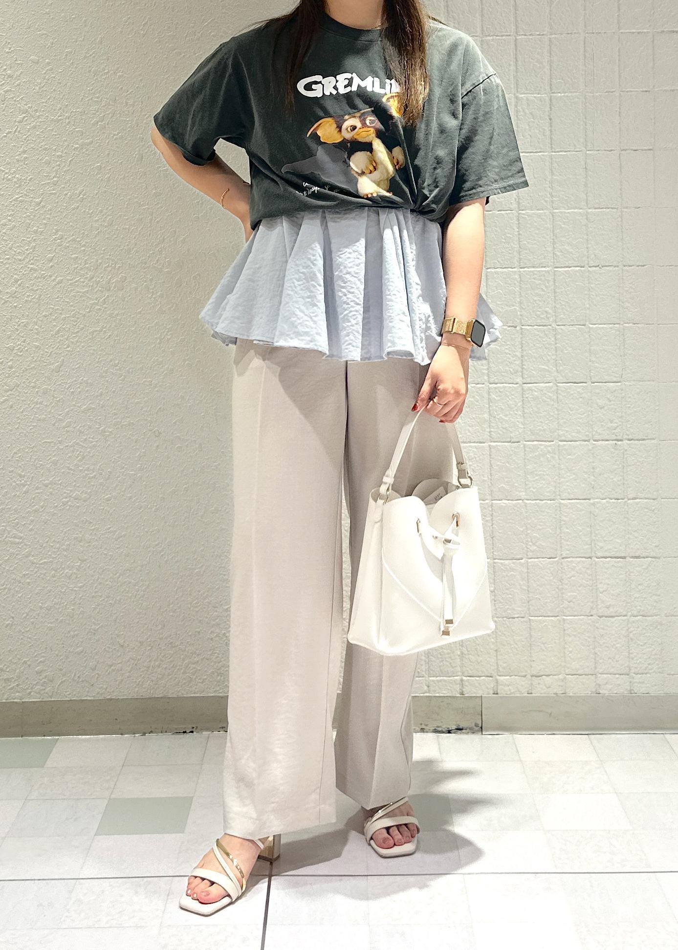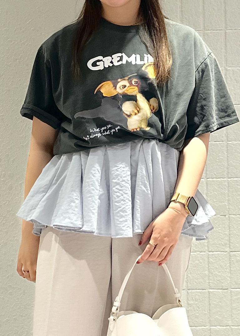 グレムリンコラボのギズモのプリントが入ったビッグTのコーディネート。あえてペプラム型のブラウスと合わせることでメリハリのあるシルエットにしました!