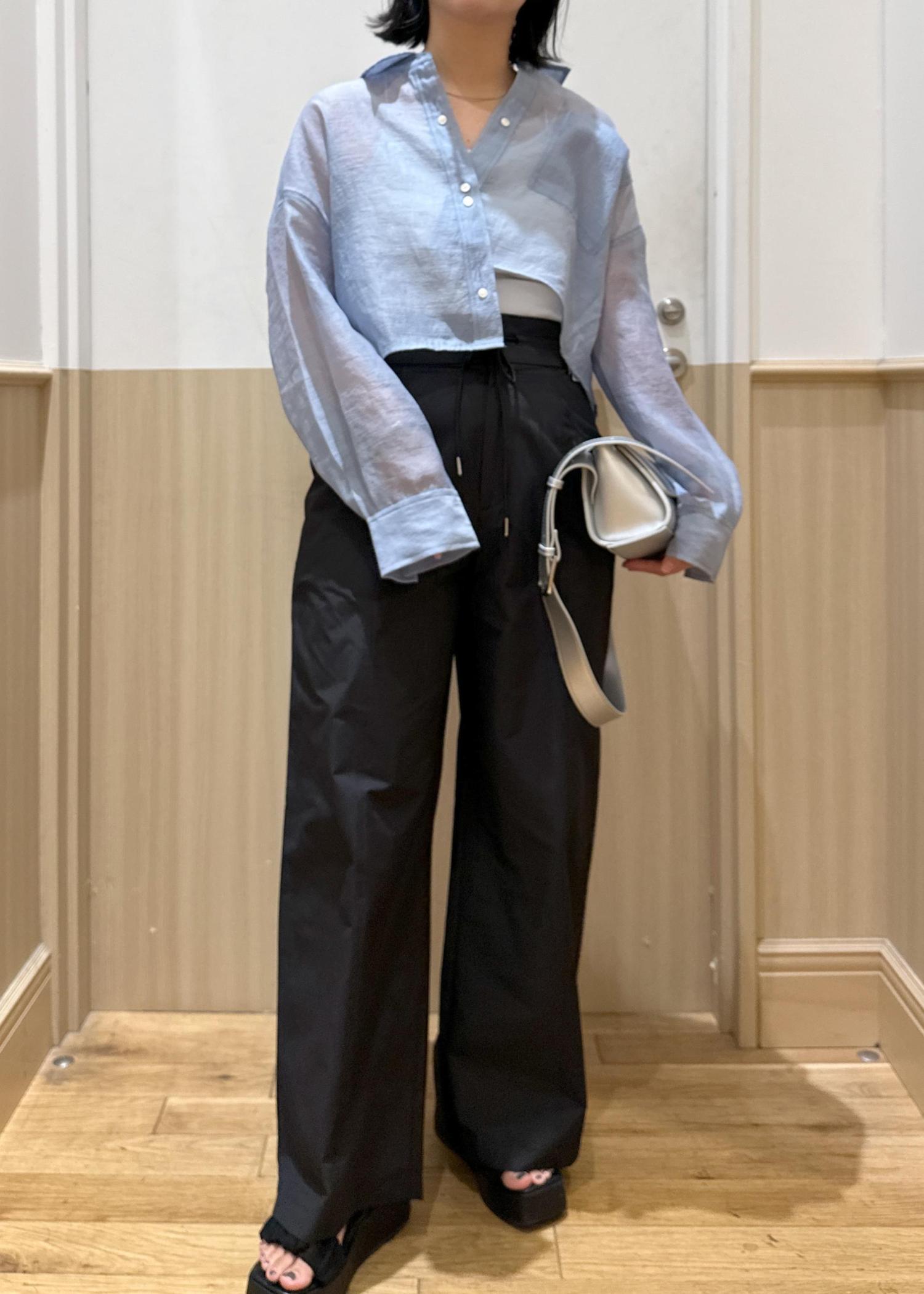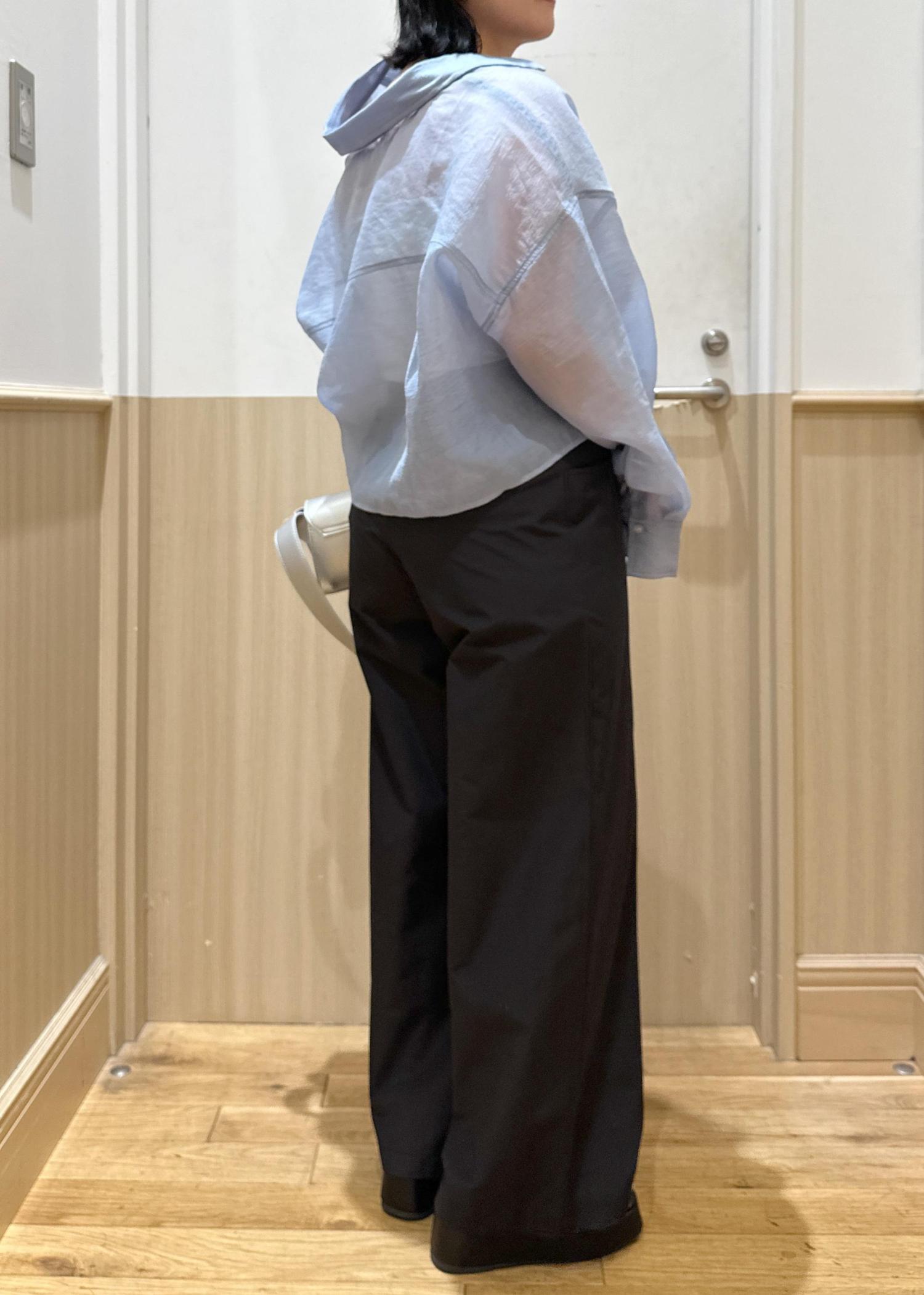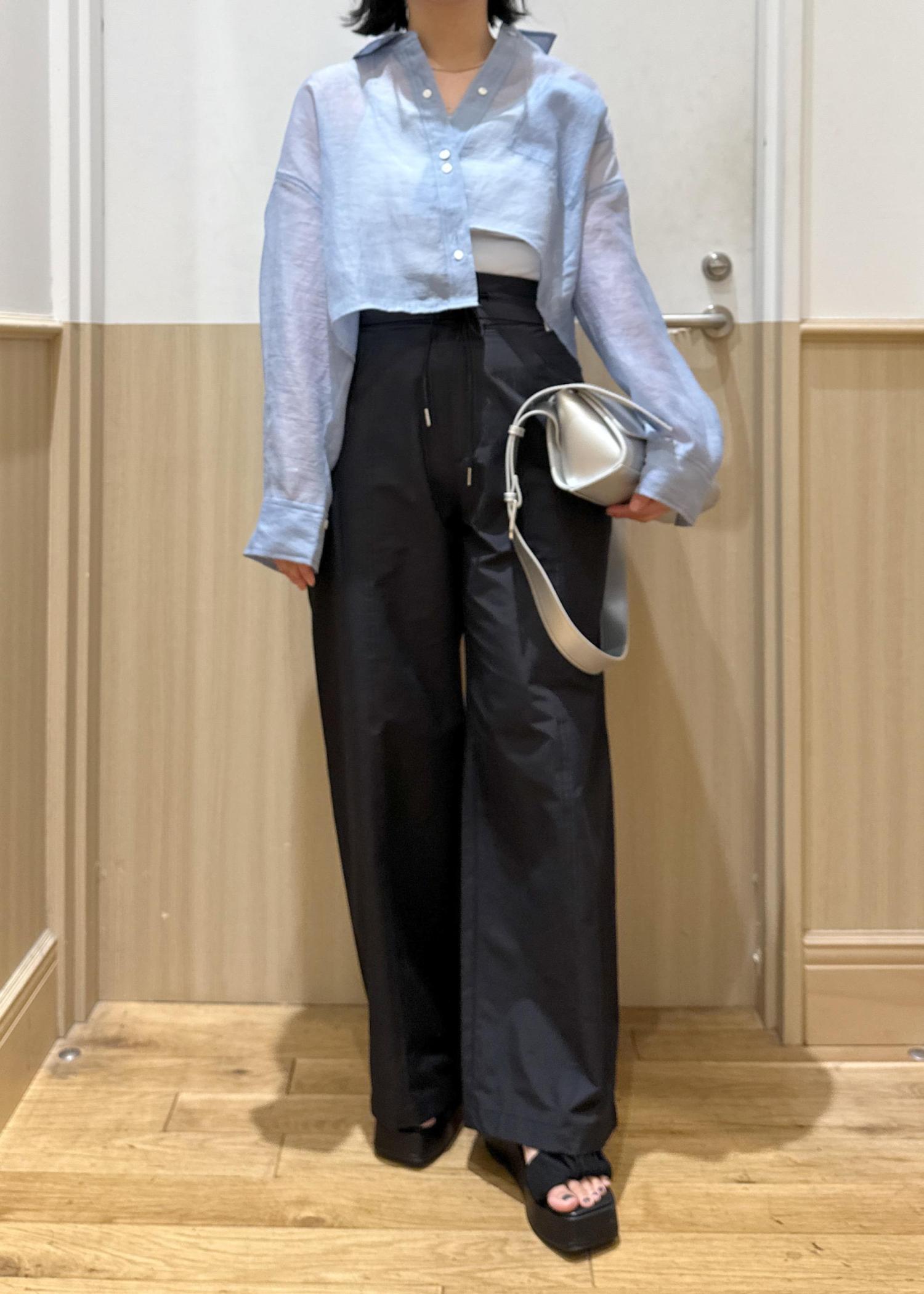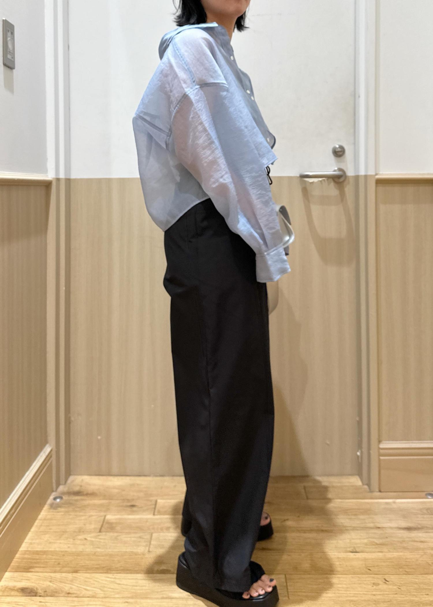 ウエストは見えないくらいです。素材はシャリっとしていてシワになりにくそうで、ベタつかない素材感です!