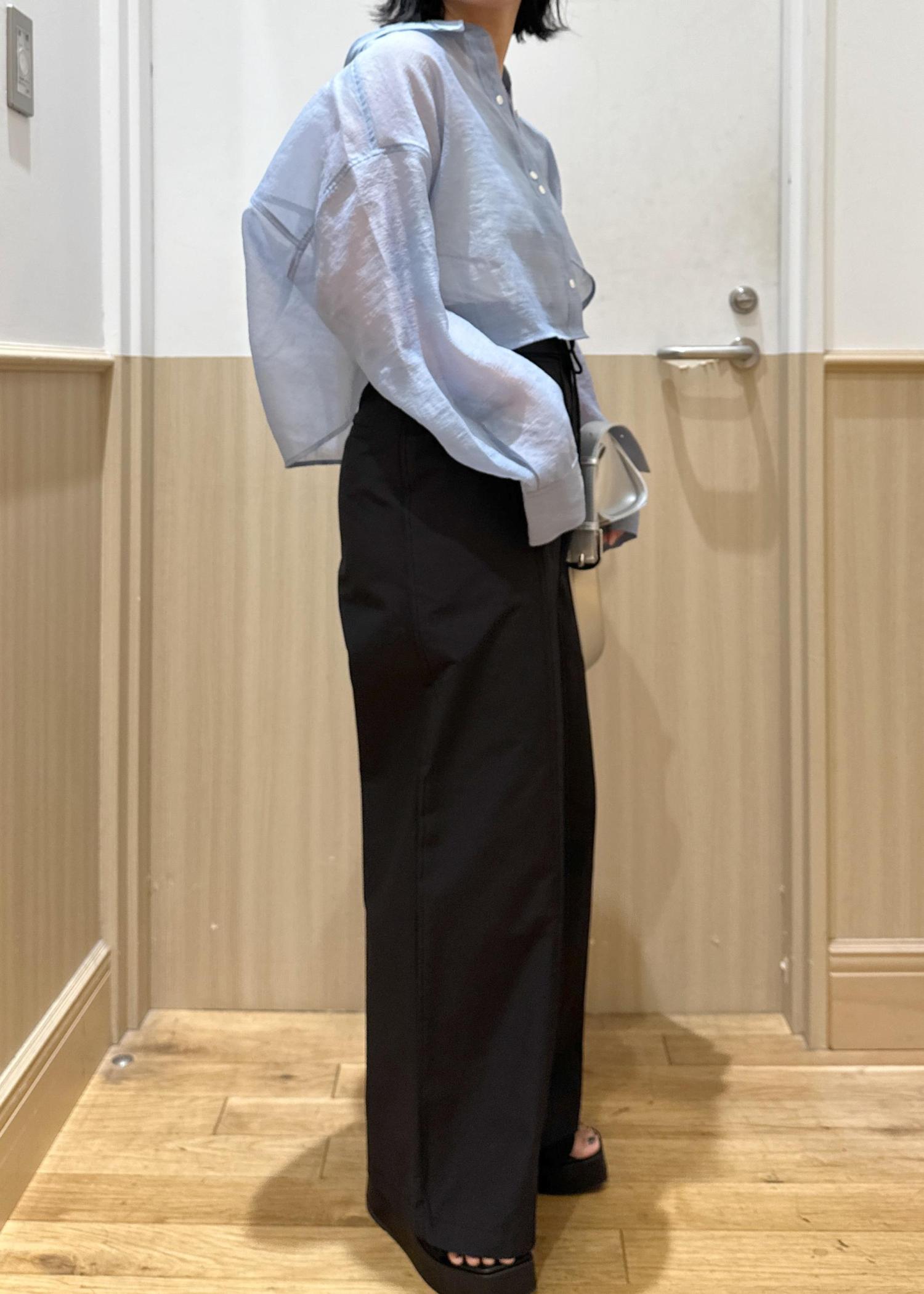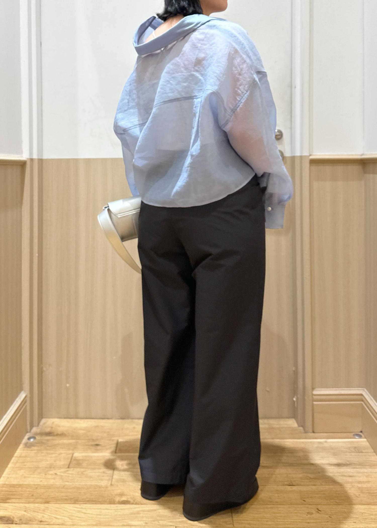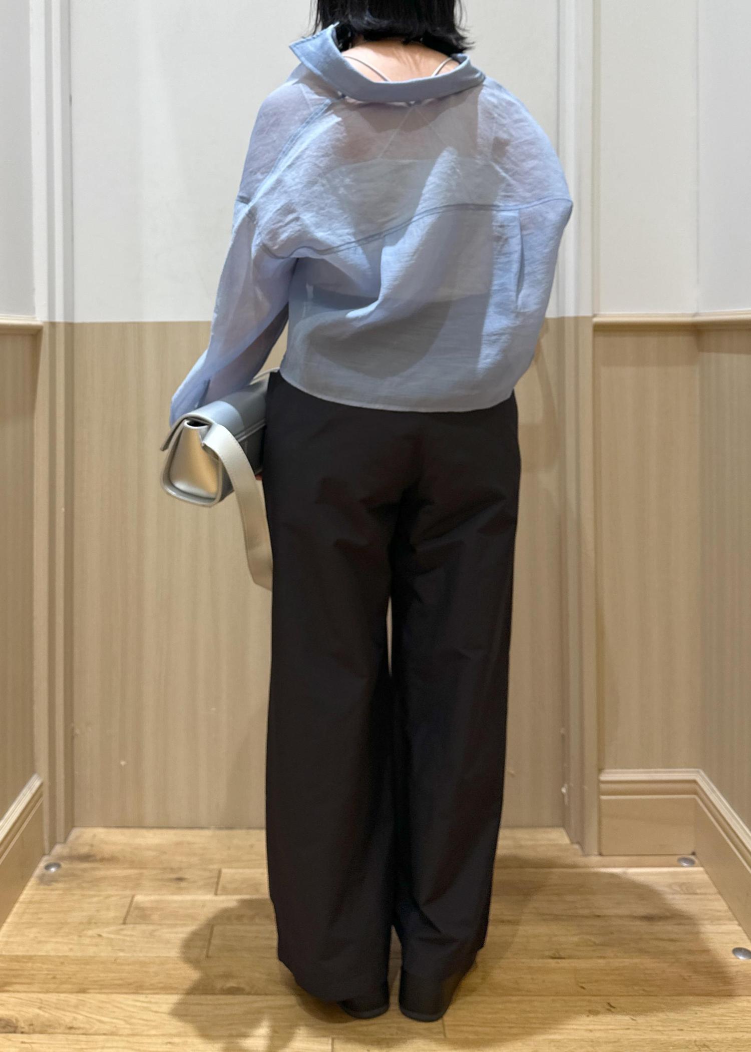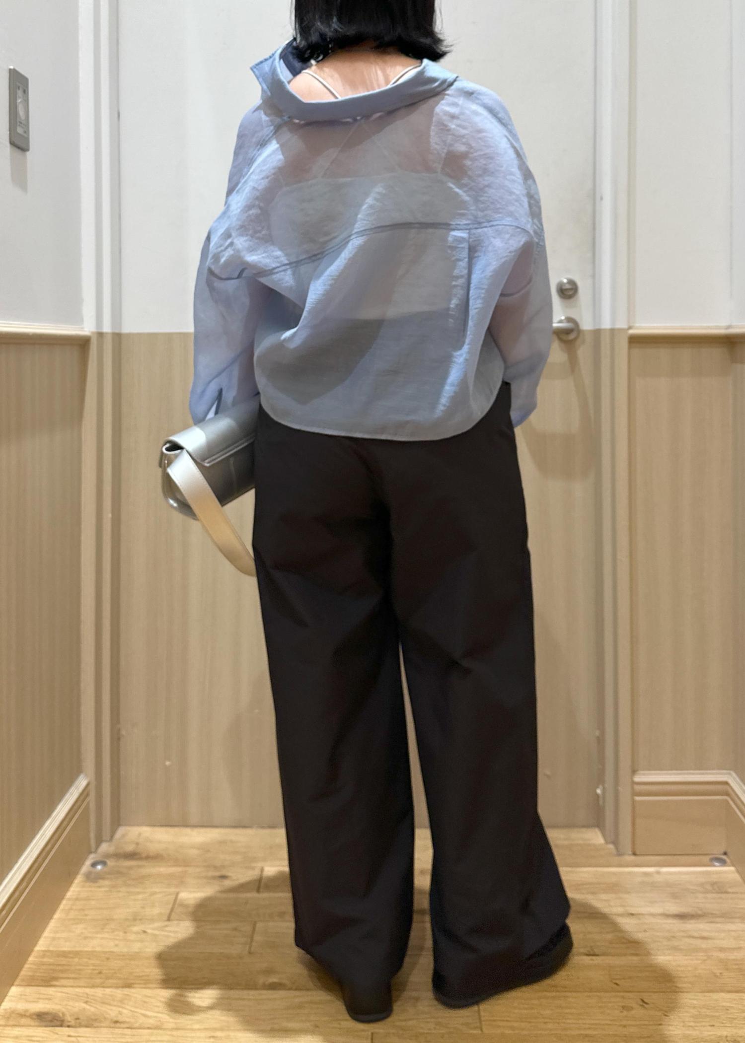 ウエストは見えないくらいです。素材はシャリっとしていてシワになりにくそうで、ベタつかない素材感です!