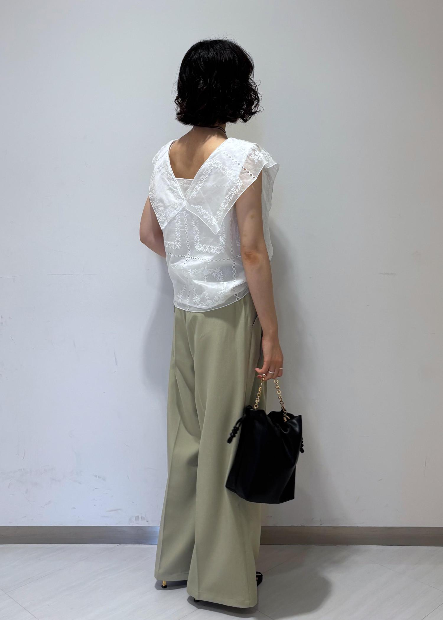 カラーパンツとデザイン性のあるブラウスとの組み合わせがとても華やかな印象◎