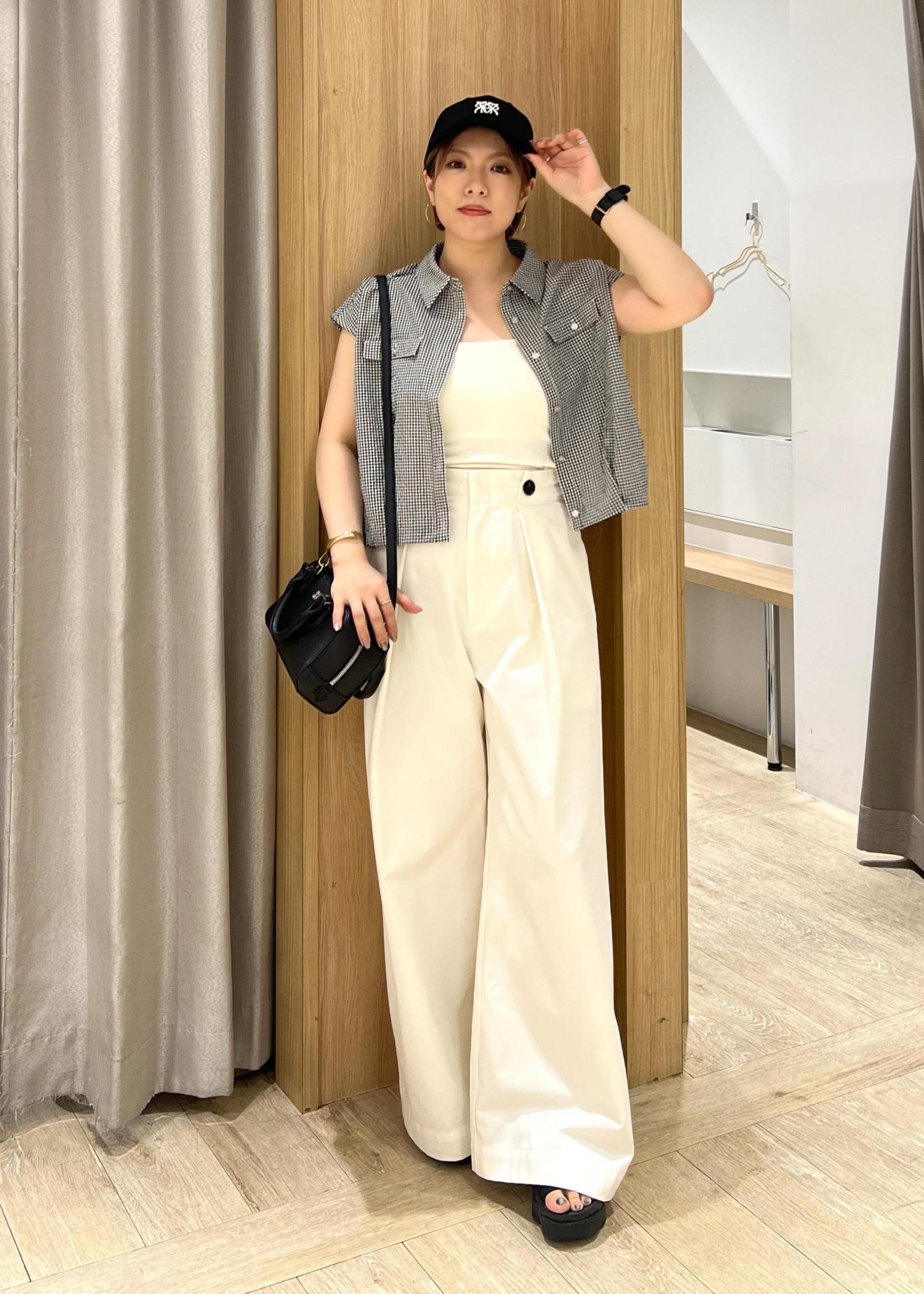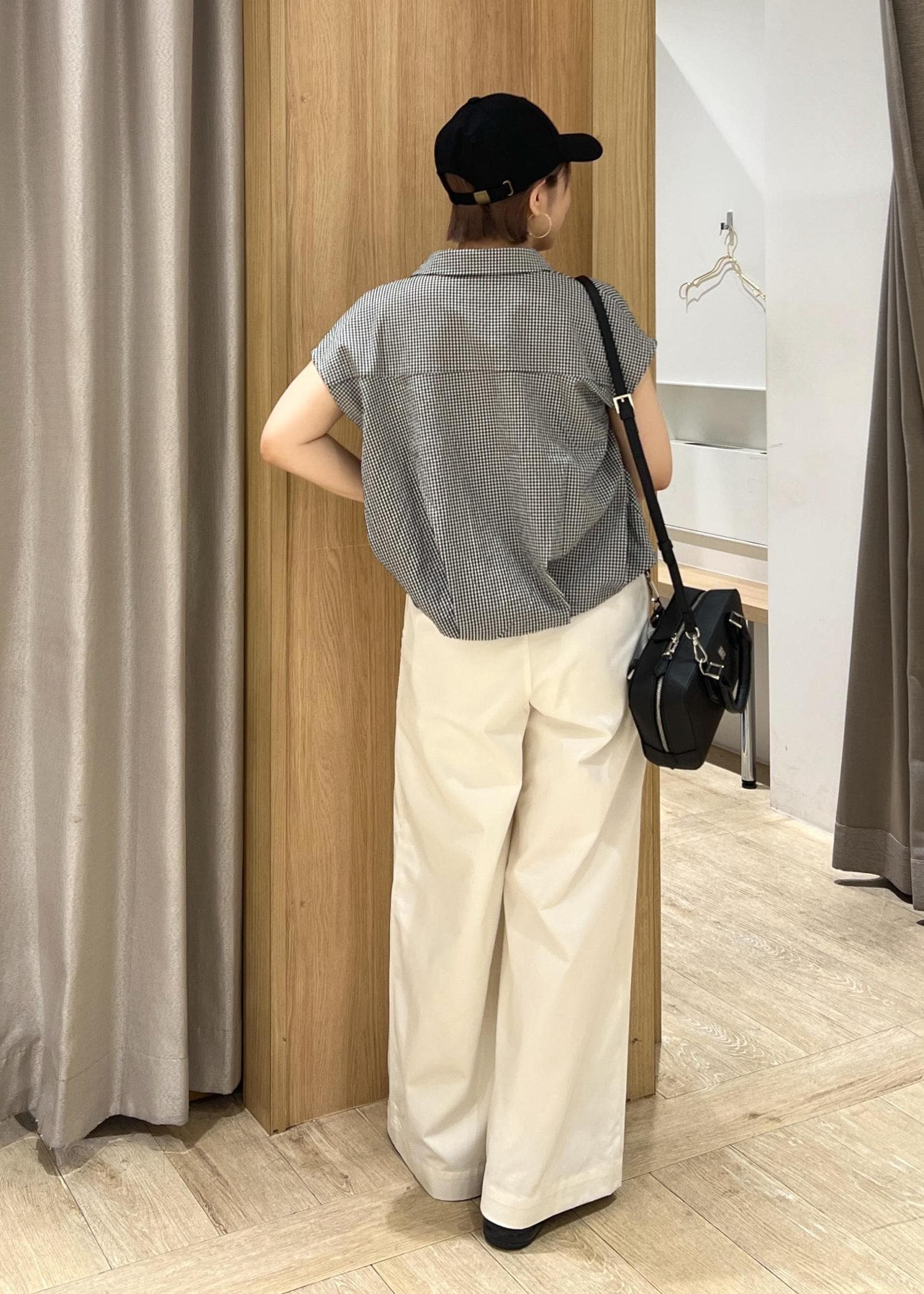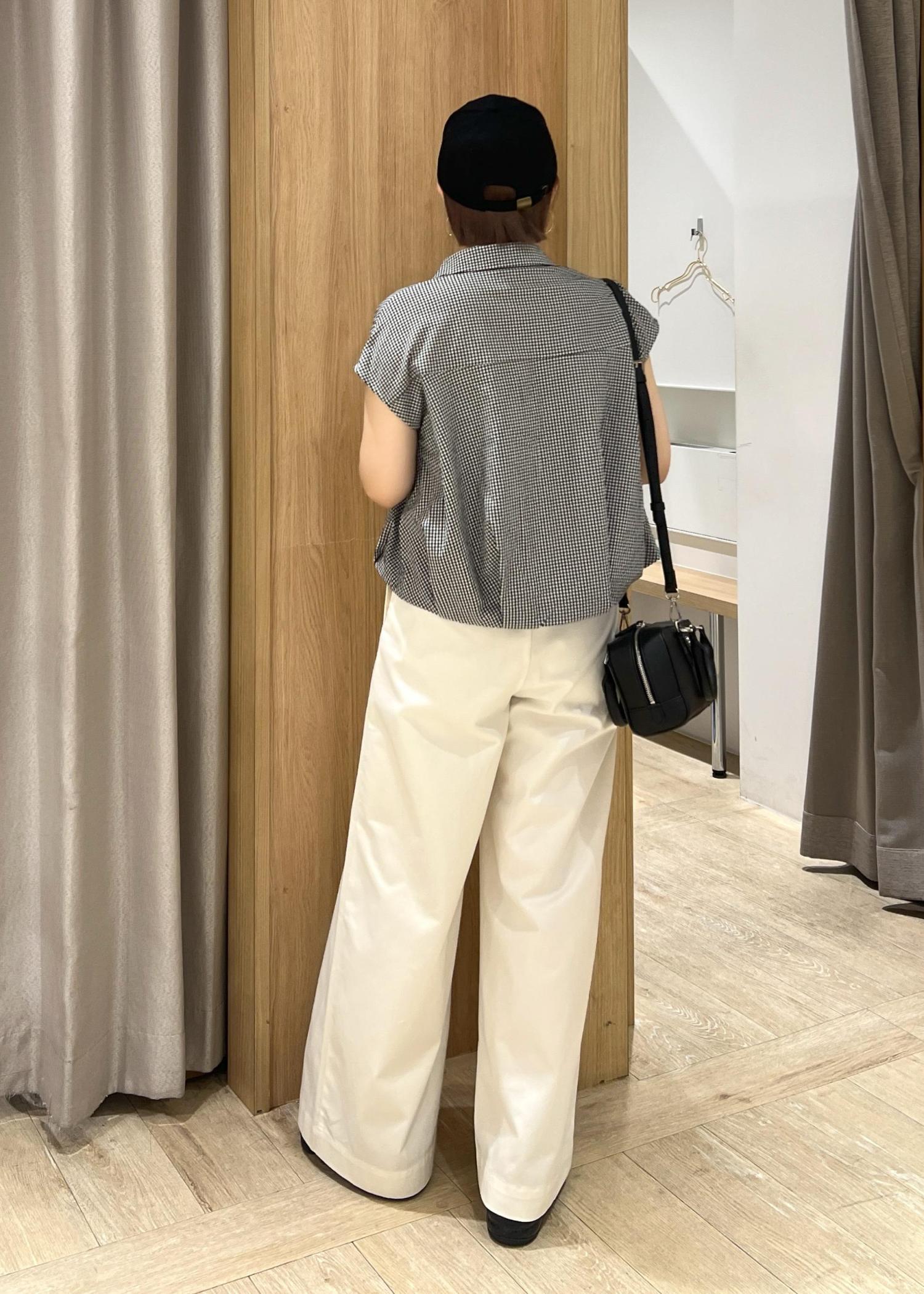 ウエストはややゆとりがあり、丈はヒール合わせで床に付かない長さでした。