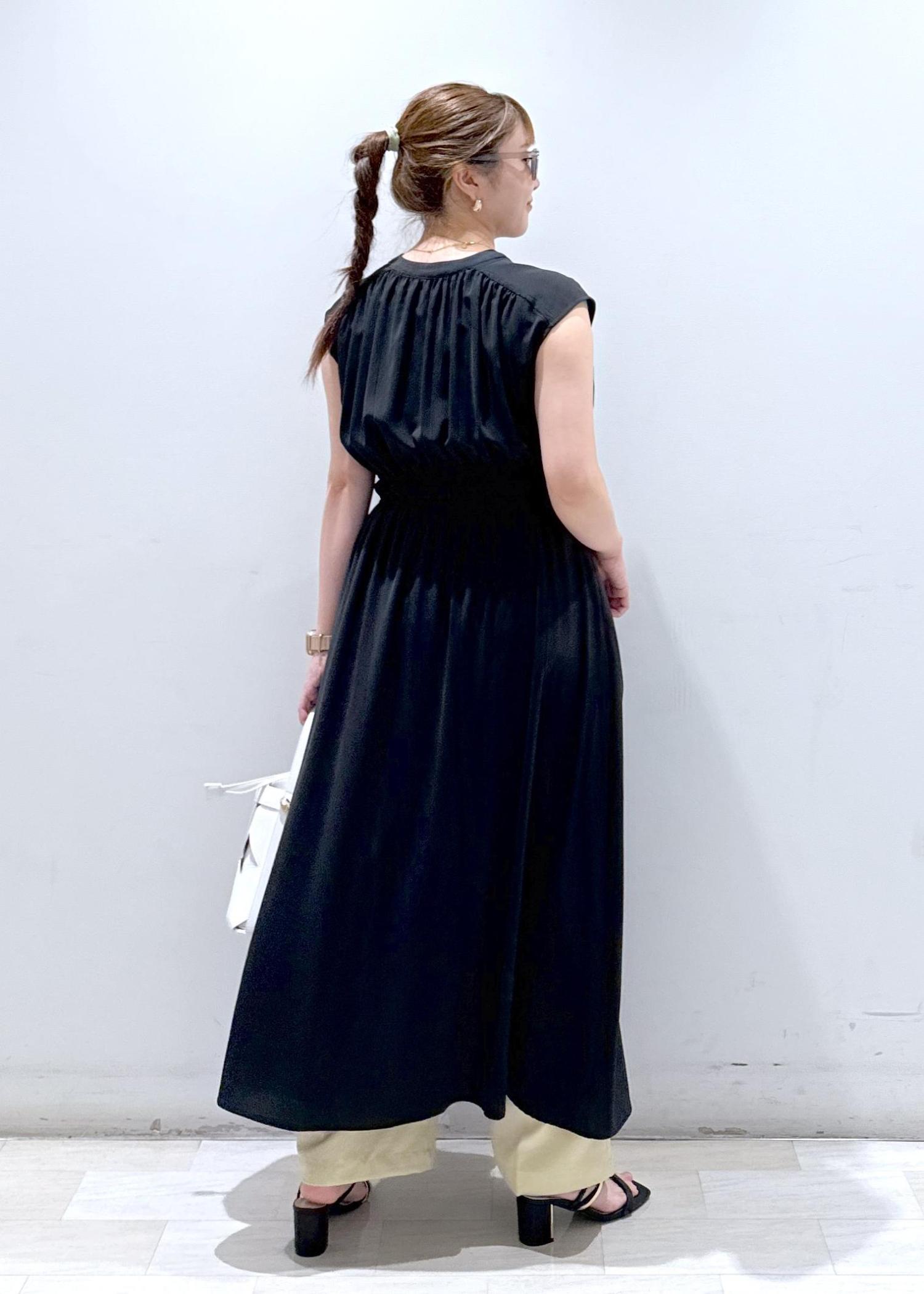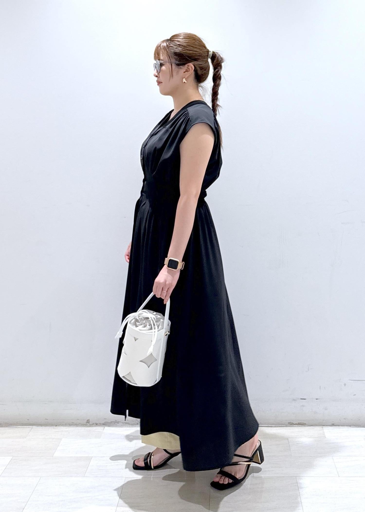ブラックのワンピースにボトムスに色ものイエローのボトムスをちらりと見せて、レイヤードスタイルにしてみました。