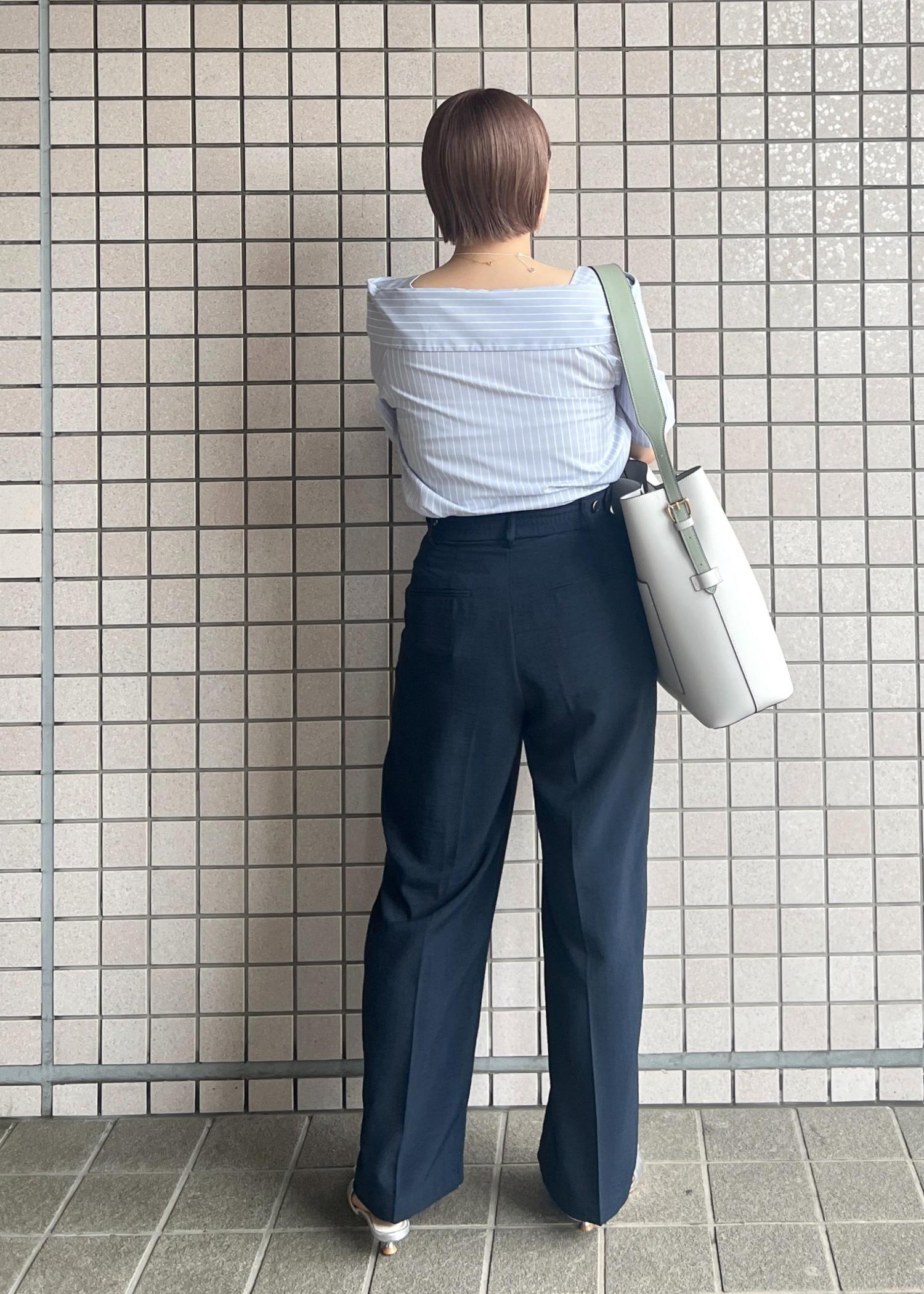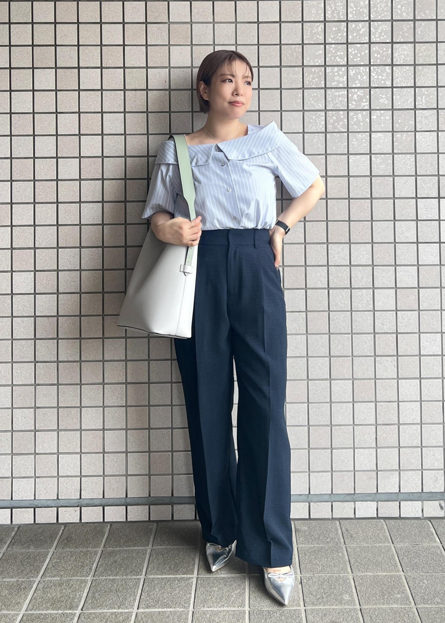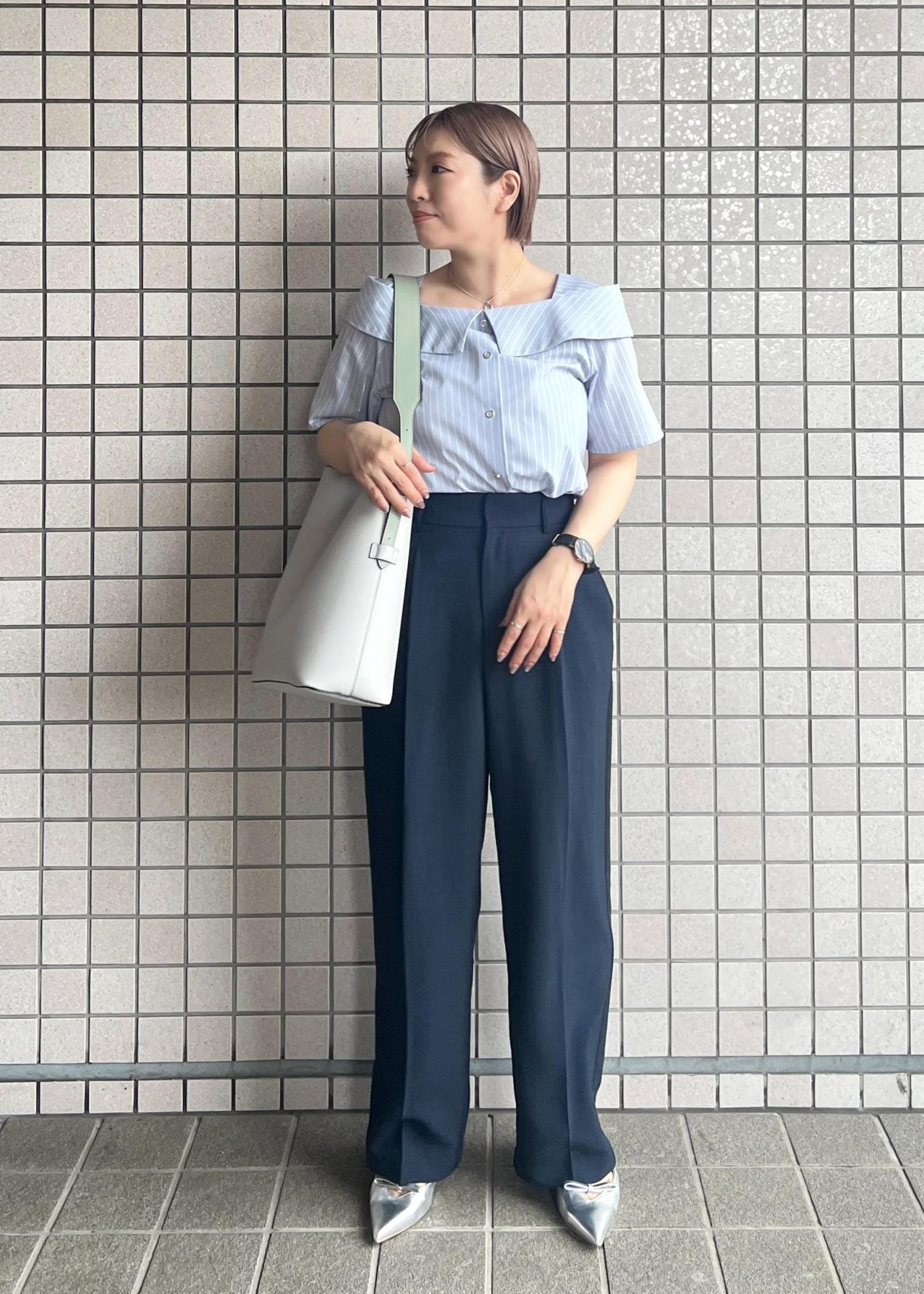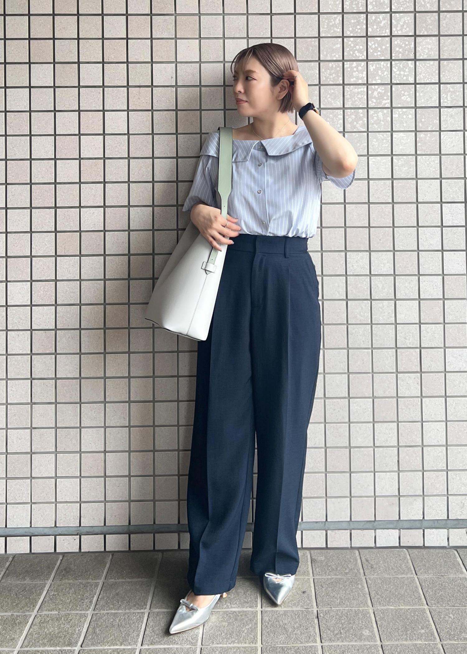 ストライプが爽やかなオフショルブラウスに大人気の美easyワイドパンツを合わせた通勤スタイルです!