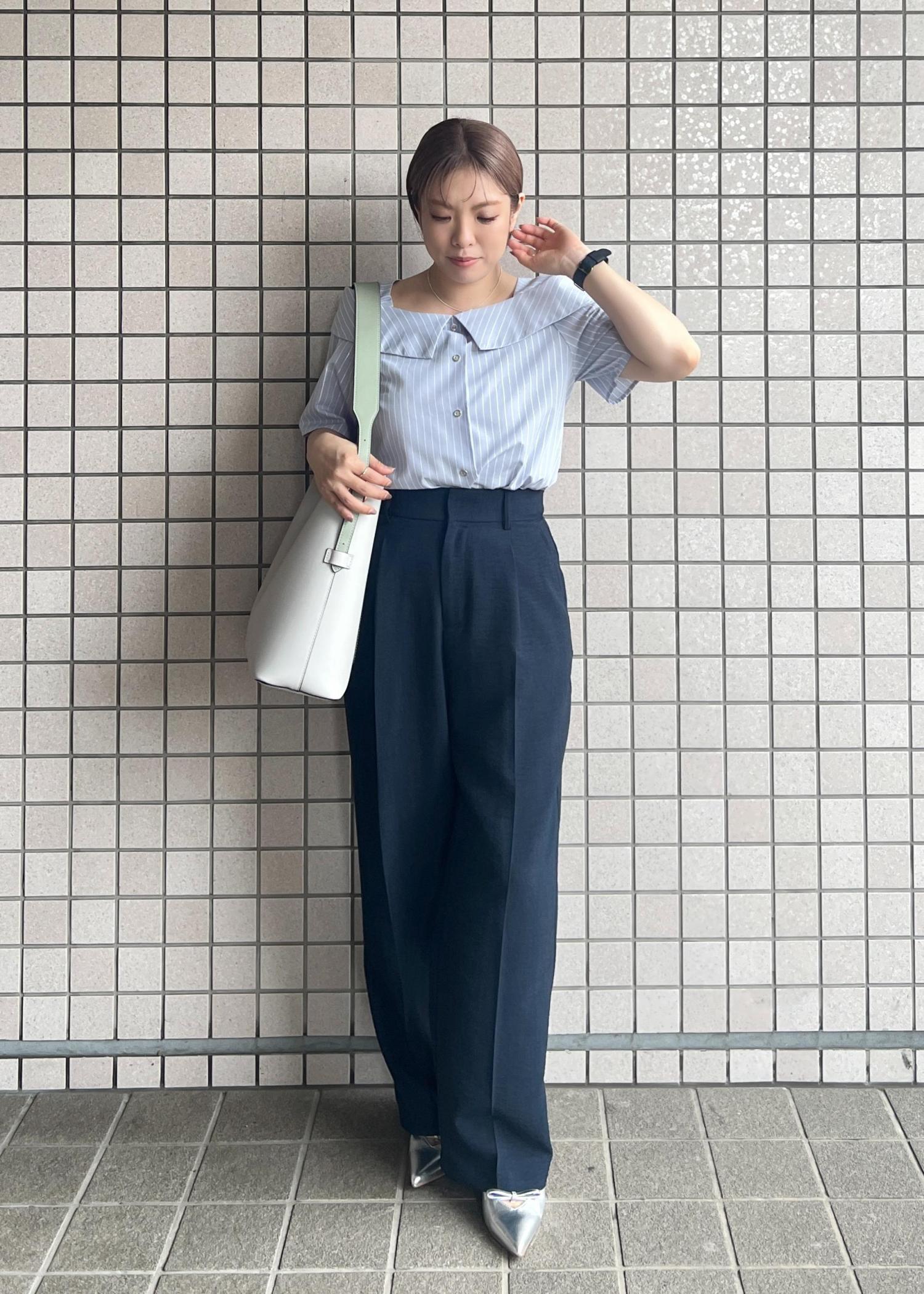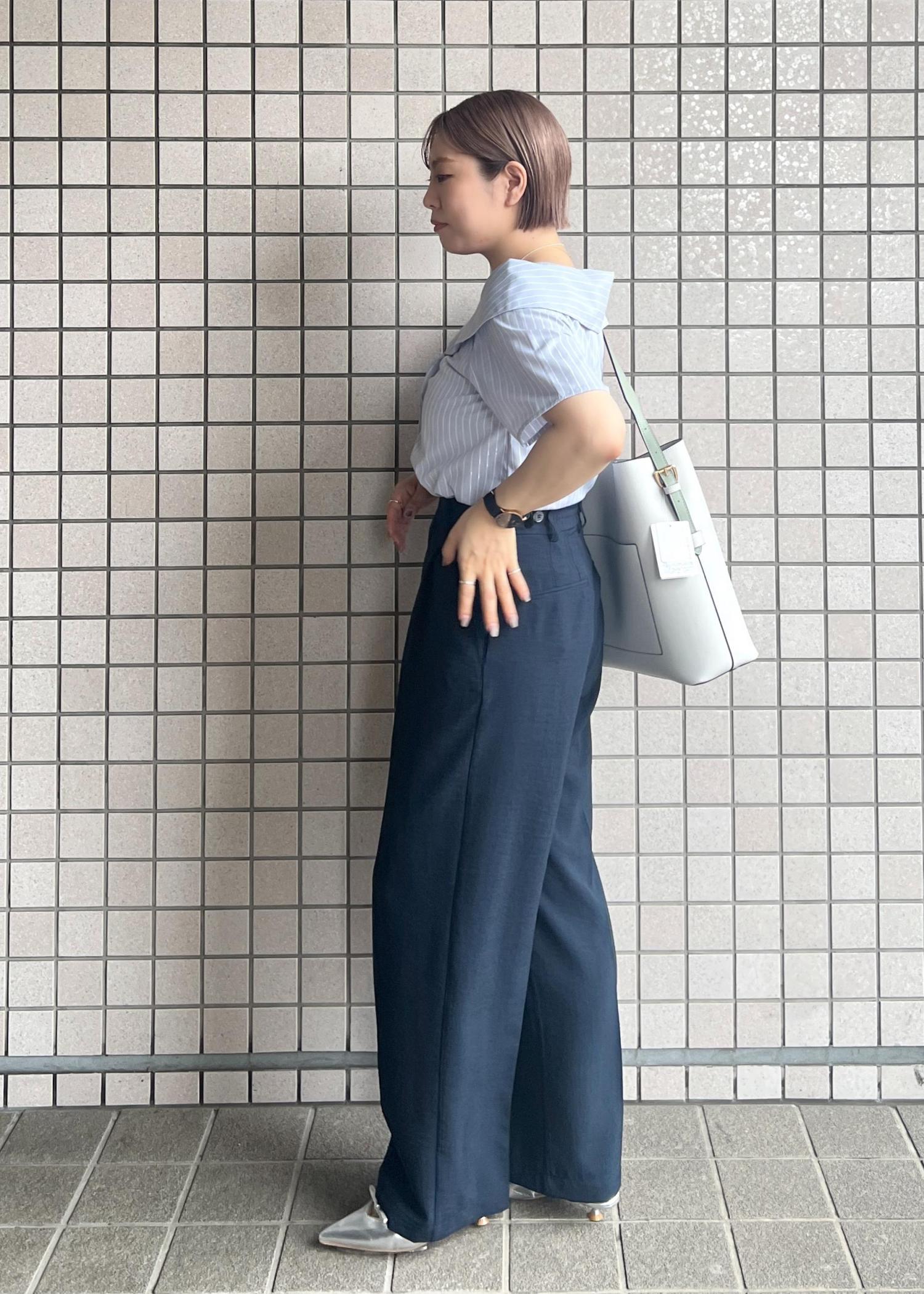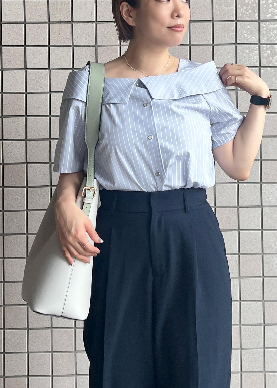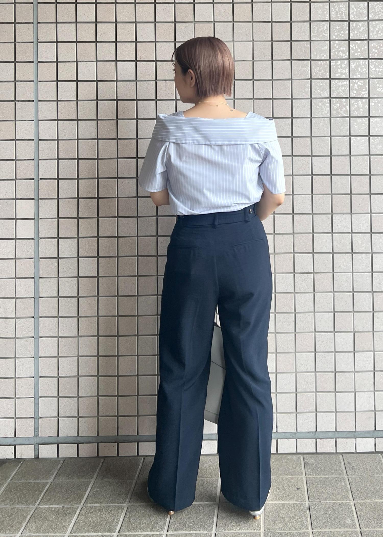 ストライプが爽やかなオフショルブラウスに大人気の美easyワイドパンツを合わせた通勤スタイルです!