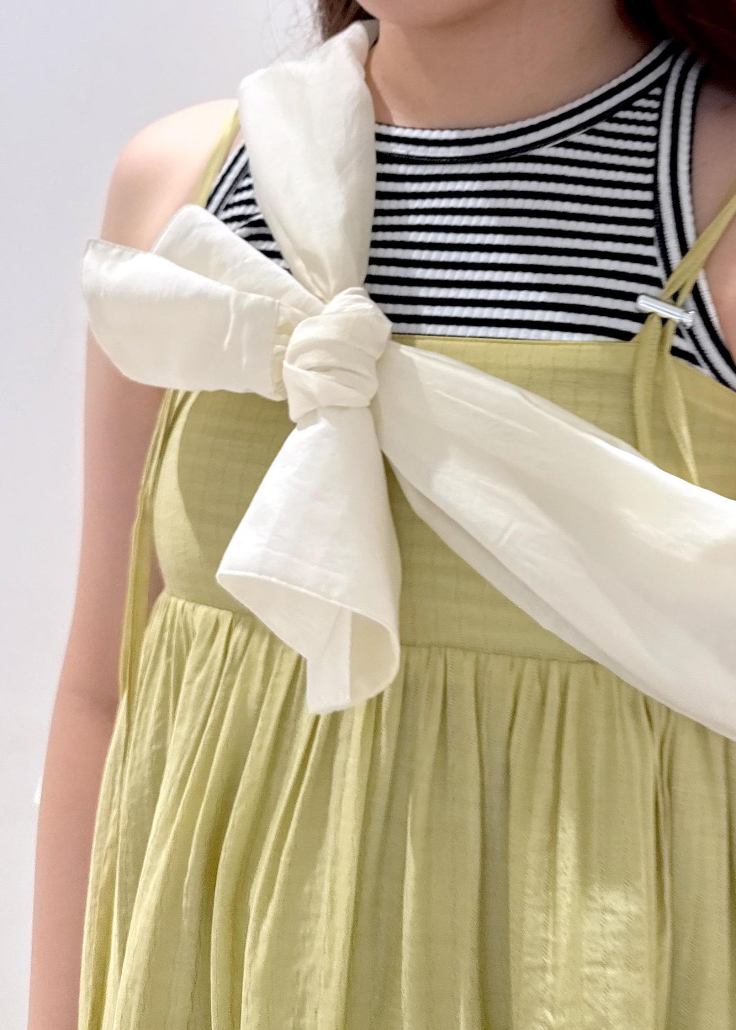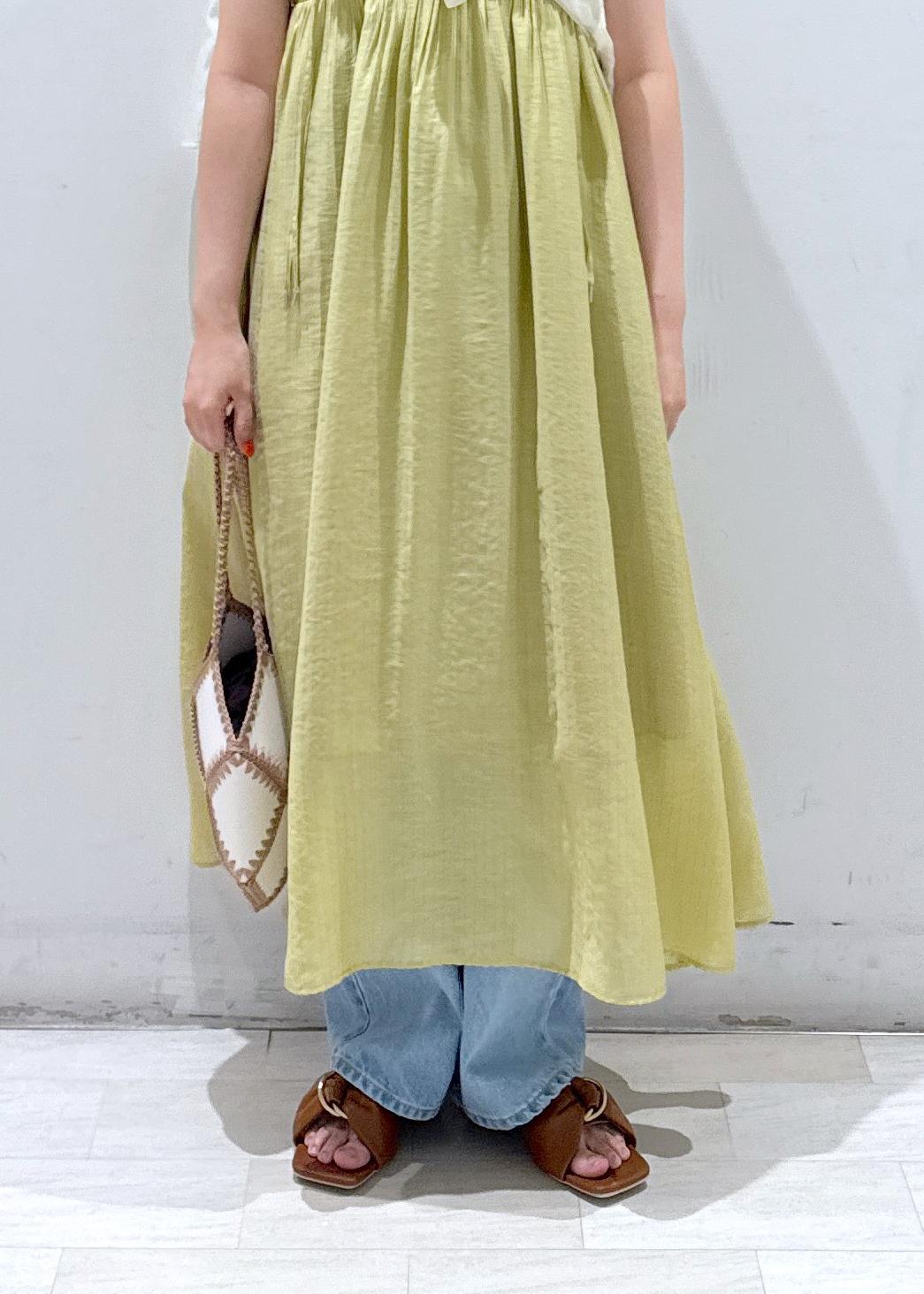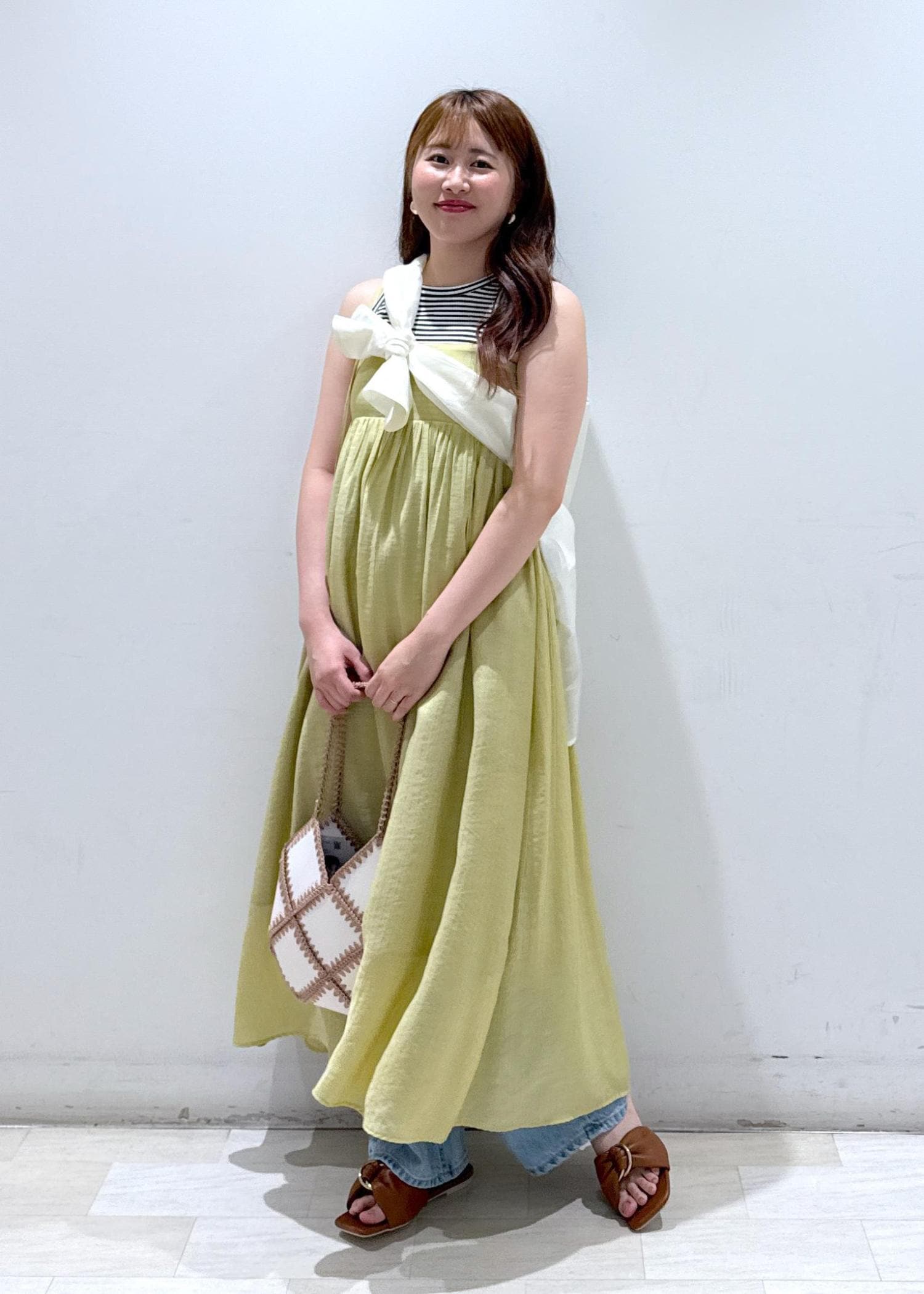 長さが調節できるのAラインのキャミソールワンピースに、敢えてデニムと合わせてカジュアルなスタイリングにしてみました。