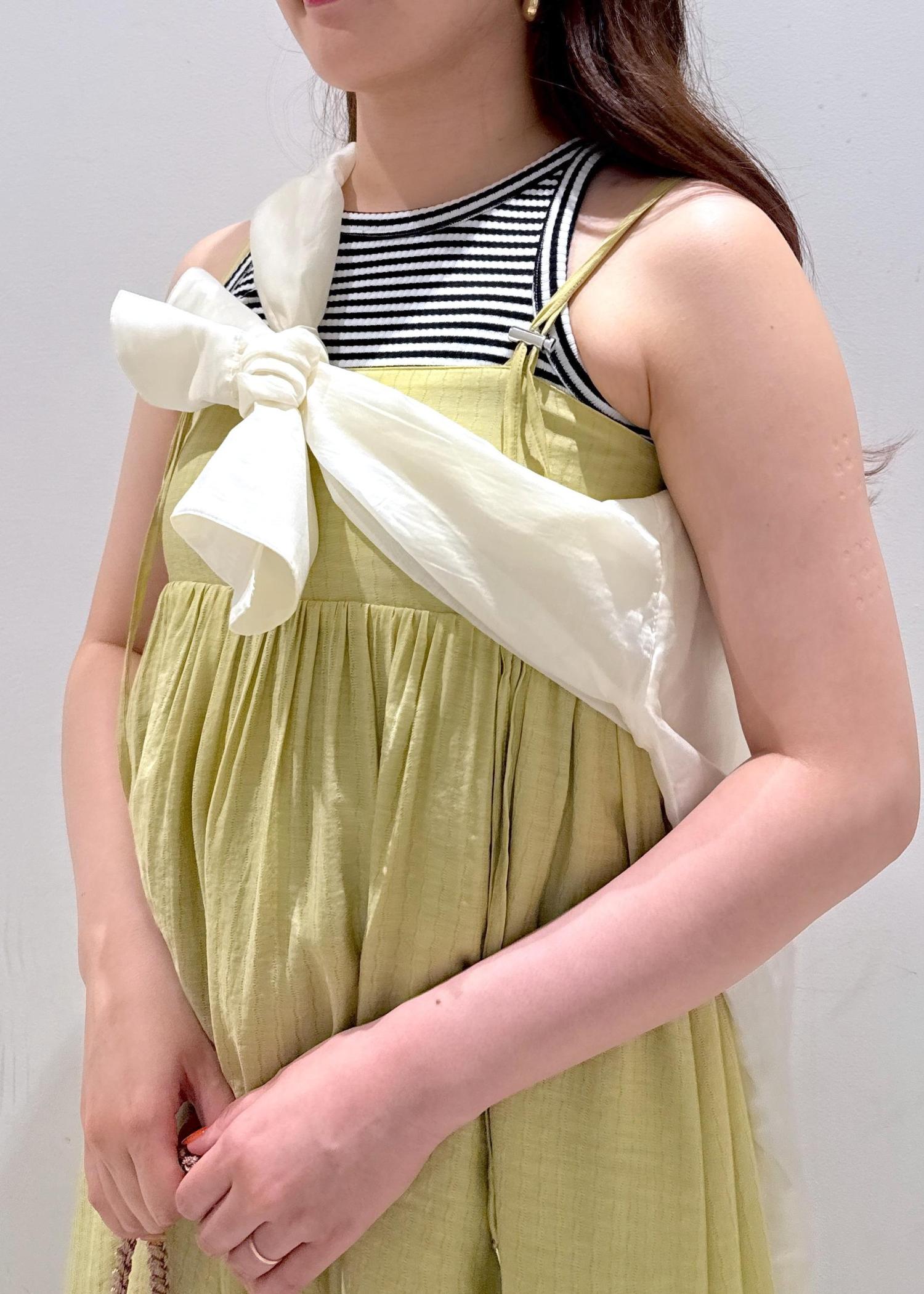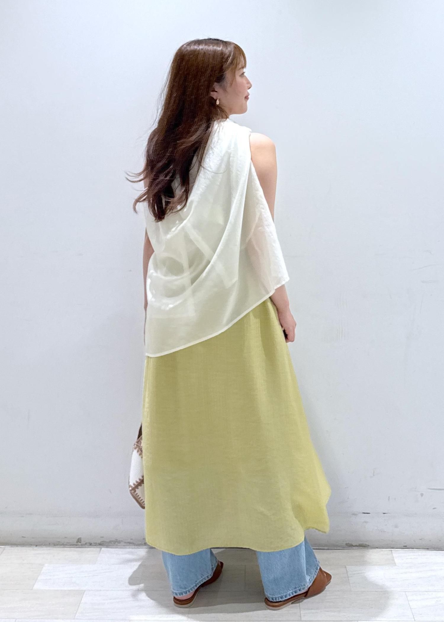 私は骨格ストレートなのでノースリーブだけど、上半身の身体の厚みが、特に肩周りが目立ってしまうのでシャツで斜め掛けをプラスにすることにより体型をカバーさせています。