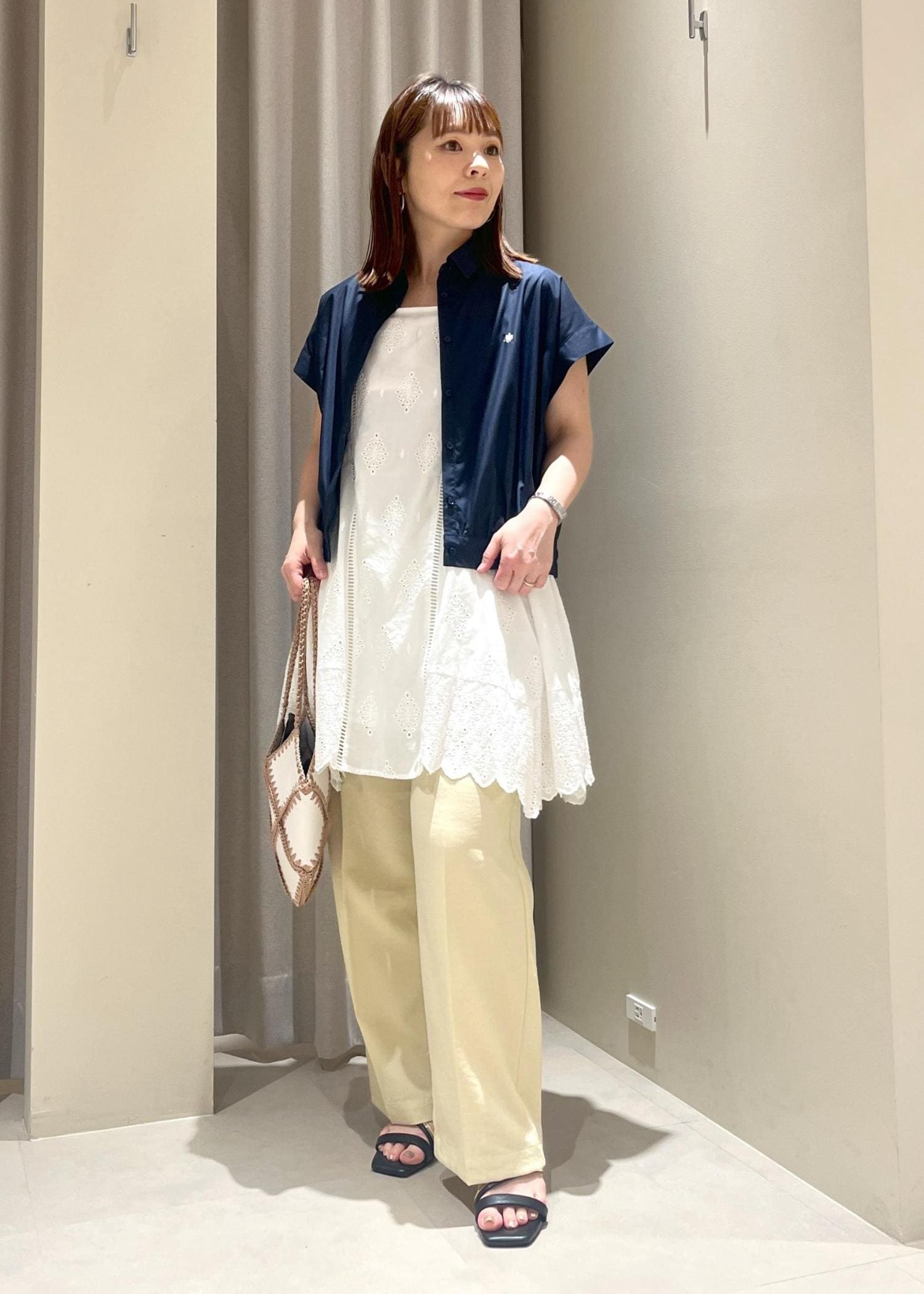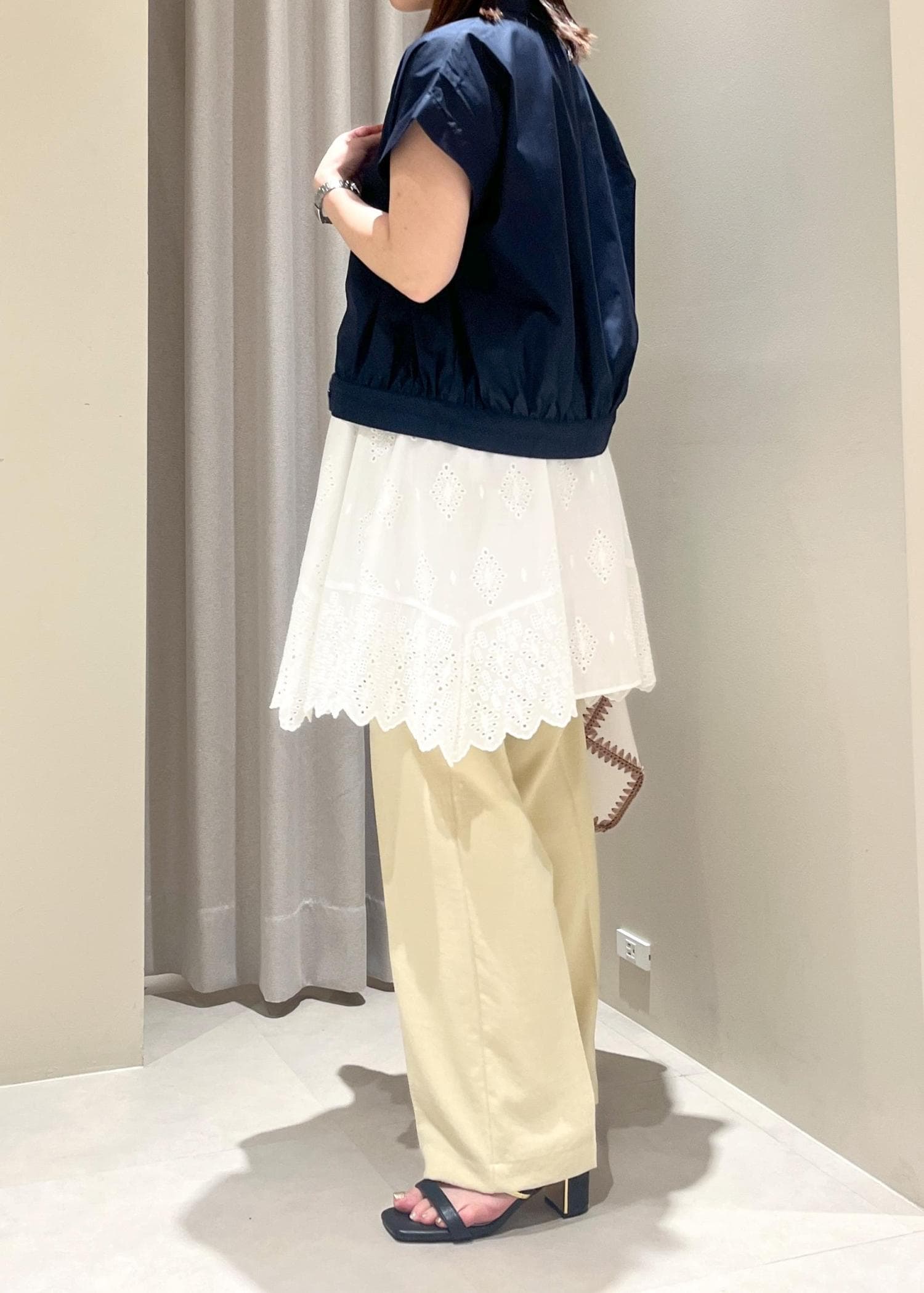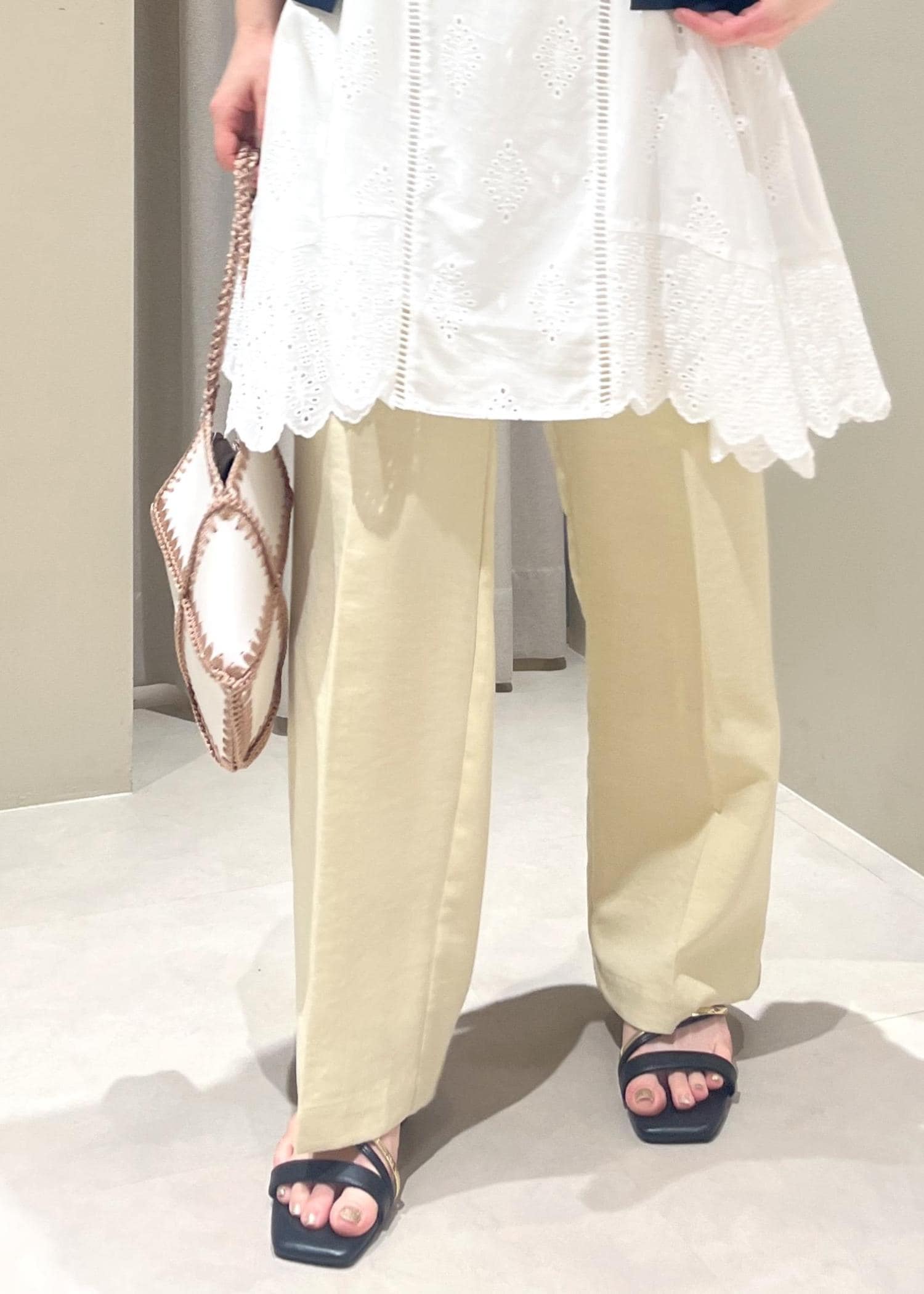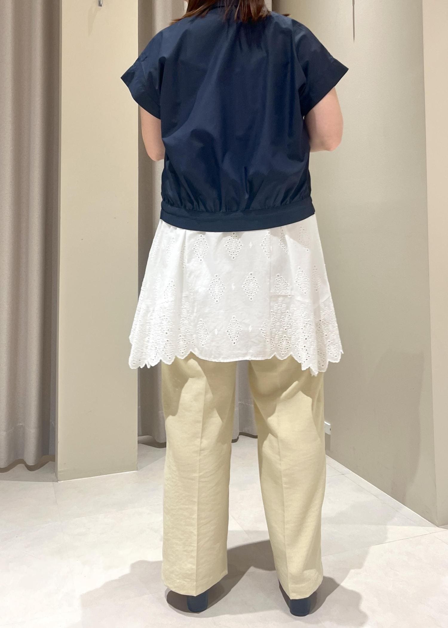 身長152センチで、フラットな靴だと裾が付きますがソールが厚めのスニーカーや4、5センチ程度のヒールでちょうど良く履けます。 -