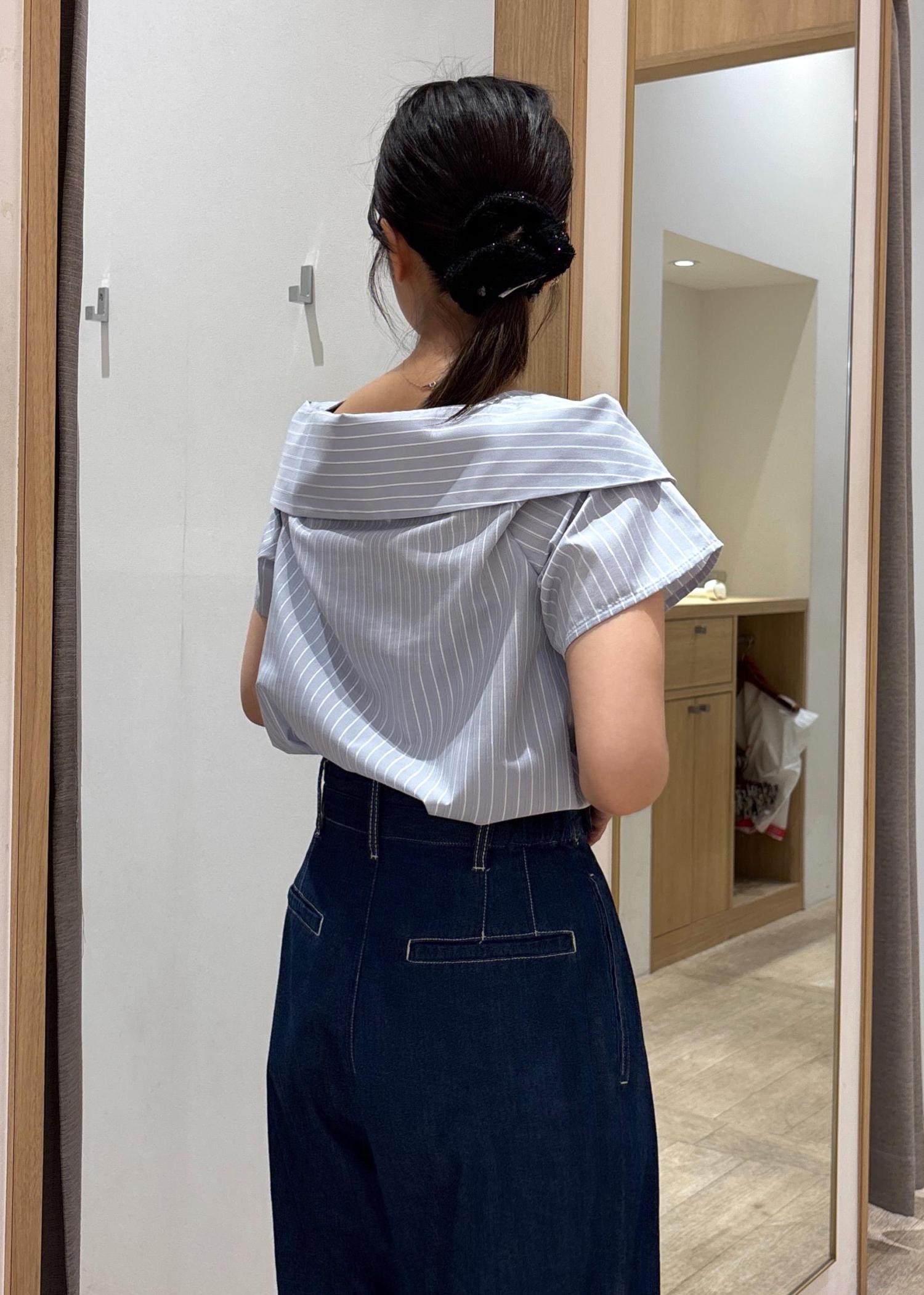 一枚で女性らしい抜け感が出るブラウスで、デニムスタイルをカジュアルすぎないコーデにする低身長のデニムスタイルです。