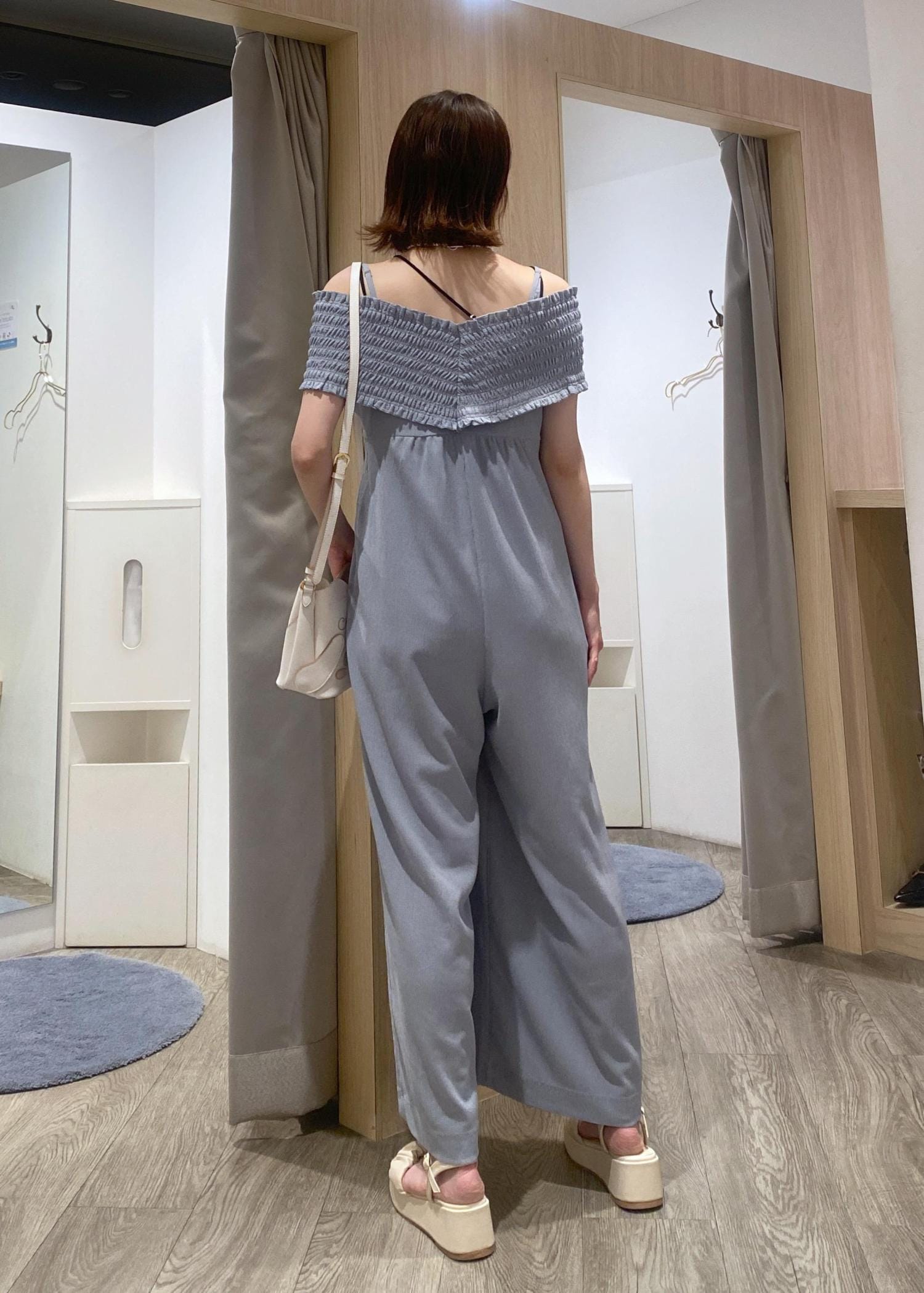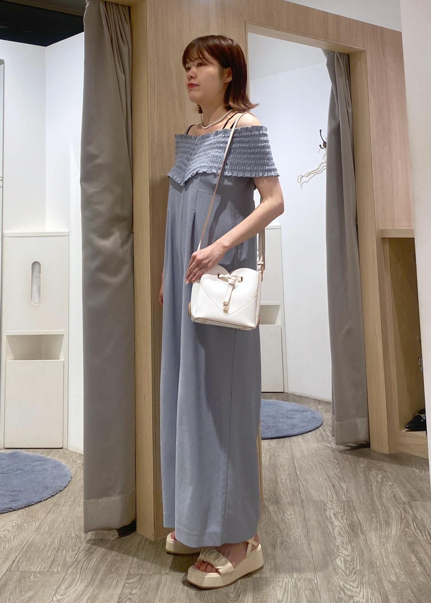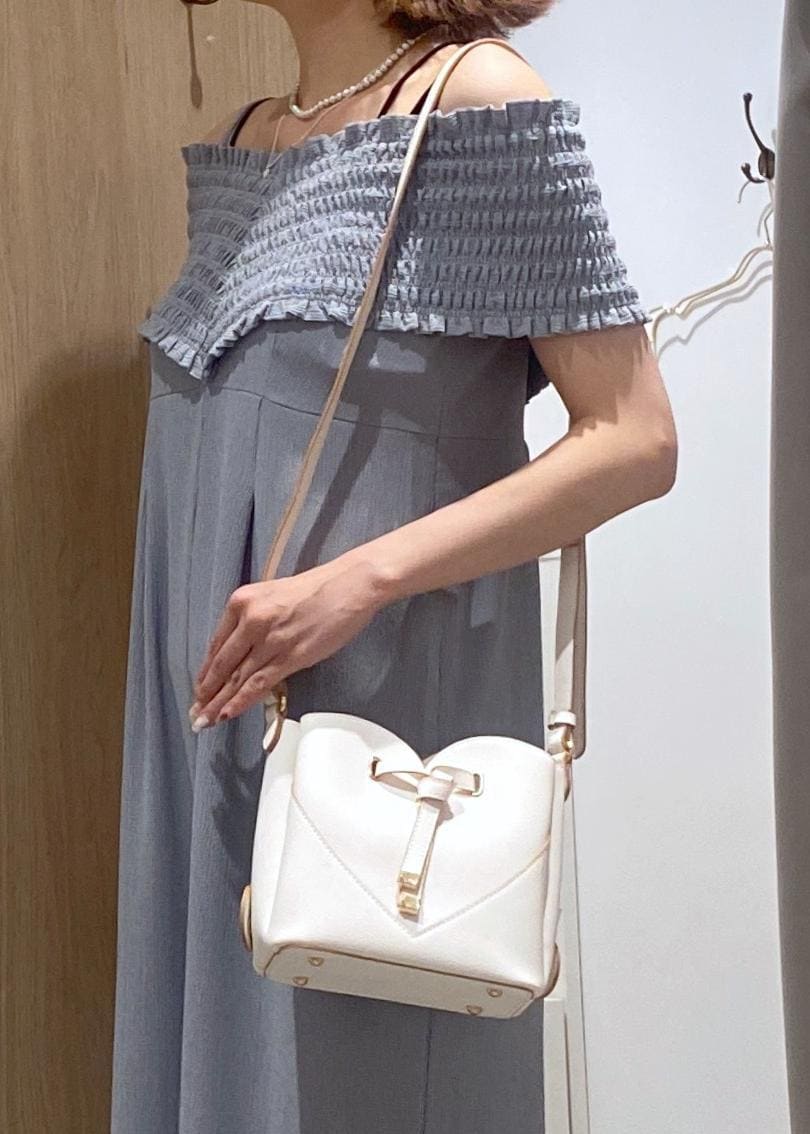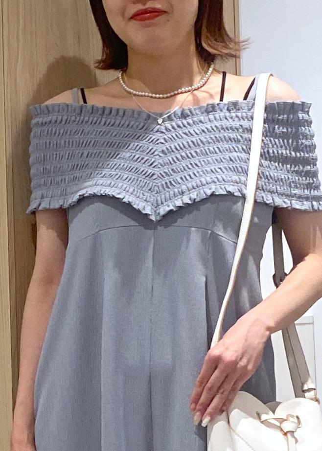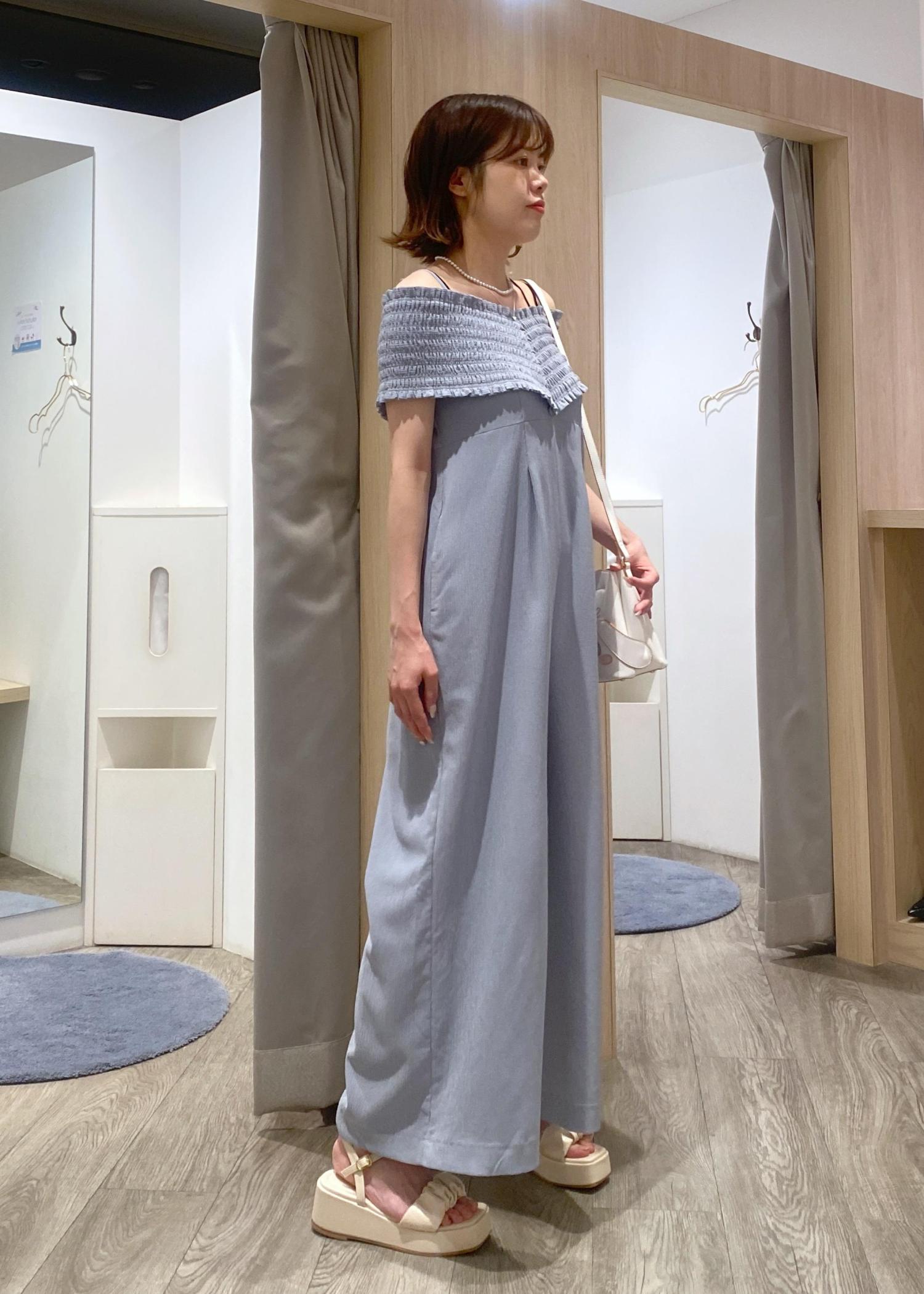 オフショルデザインなので、カジュアルに見えがちなオールインワンも大人可愛く着ていただけます!
