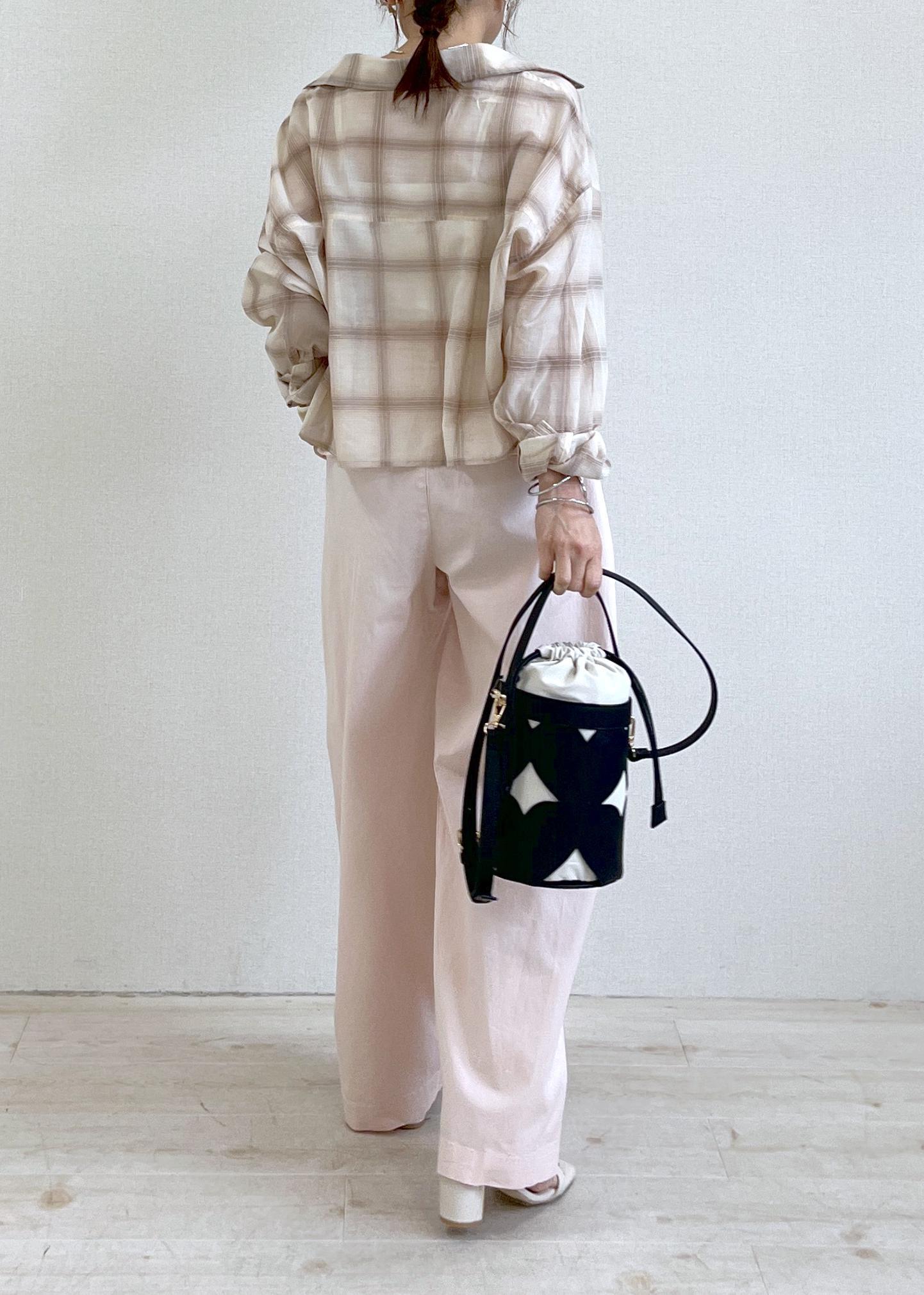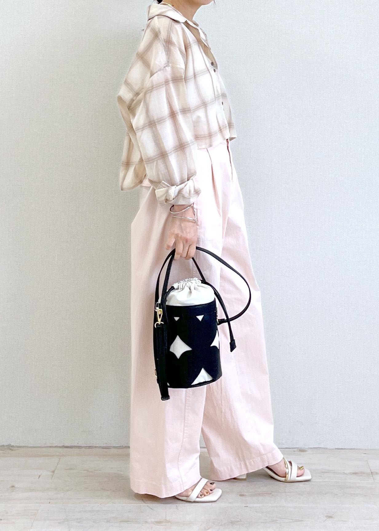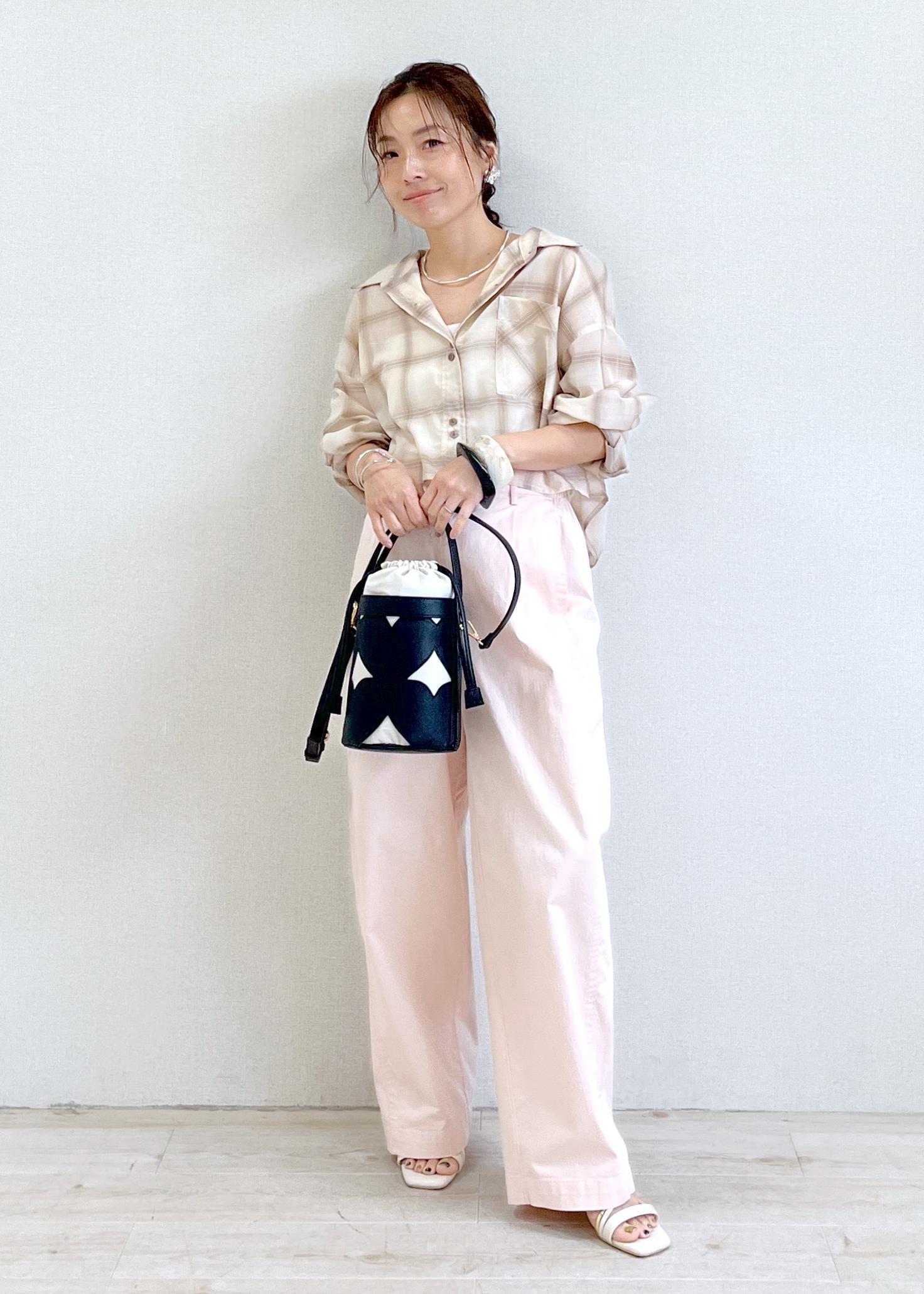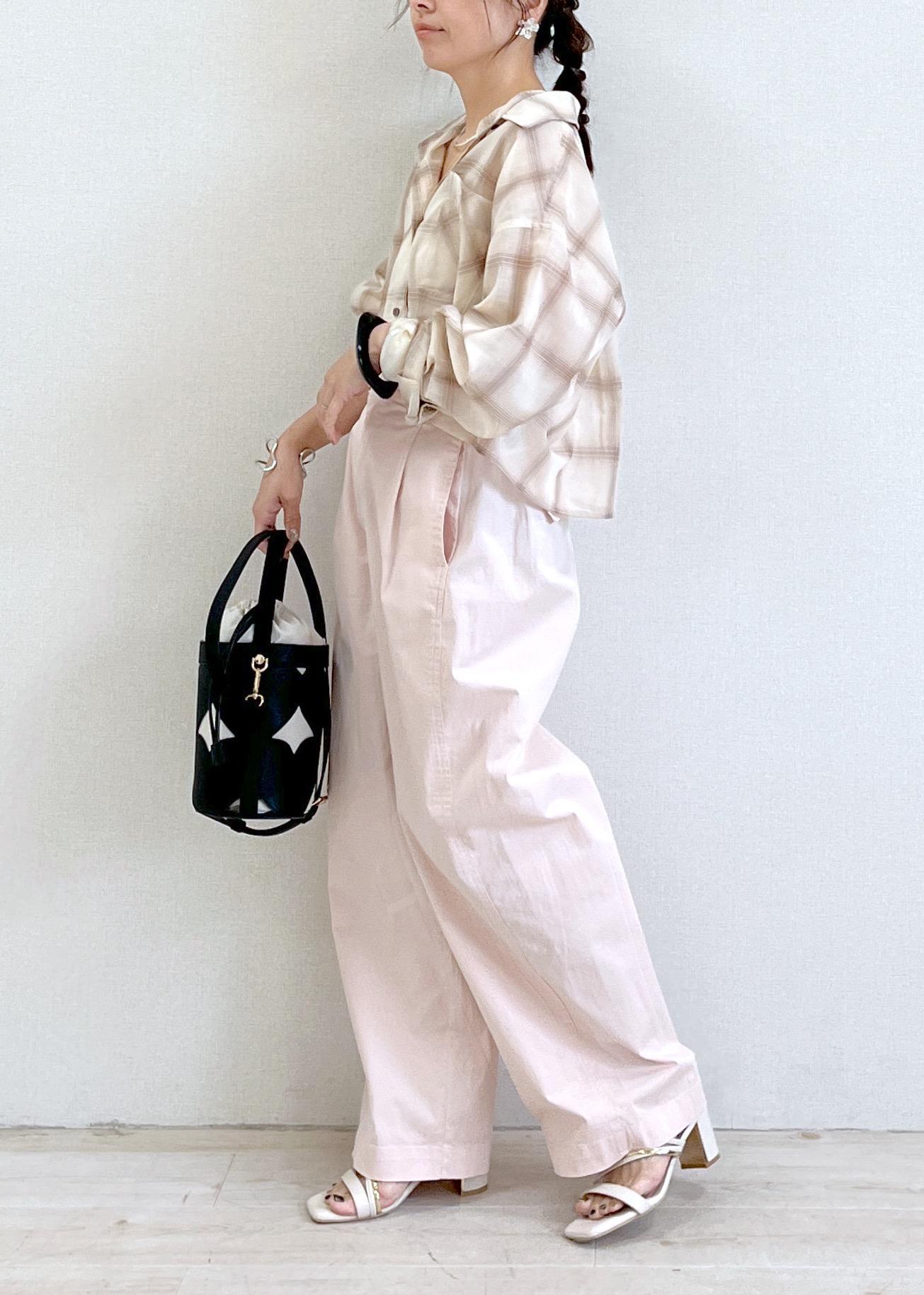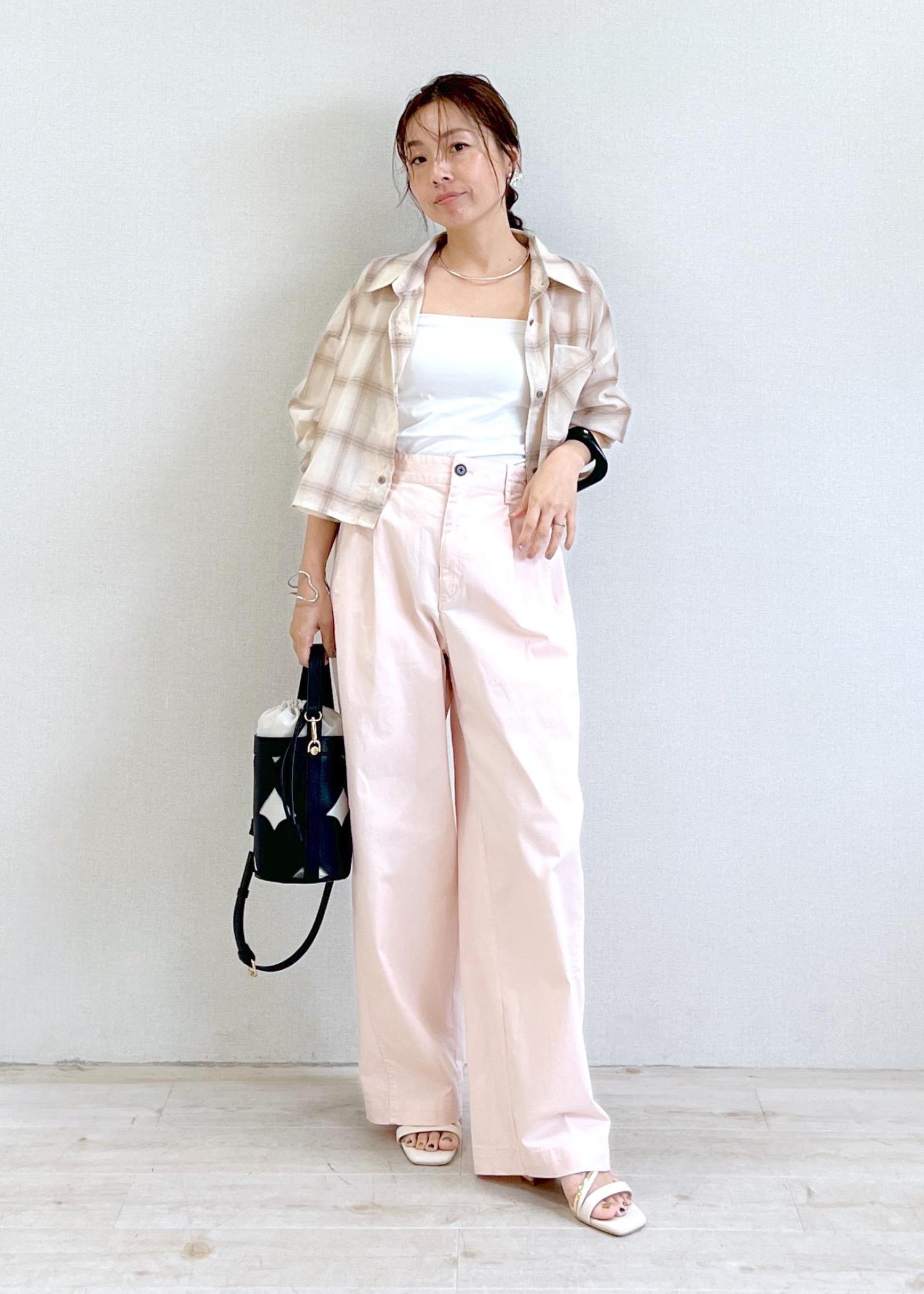ふんわりチェック×淡ピンクのワイドパンツでつくる、やさしい夏の大人カジュアル。