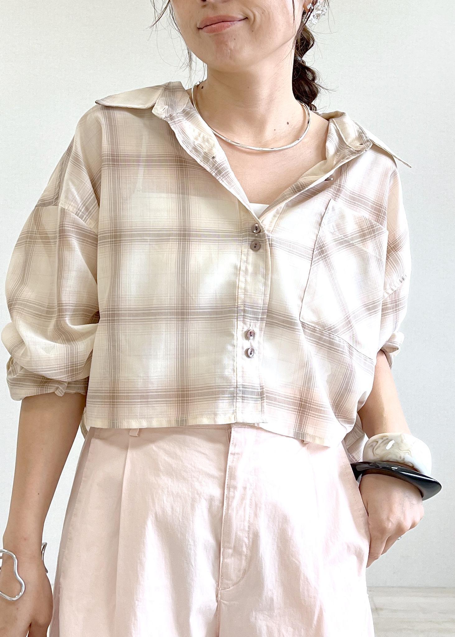 アウトレットVISシアー&チェックショート丈シャツベージュ / F¥3,293レビュー152cmでウエストくらいの短め丈。とっても柔らかい素材で着心地◎オーバーサイズですが、オチ感があるので横に広がりすぎずに着られました。馴染みカラーのチェックがとっても可愛い♡コーディネートのアクセントとしても使えます!