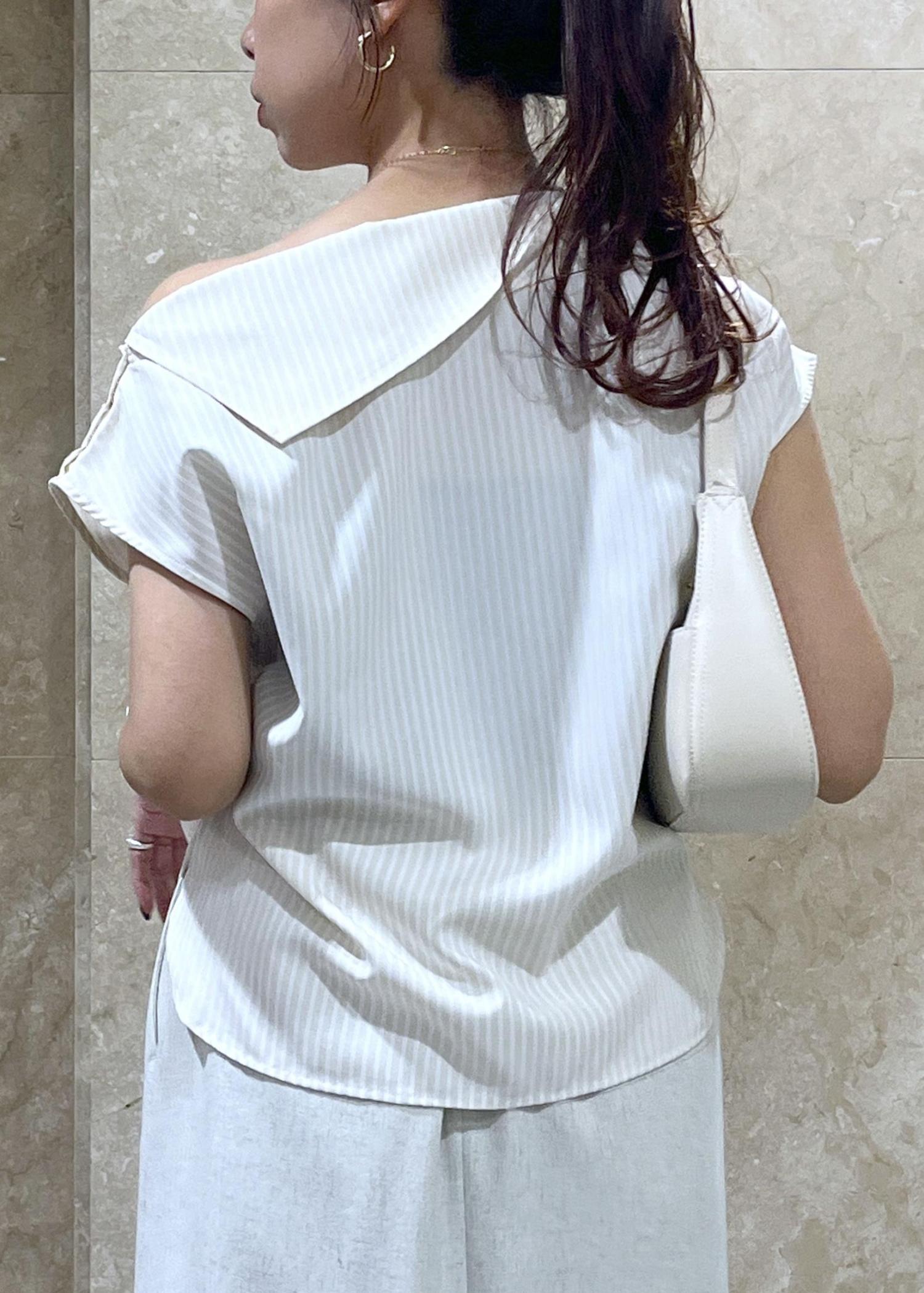 身幅はほどよくゆとりがありますが、ウエストのくびれ部分にタックが入っていたりと、薄手の素材感ながら立体感あるシルエットが一枚で完成しているので、ウエストインでも、アウトでも様になる!