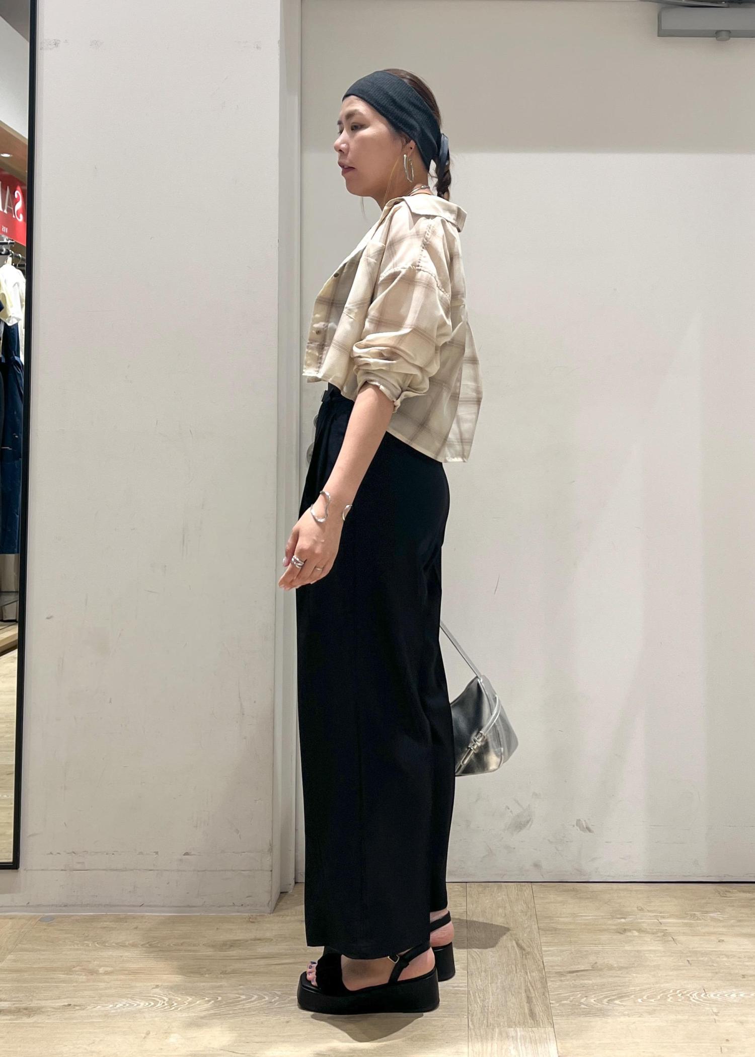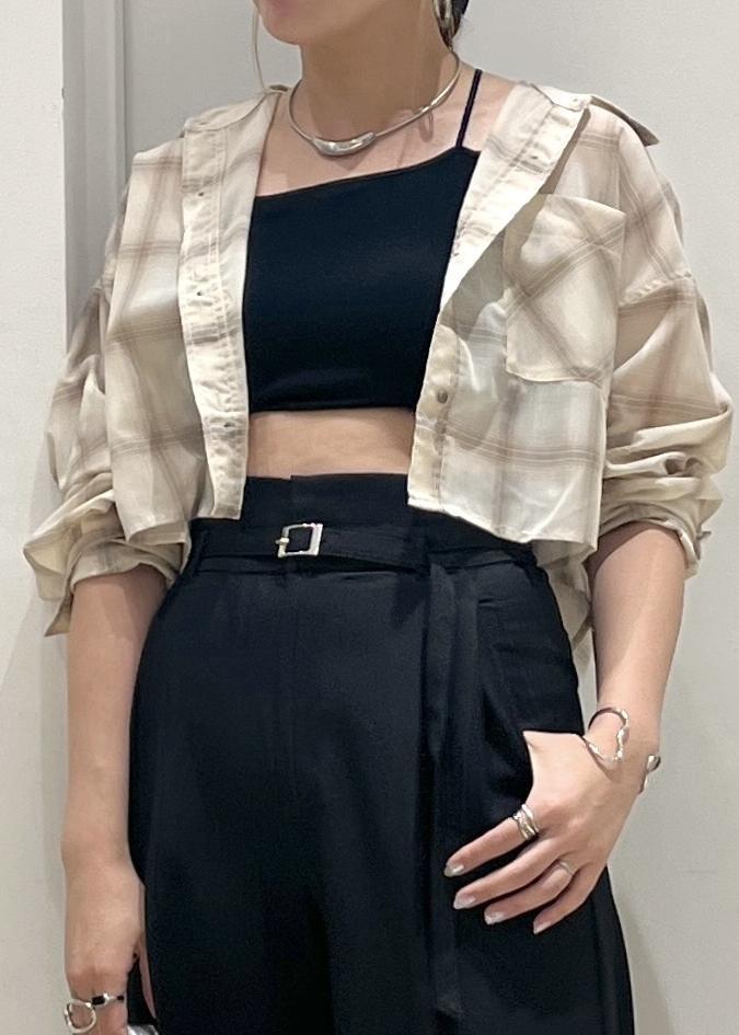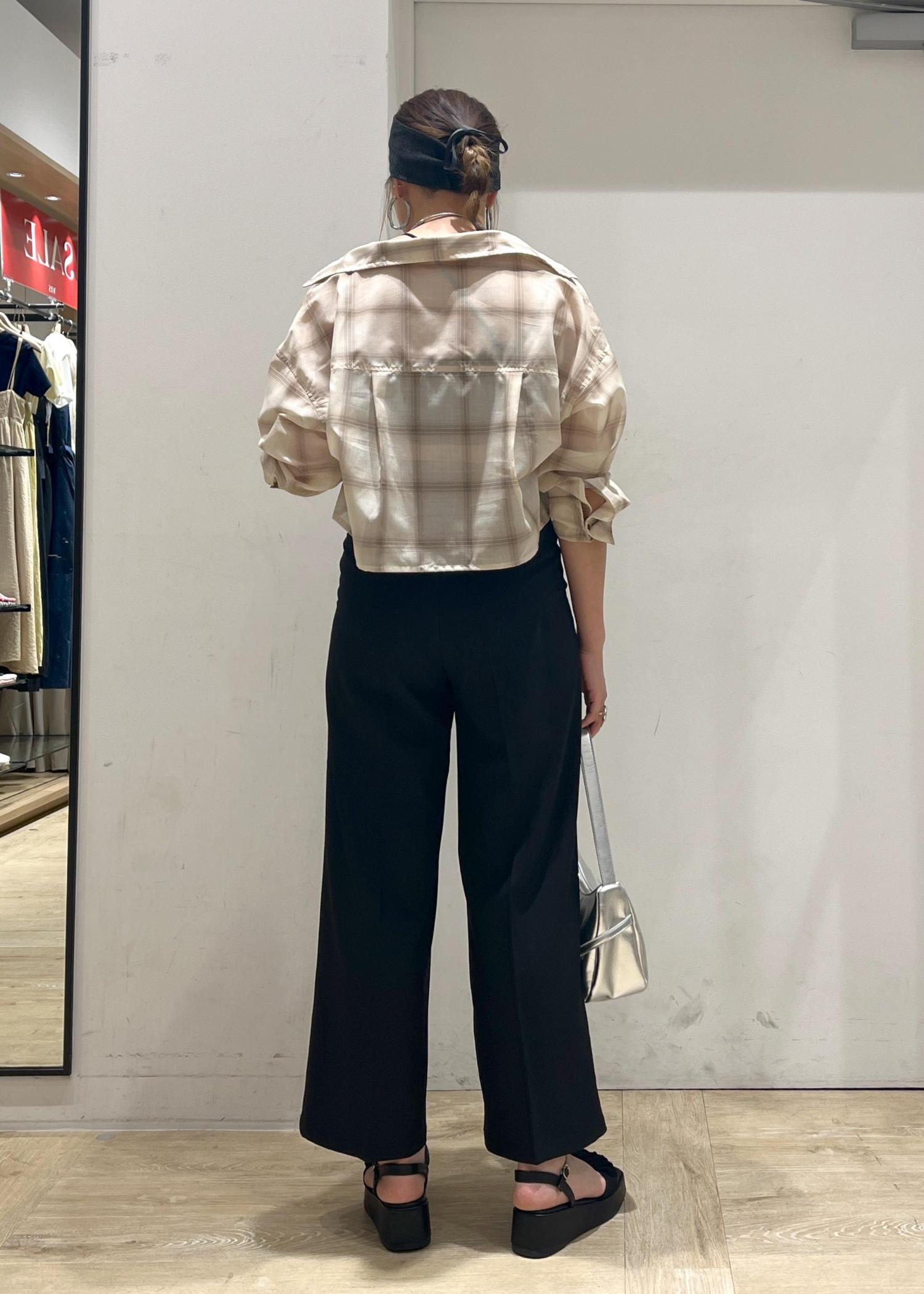チェック柄が爽やかになるシアーシャツは着丈がスッキリなのでハイウエストパンツとの相性◎