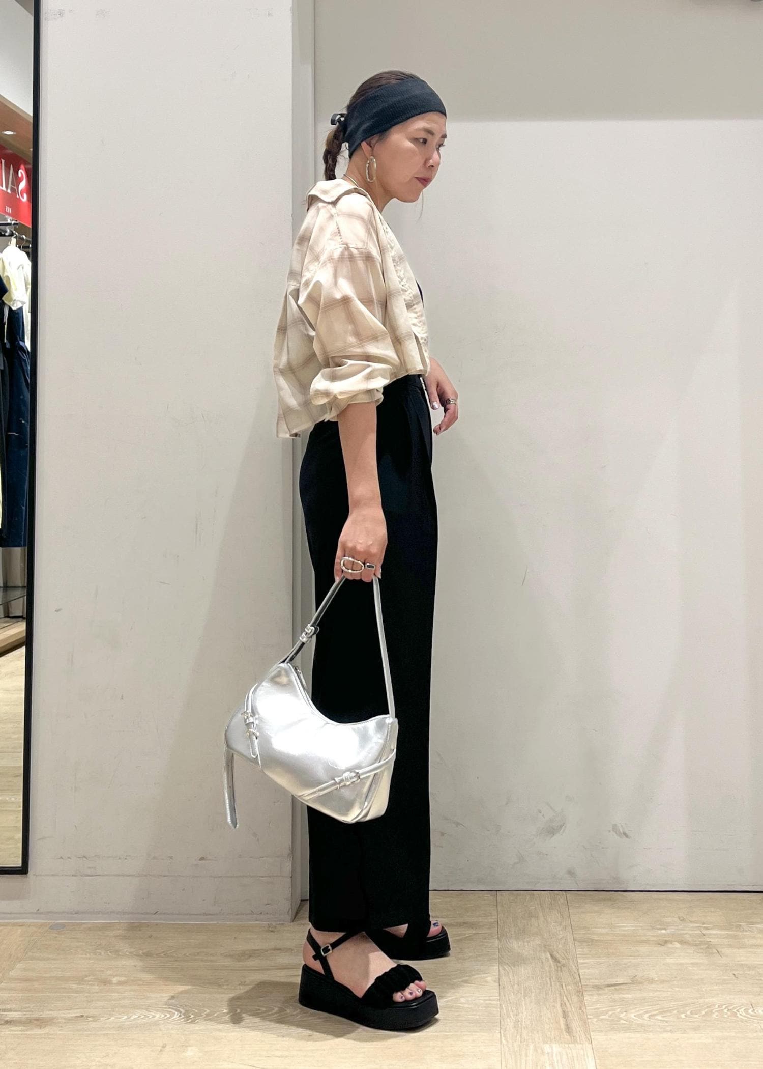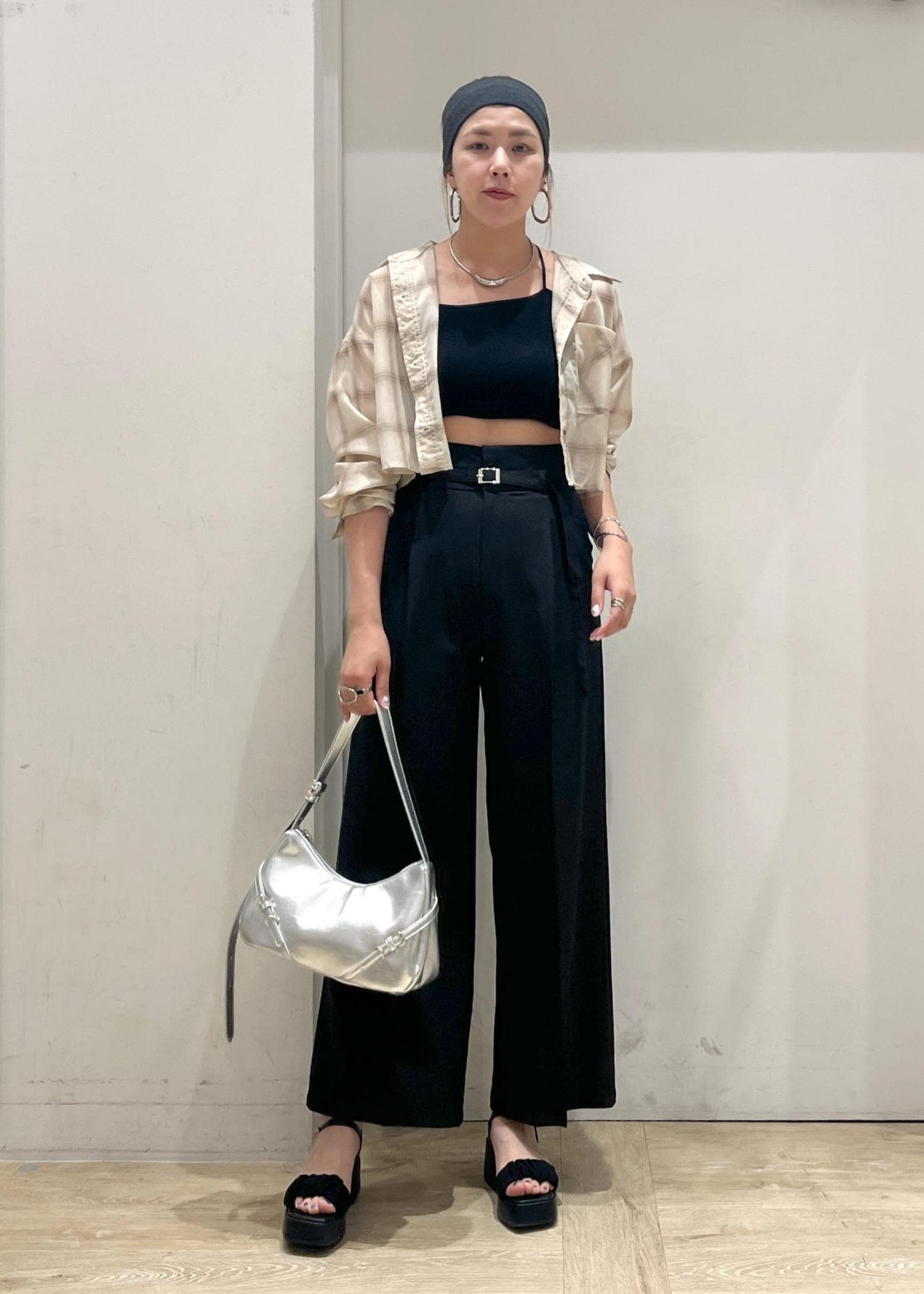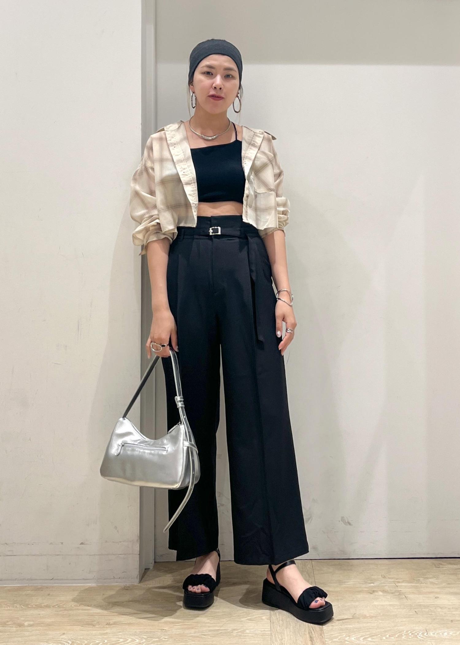 チェック柄が爽やかになるシアーシャツは着丈がスッキリなのでハイウエストパンツとの相性◎