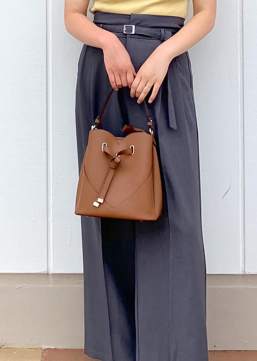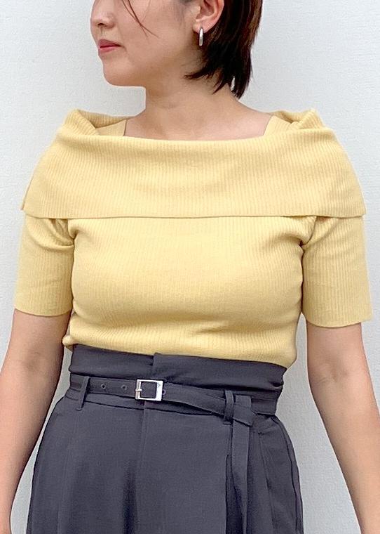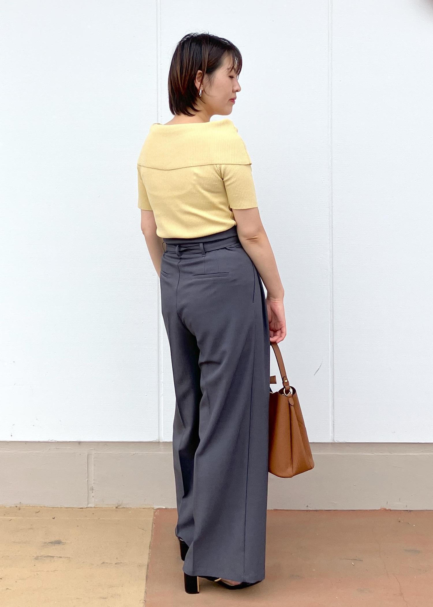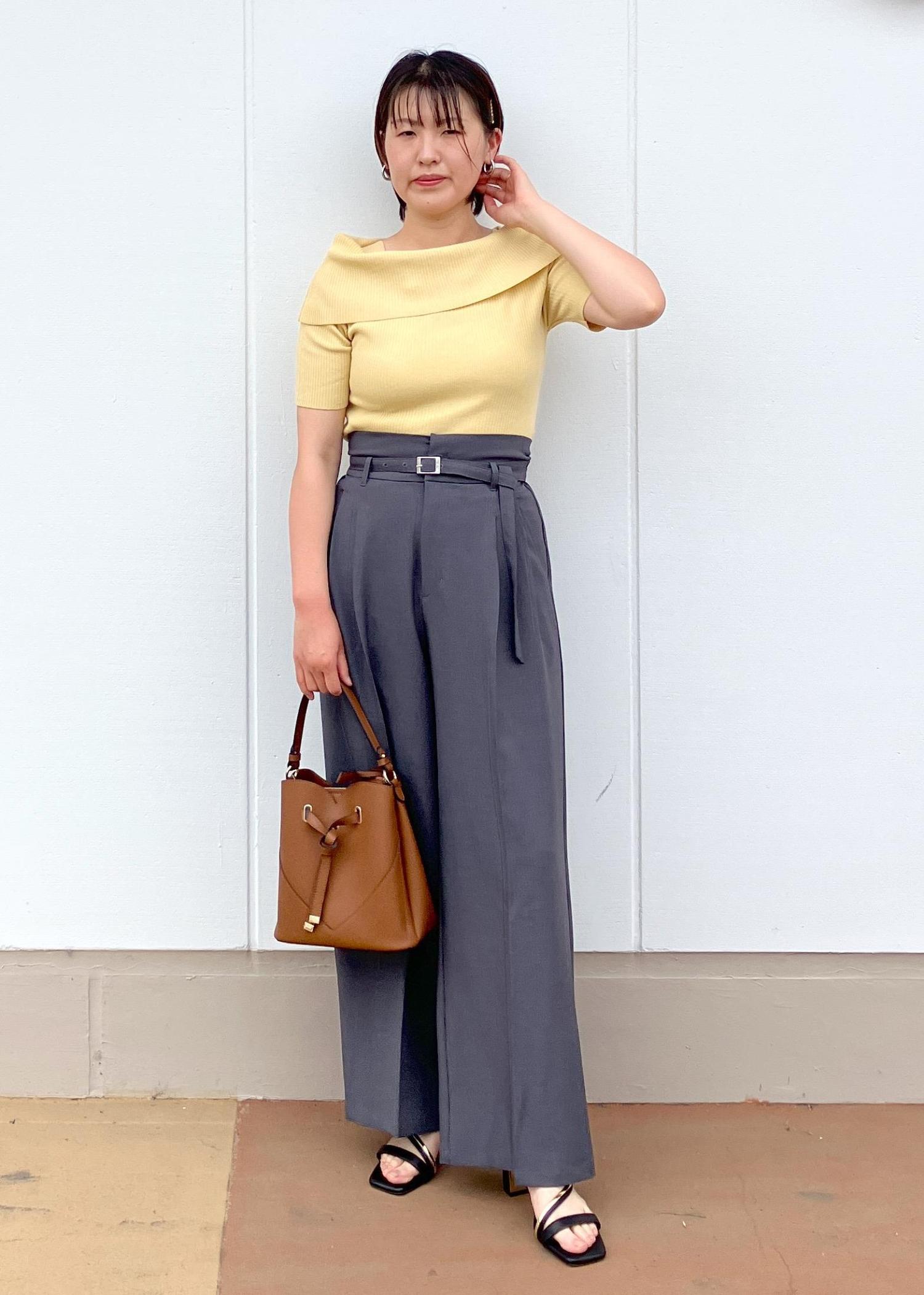トップスのオフショルダー風ニットに新色でイエローが登場しました!イエローは明るくて落ち着かずなかなか着用する機会がないのですが、こちらのパンツがお気に入りで合わせてみたら落ち着く印象でしたので挑戦してみました!秋を先取りできるカラー合わせでおすすめです!