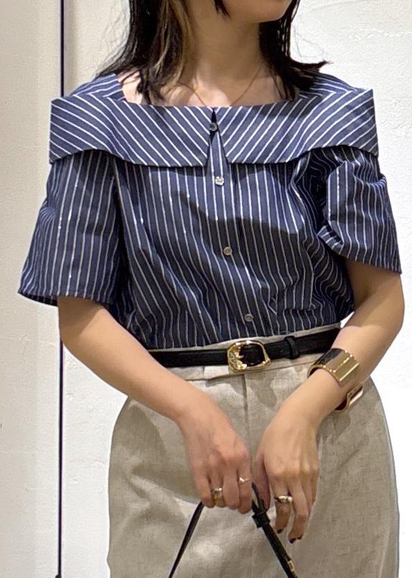 VIS【新色追加】【防シワ】ラメミックスオフショルダー風ストライプシャツブルー系 / F¥5,489レビューストライプ部分がラメになっていて動くとさりげなくキラッと華やか✨