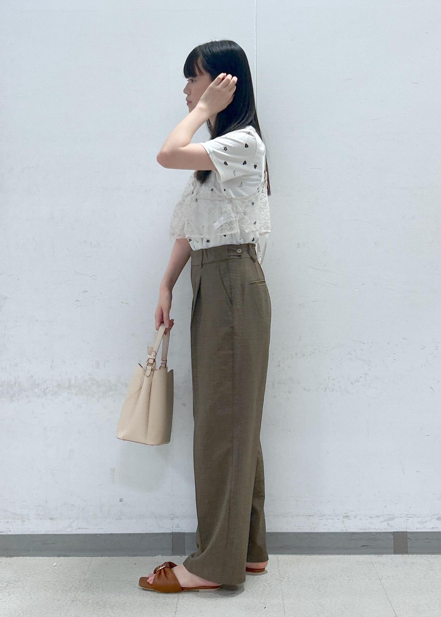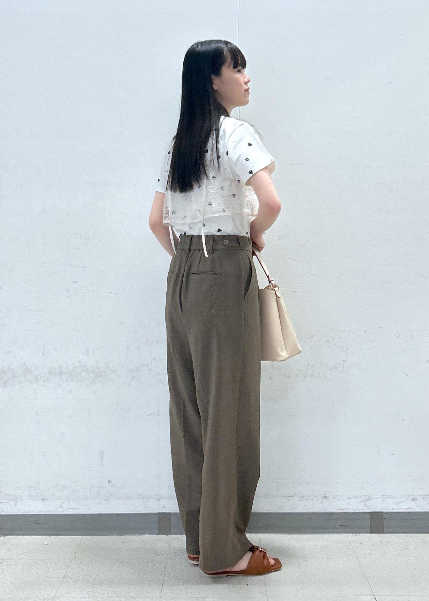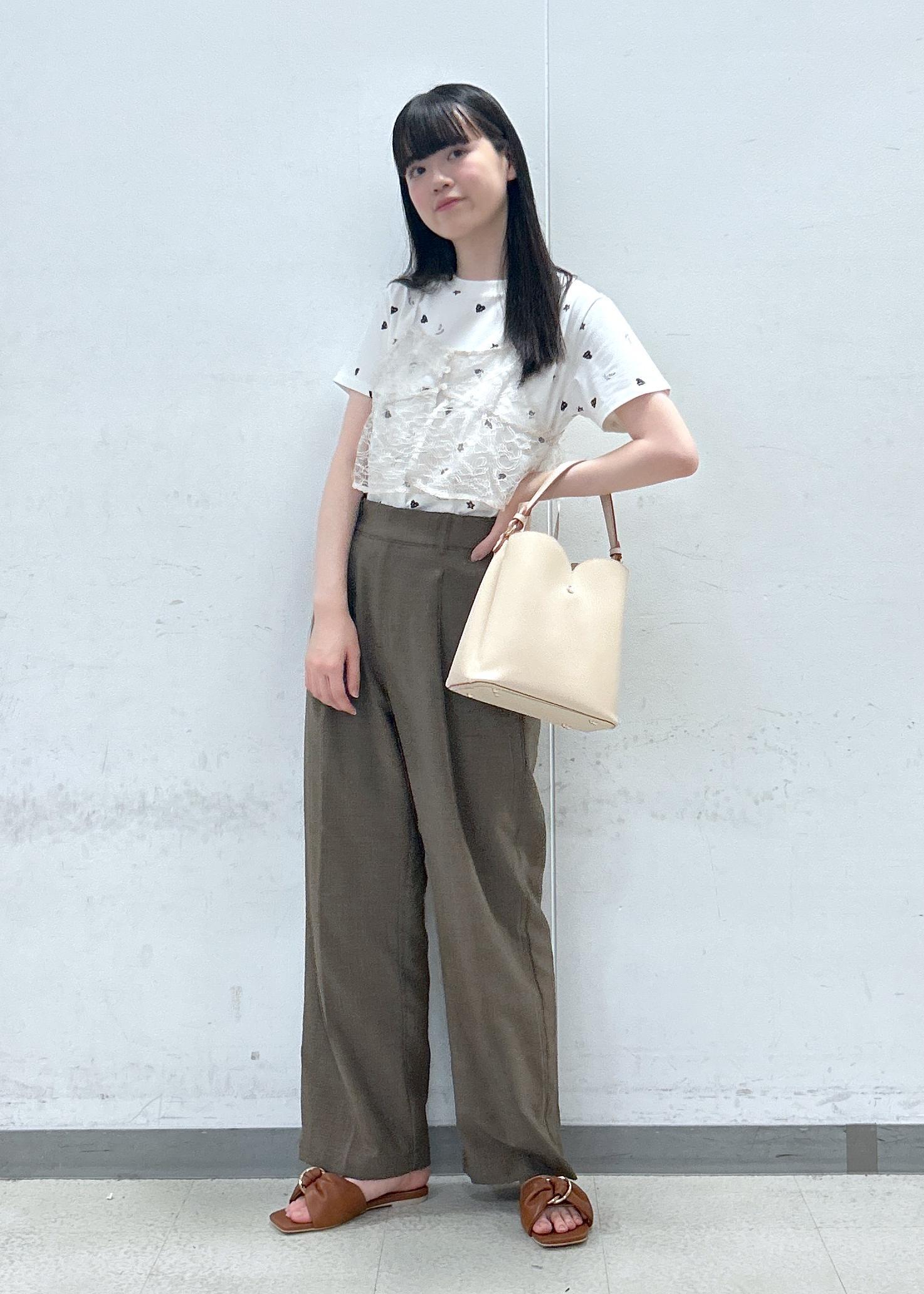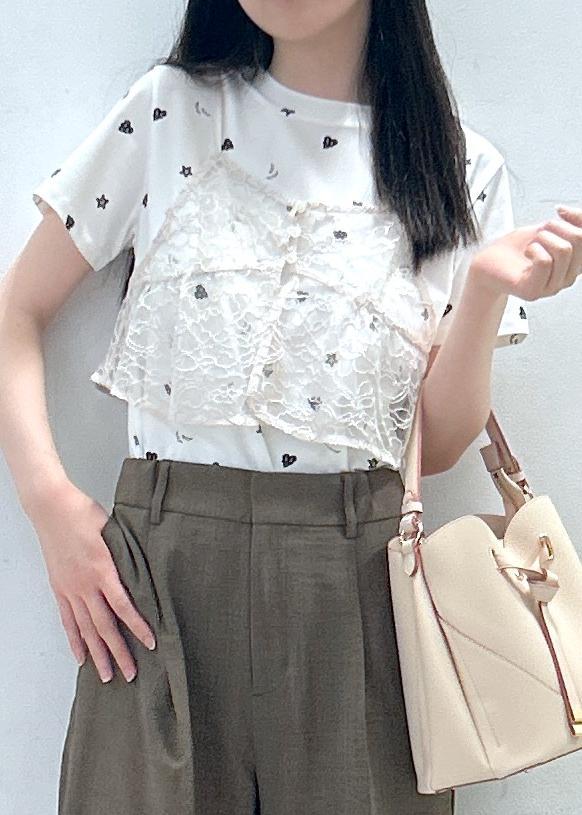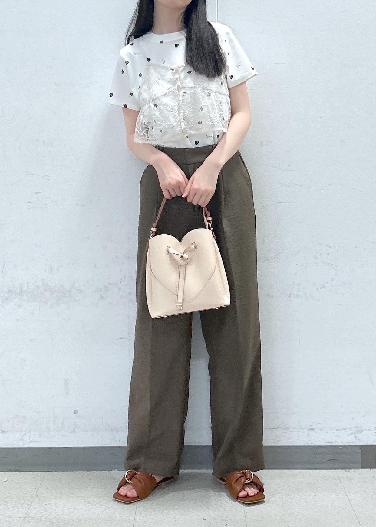 レースのビスチェとハート柄のチョコムーコラボTをレイヤードしたガーリーなトップスに、落ち着いた色のパンツを合わせることで甘さ控えめコーデに!