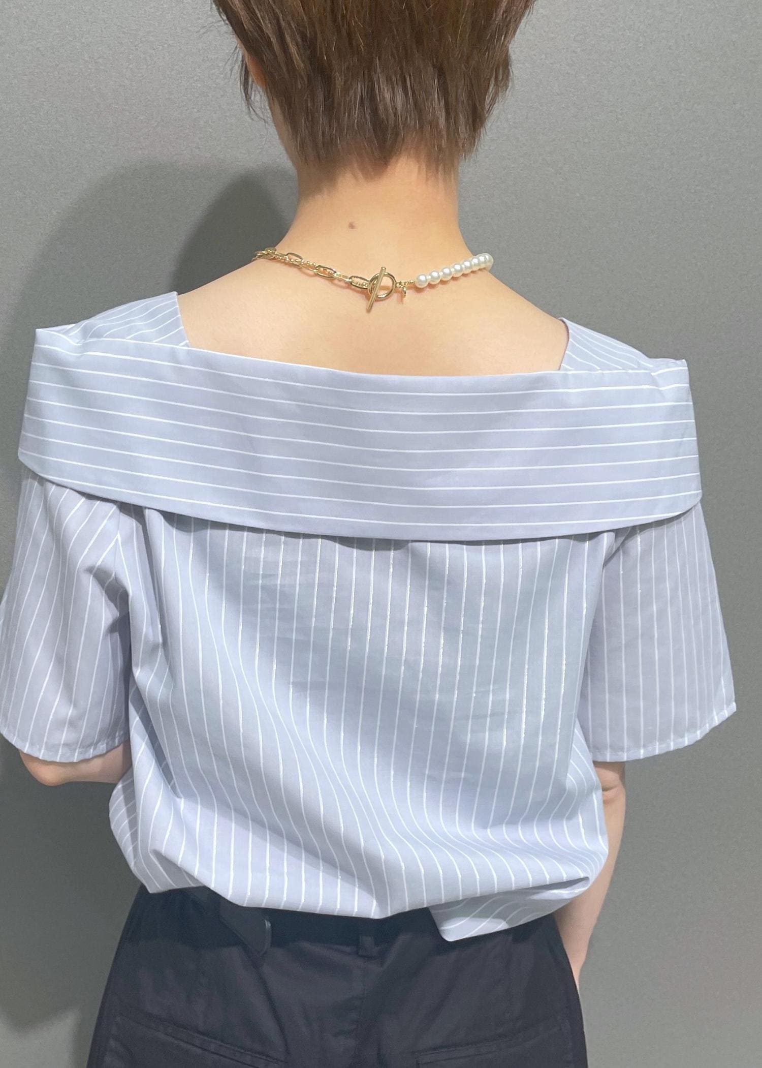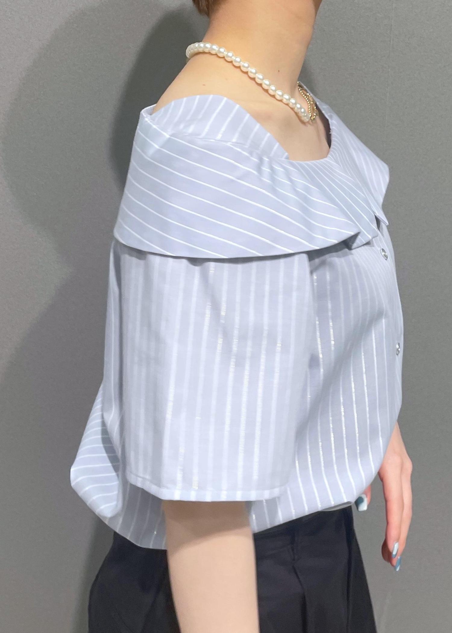 VIS【新色追加】【防シワ】ラメミックスオフショルダー風ストライプシャツライトグレー / F¥5,489レビュー150cmで腰がしっかり隠れる丈でした。