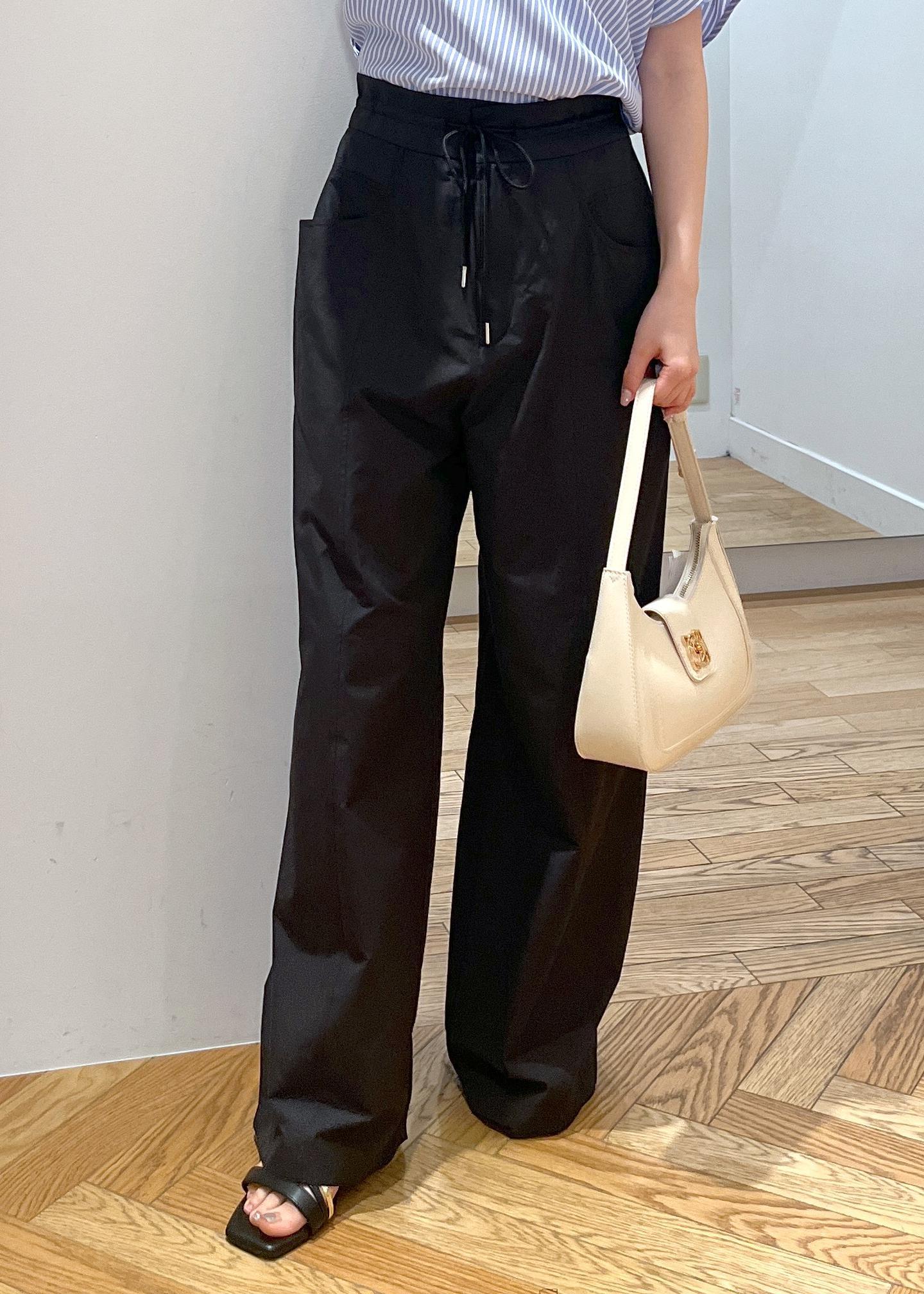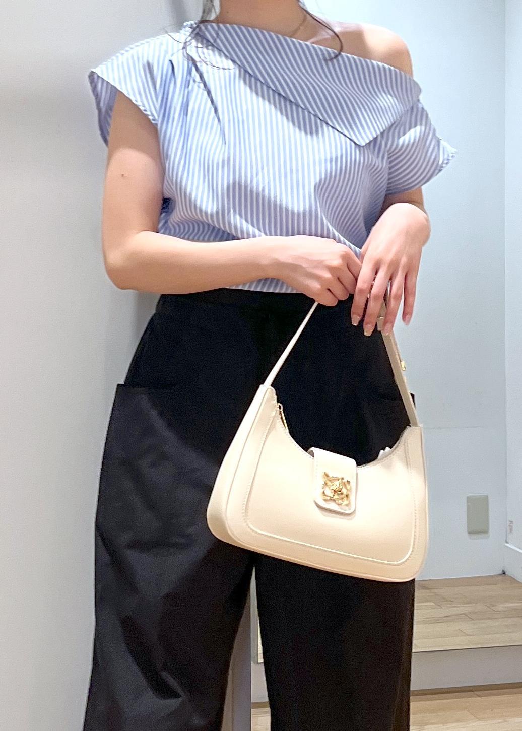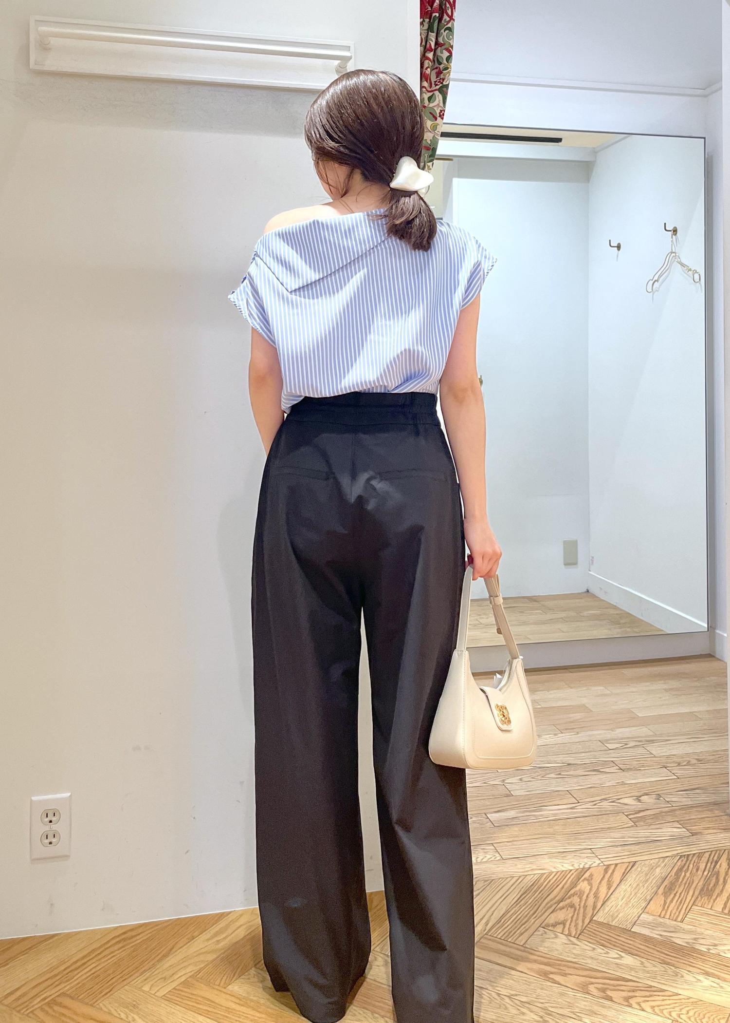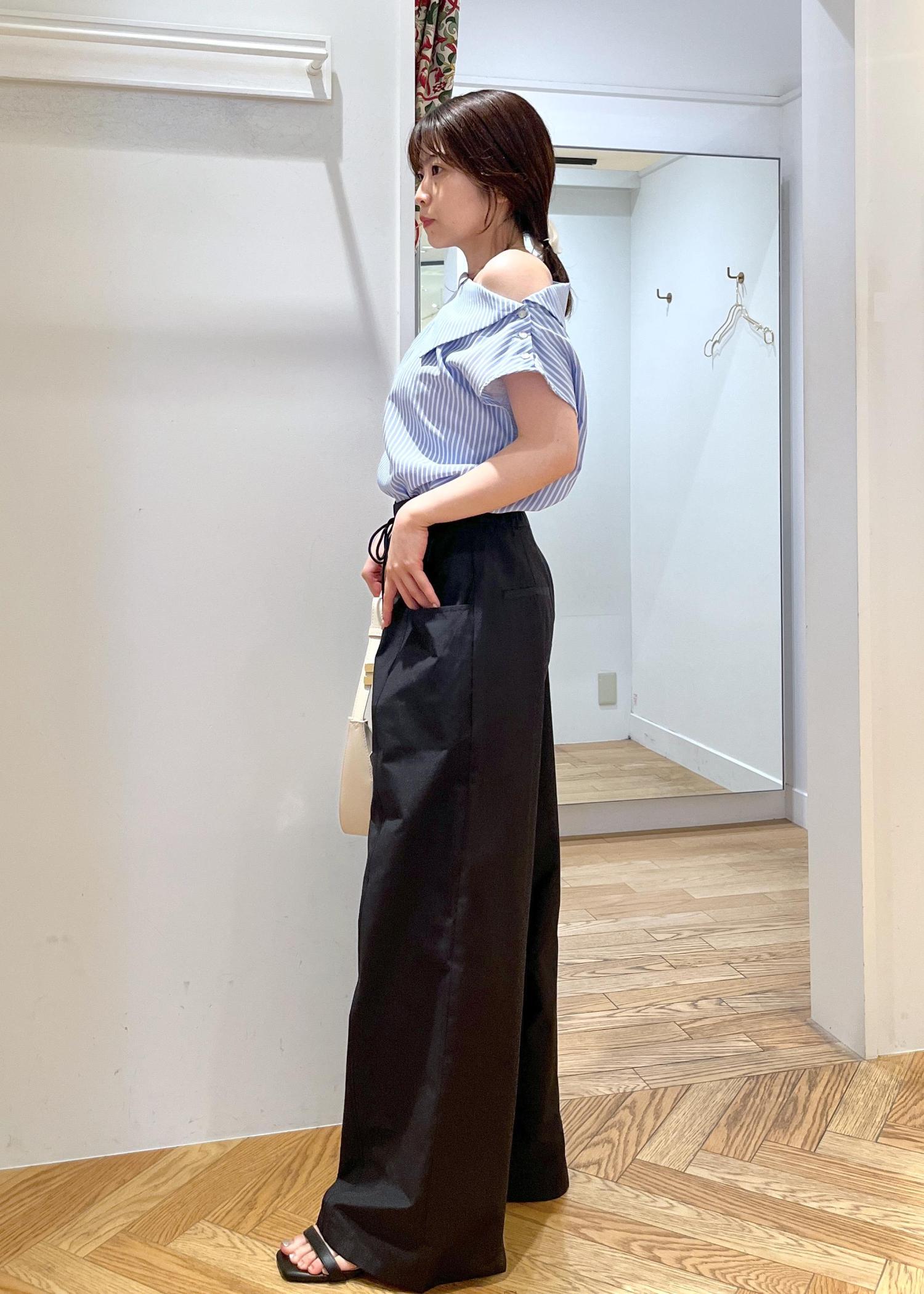 シャカシャカパンツにワンショルダーブラウスを合わせて大人カジュアルに!