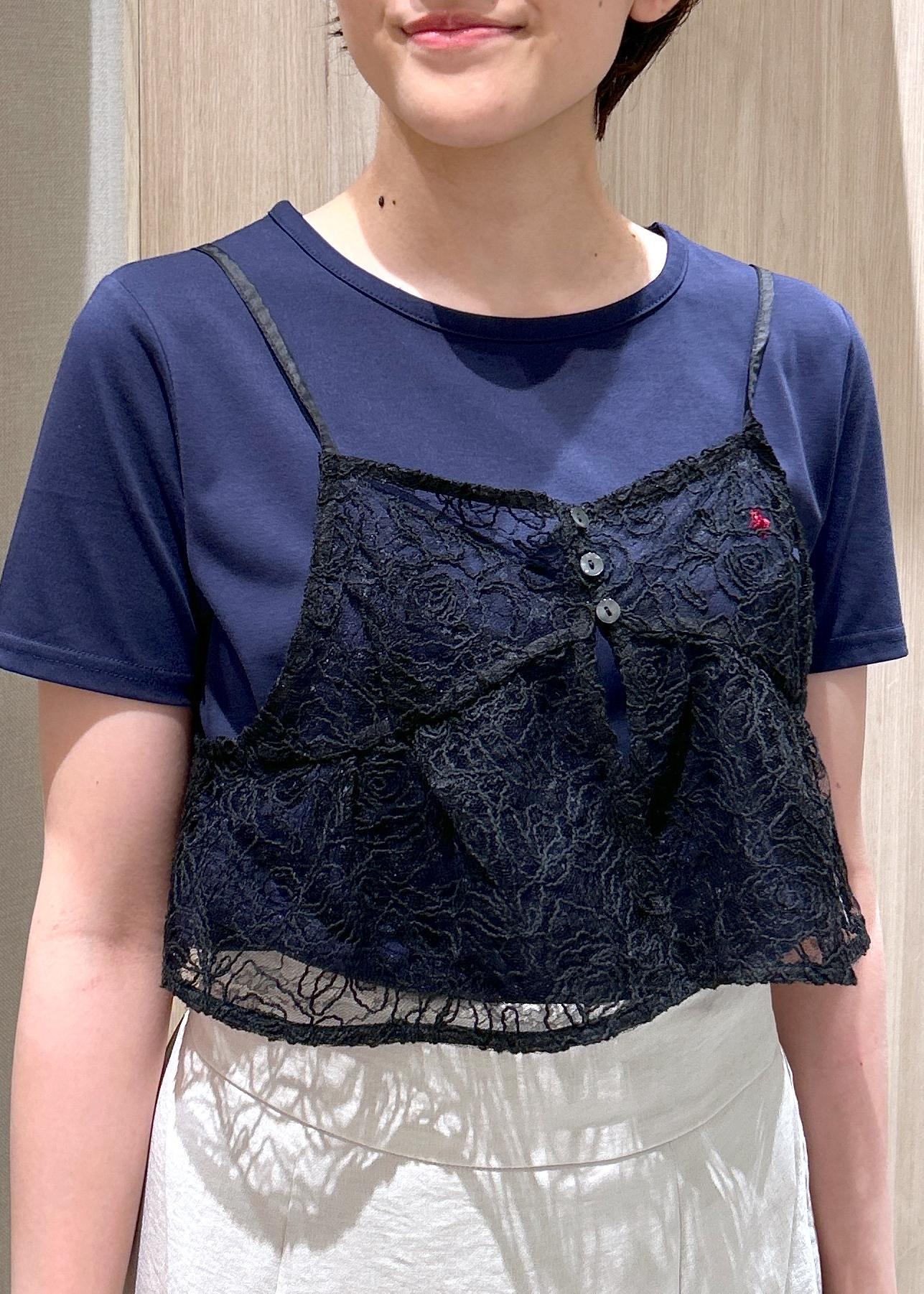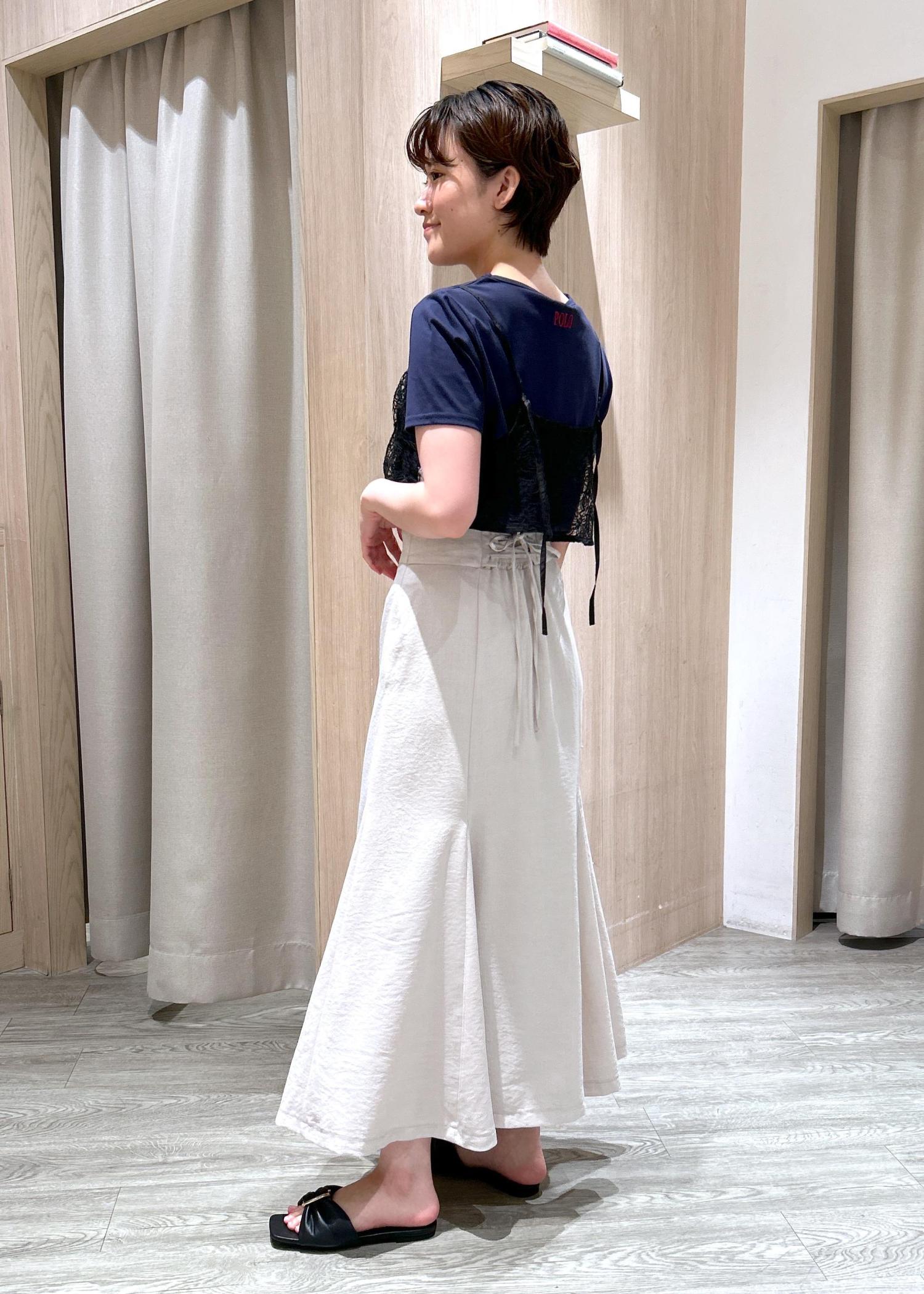 Tシャツ×マーメイドスカートだと少し寂しいので、レースのビスチェをレイヤードすることでオシャレ感UPします◎