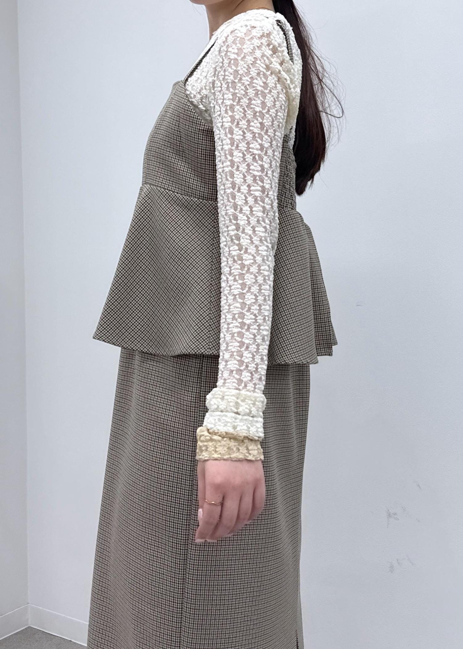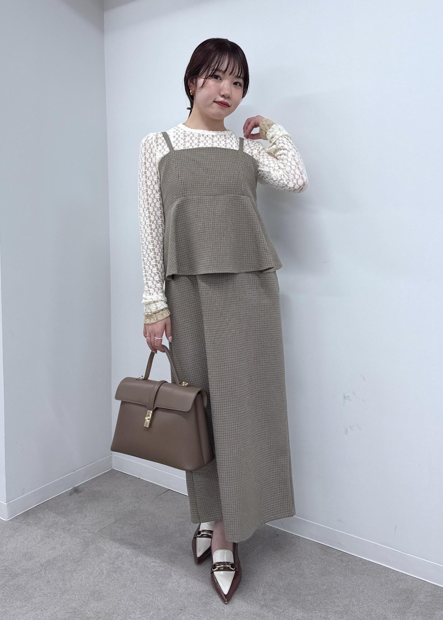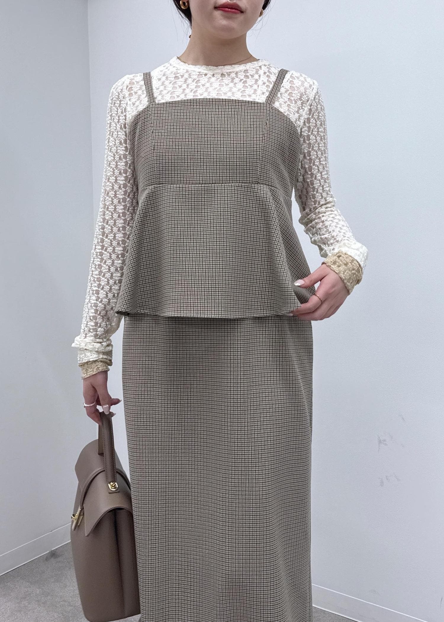 秋らしいチェックのぺプラムワンピースをメインに、ブラウンやベージュのワントーンコーデで一気に初秋を感じさせるスタイリングに!レースのインナーをプラスして華やかな印象に◎