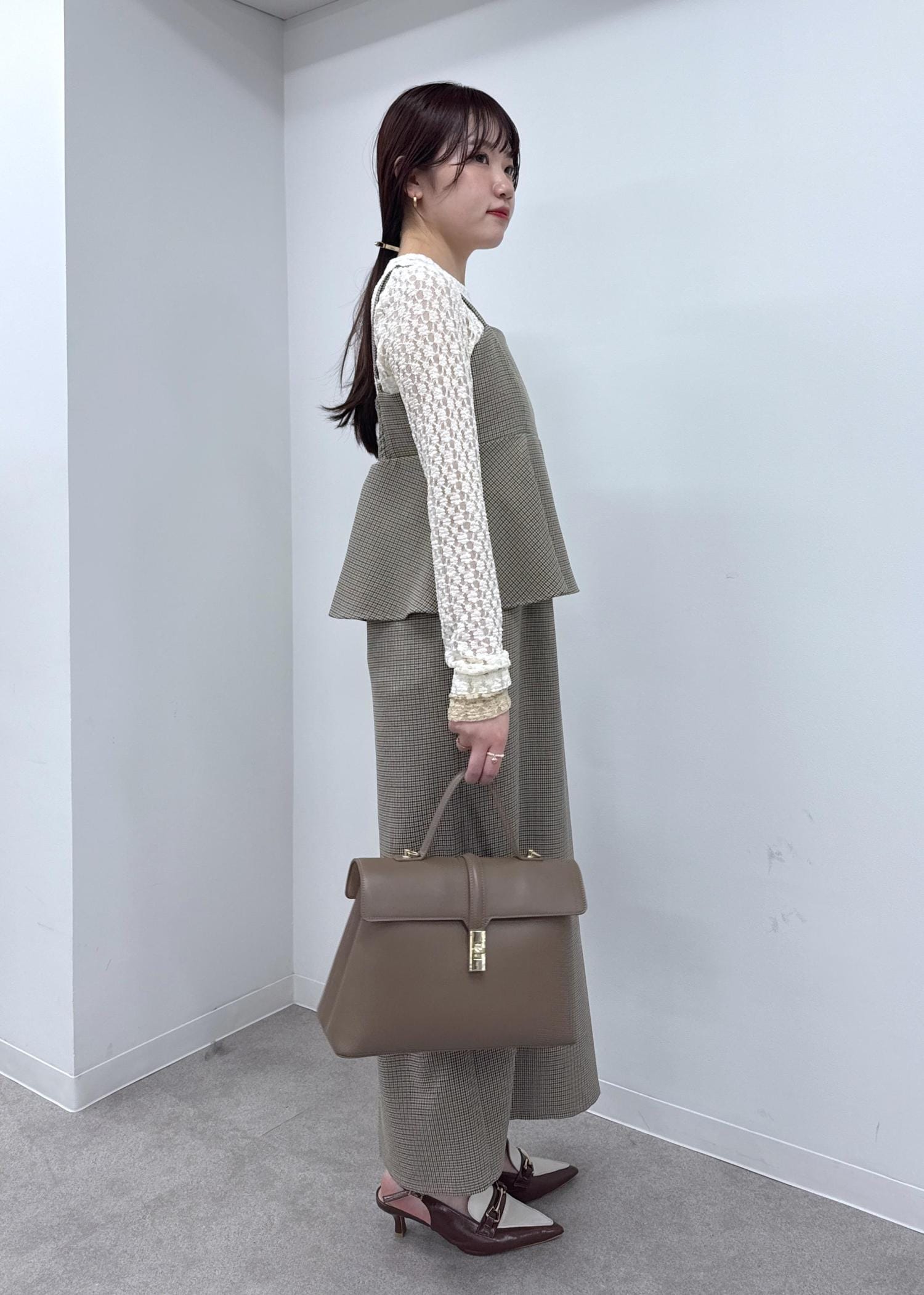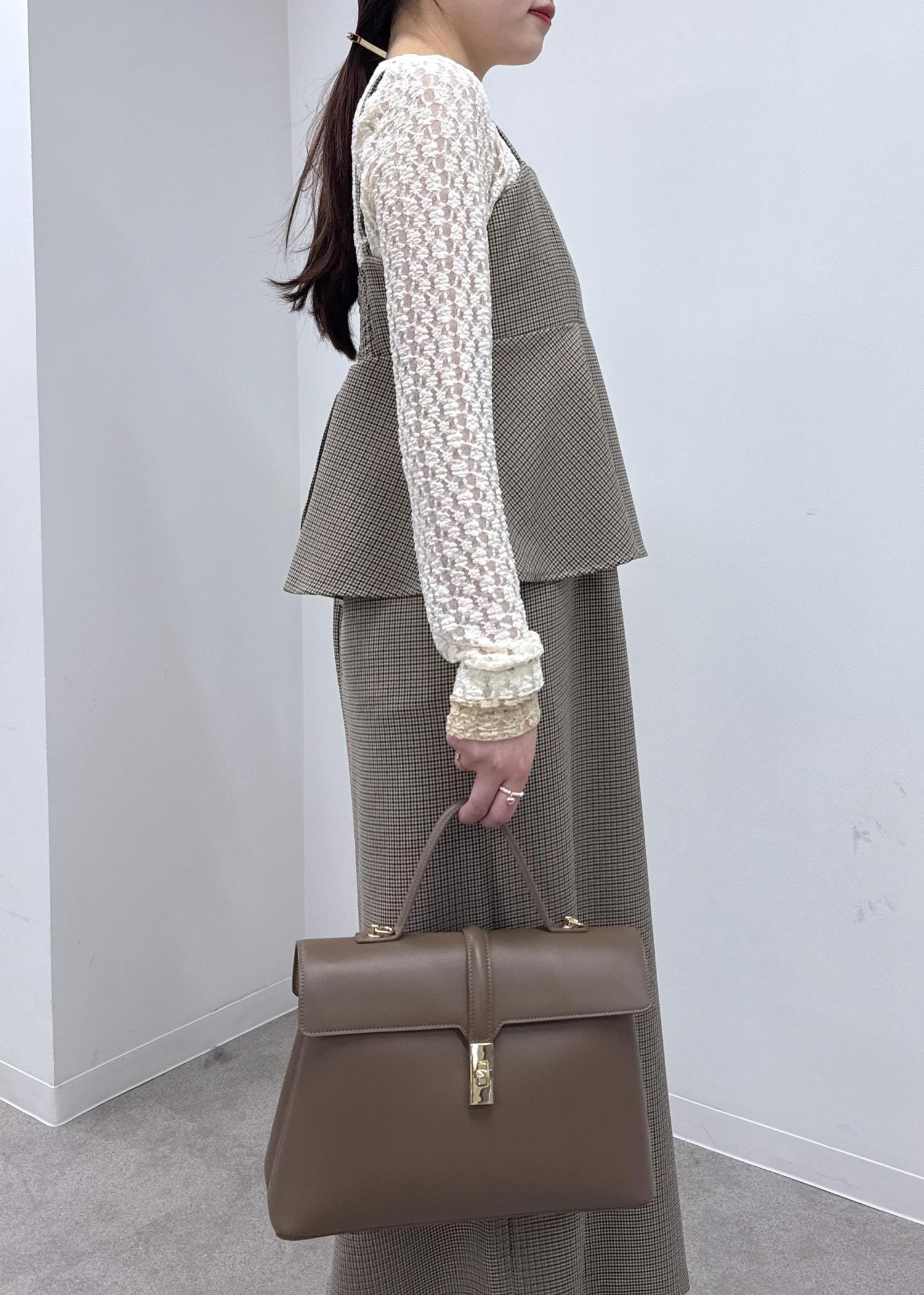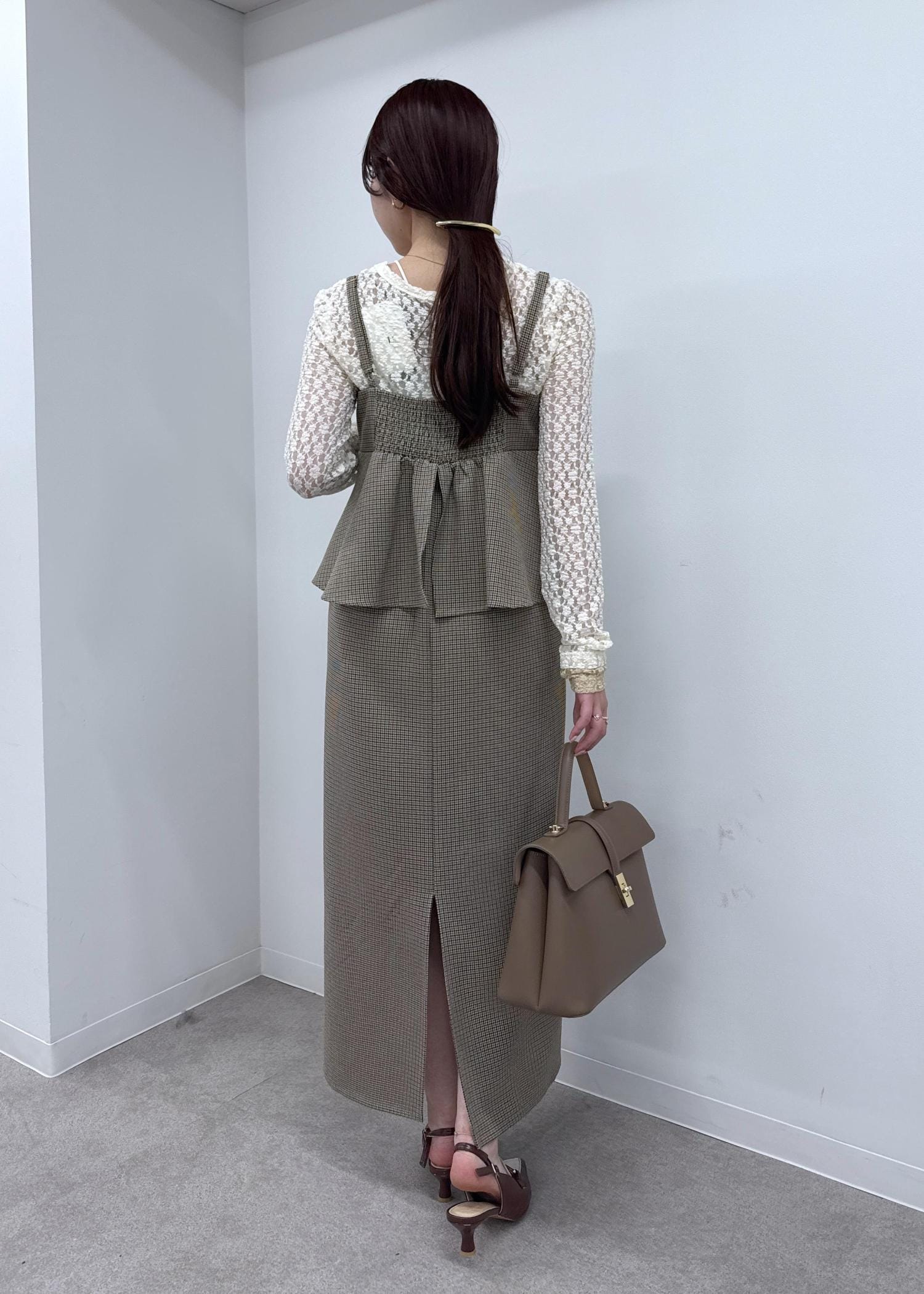秋らしいチェックのぺプラムワンピースをメインに、ブラウンやベージュのワントーンコーデで一気に初秋を感じさせるスタイリングに!レースのインナーをプラスして華やかな印象に◎