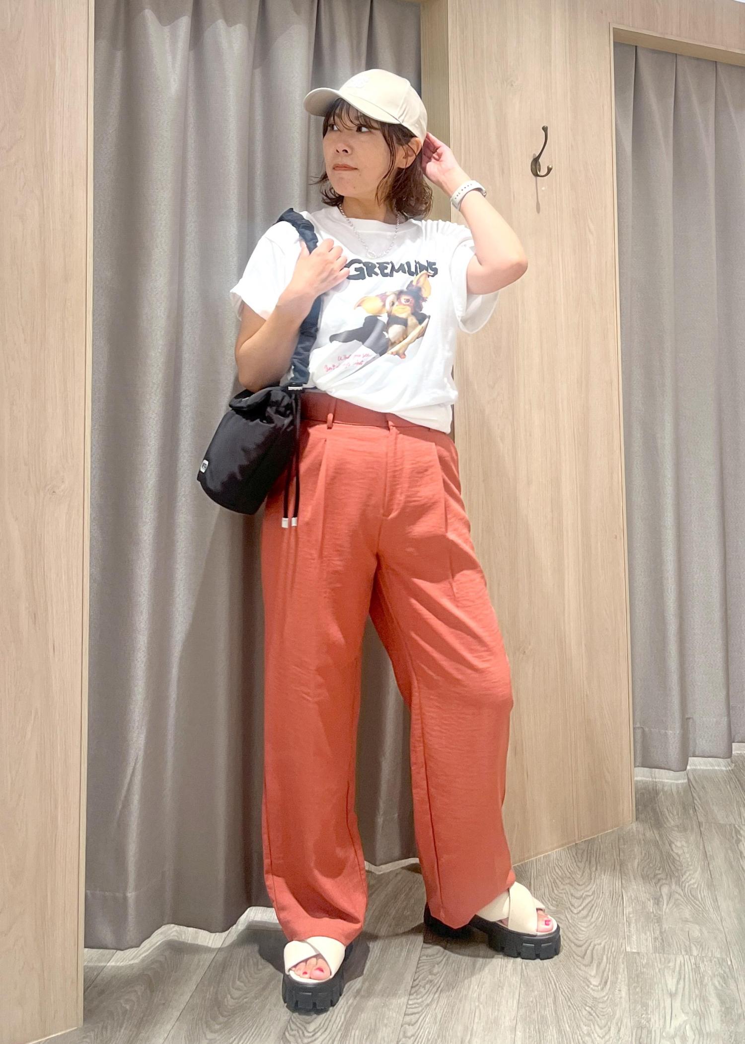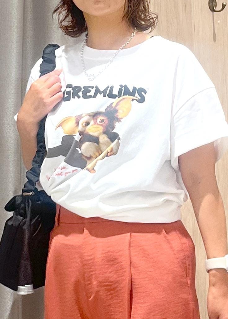 かわいいグレムリンのビックTシャツに夏らしいオレンジパンツを合わせました。