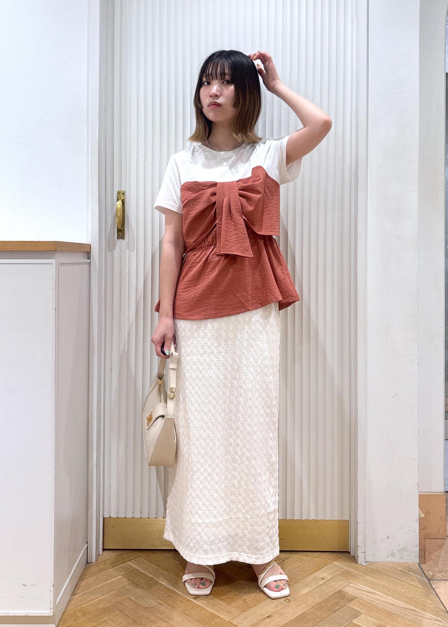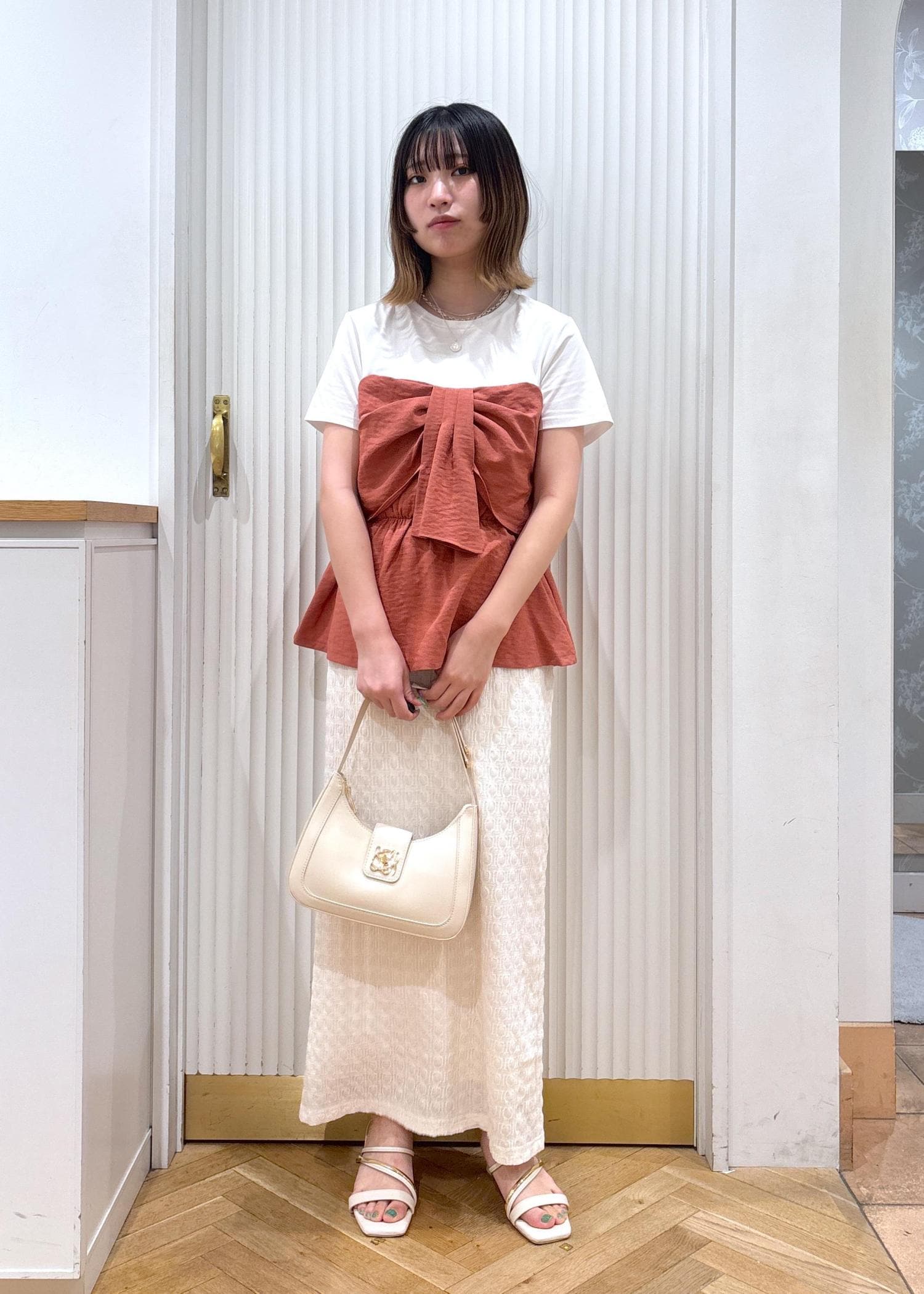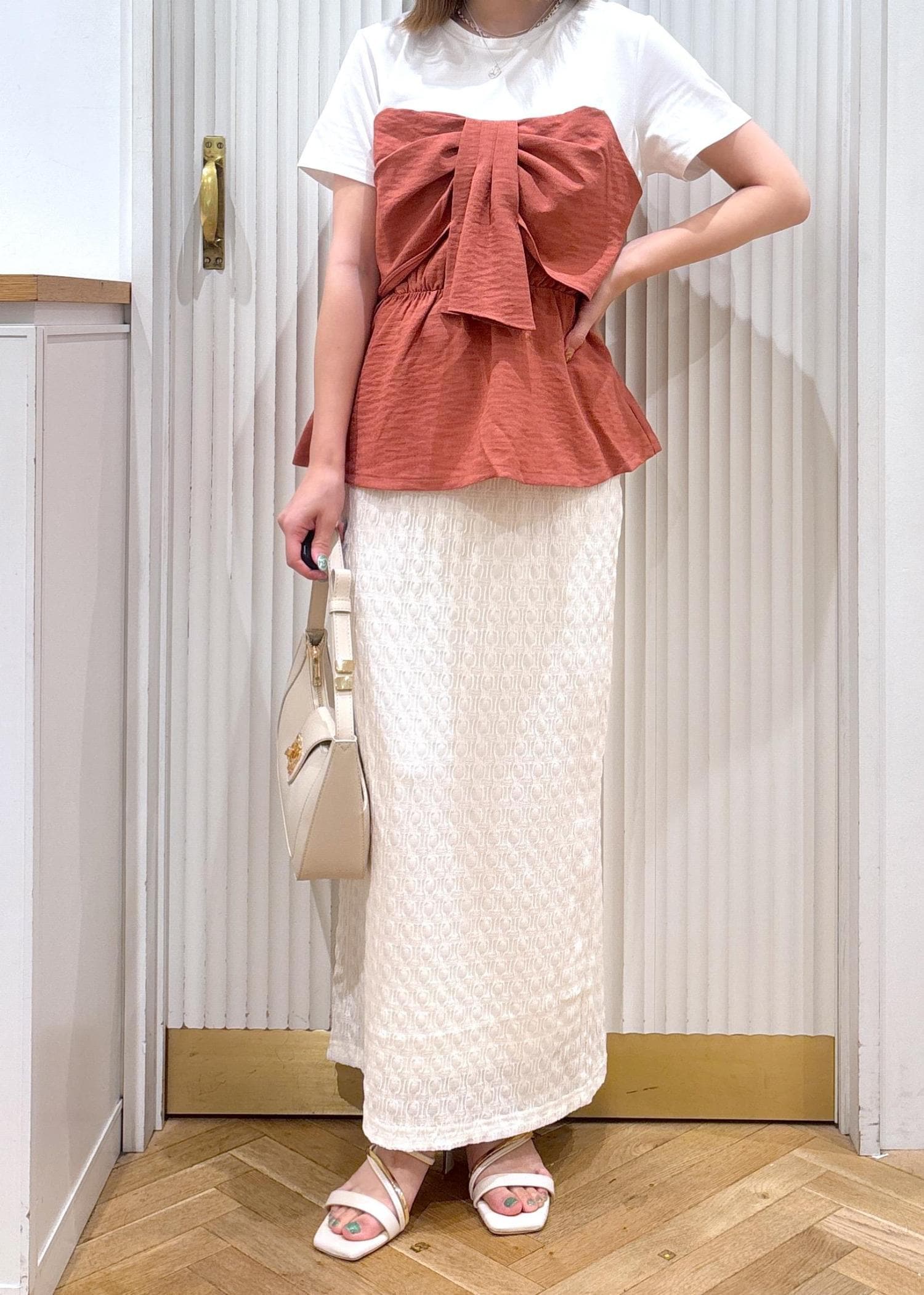 大きいリボンのようなデザインのトップスなので白と合わせて少し甘さをプラスさせ、女性らしいカジュアルコーデになっています!