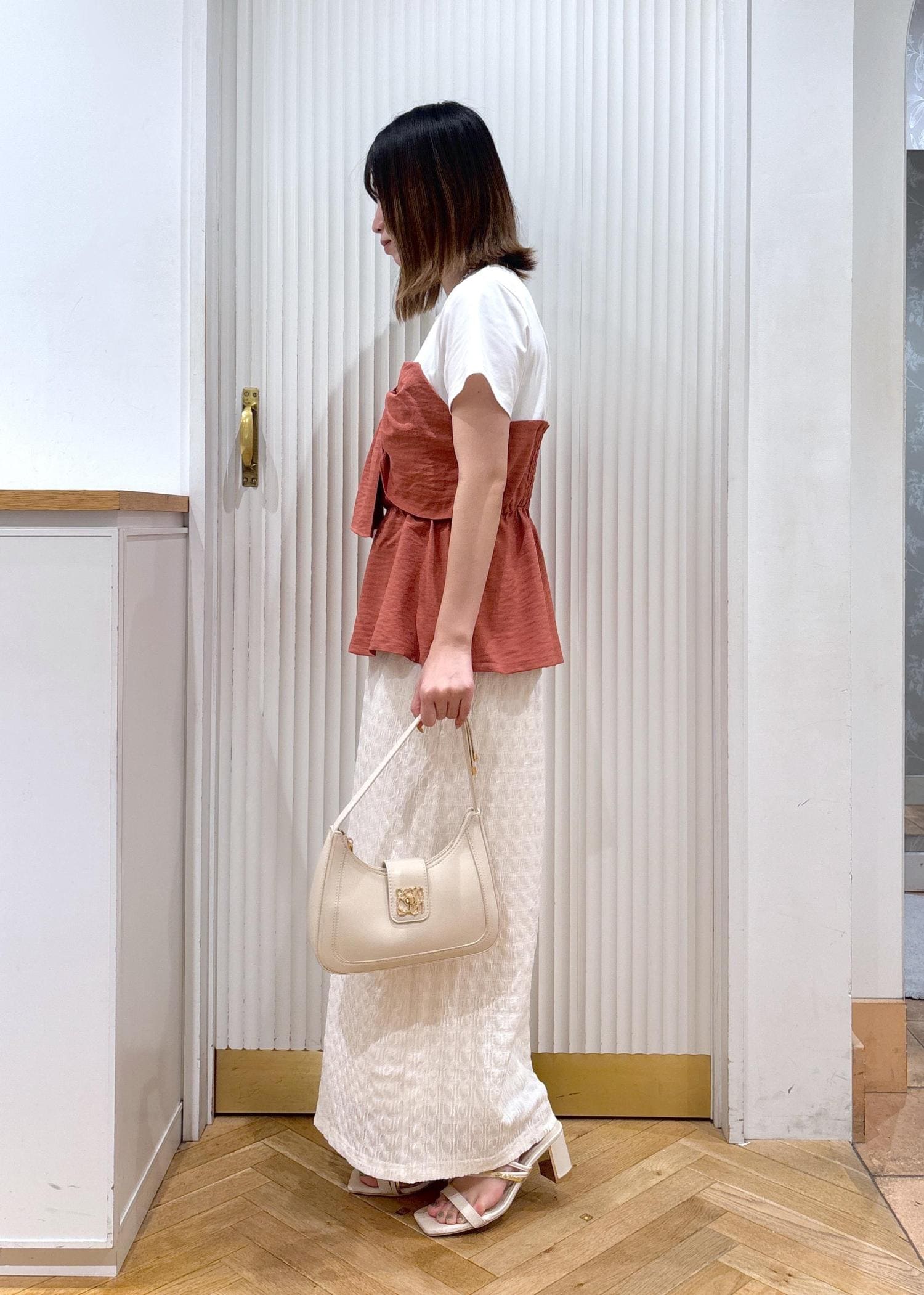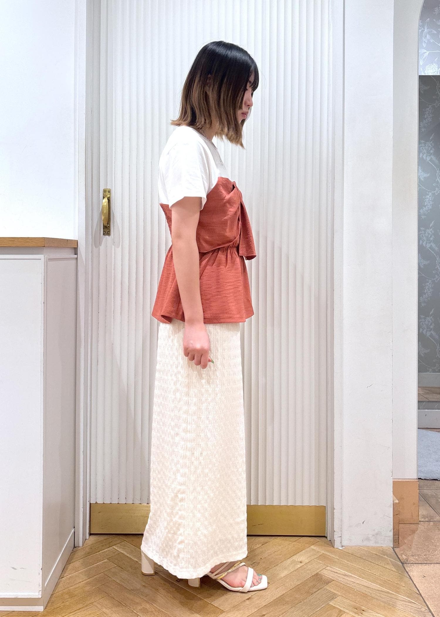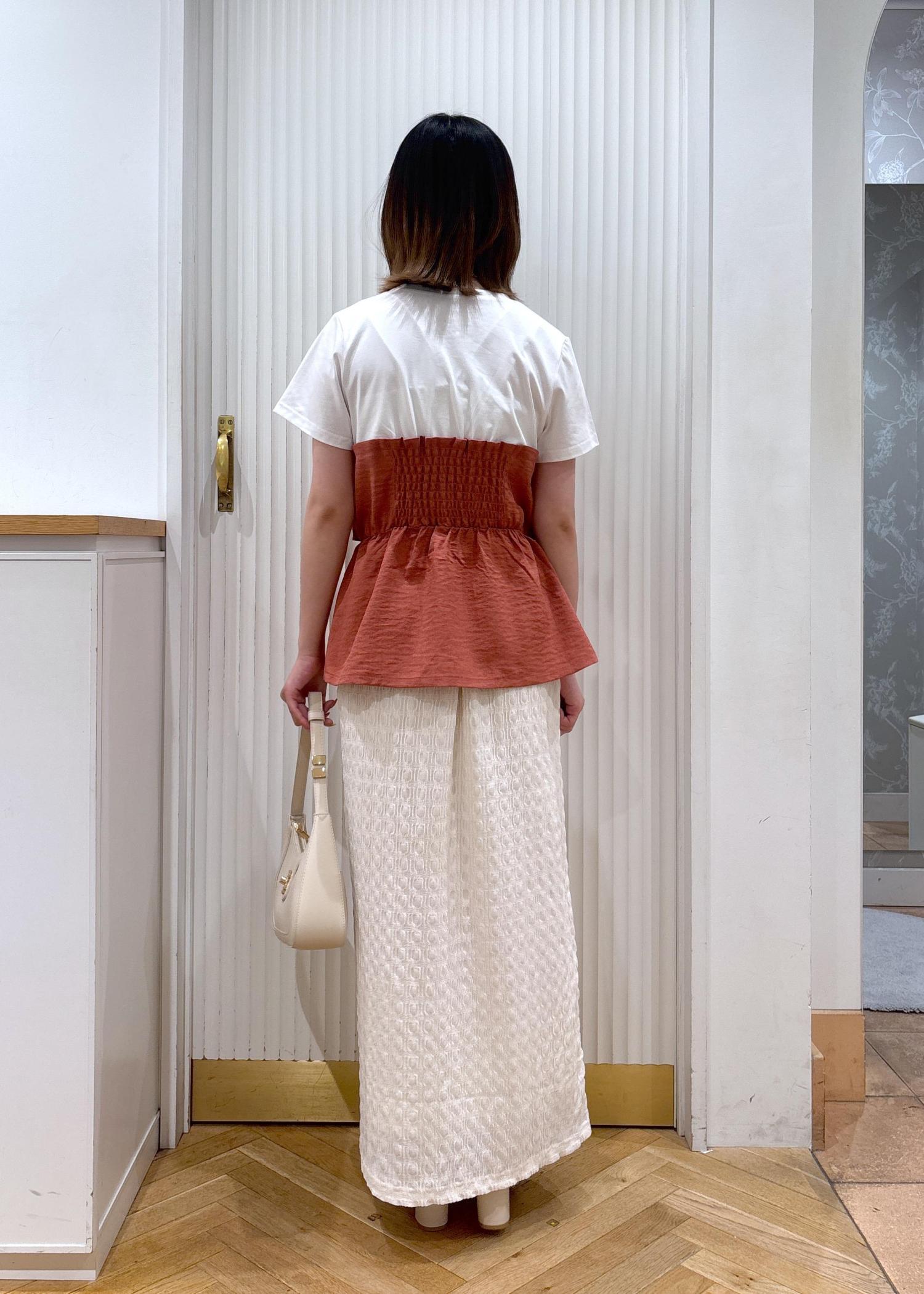 ウエストで切り替えがあるデザインのTシャツなのでお腹周りがカバーでき、ボトムはアイラインで合わせることで下半身がすっきりして見えます。