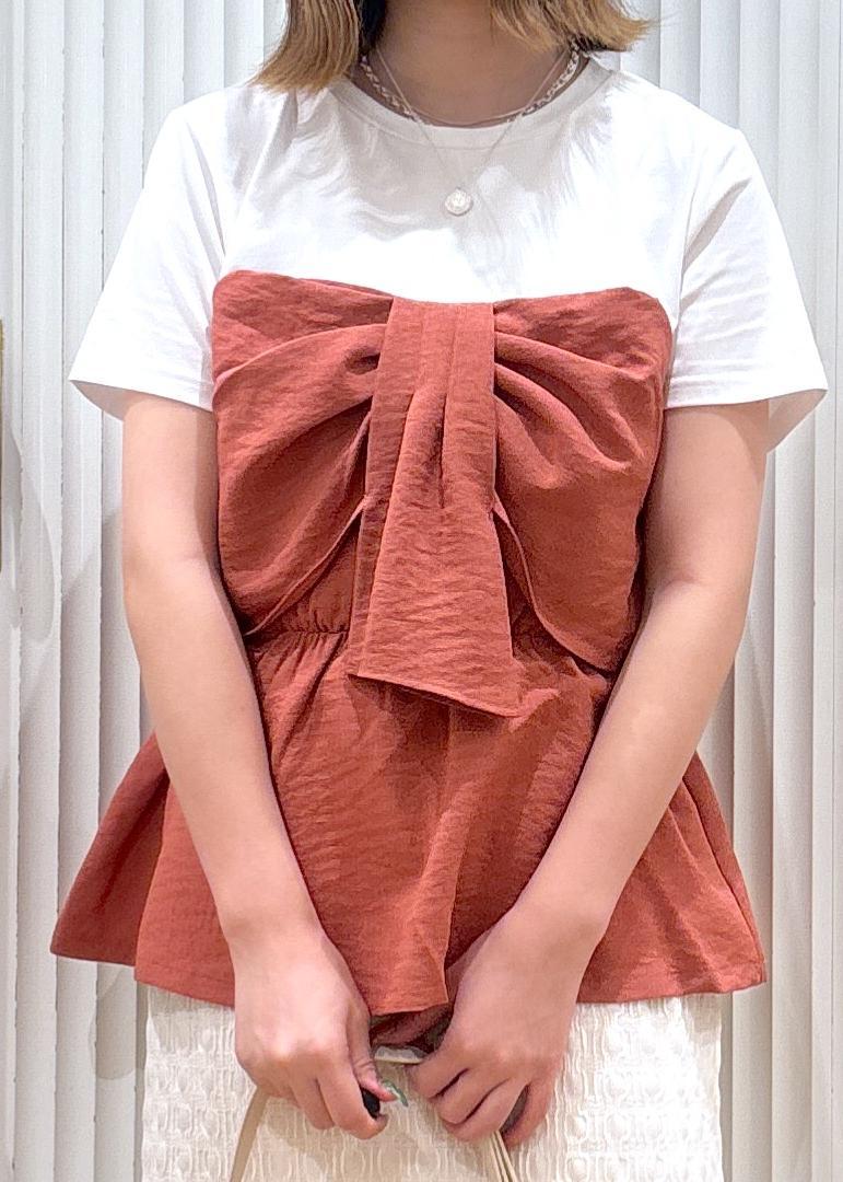 VIS【新色追加】【美easy】ねじりリボンTシャツドッキングプルオーバー【接触冷感/洗える】オレンジ系 / F¥5,489レビュー大人気リネンライクシリーズのTシャツです!