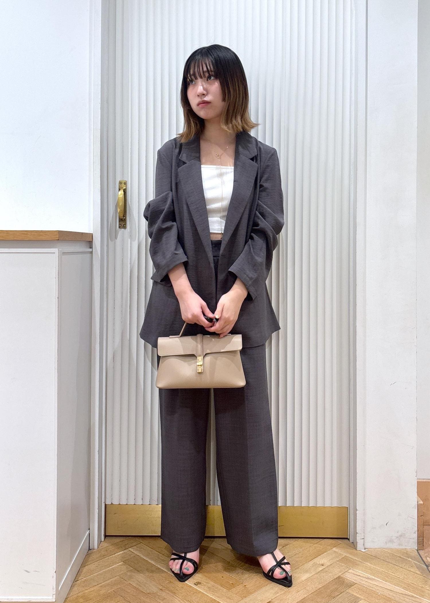 インナーやバッグに明るい色を合わせることで暗くならず、顔周りや雰囲気が明るくなります。