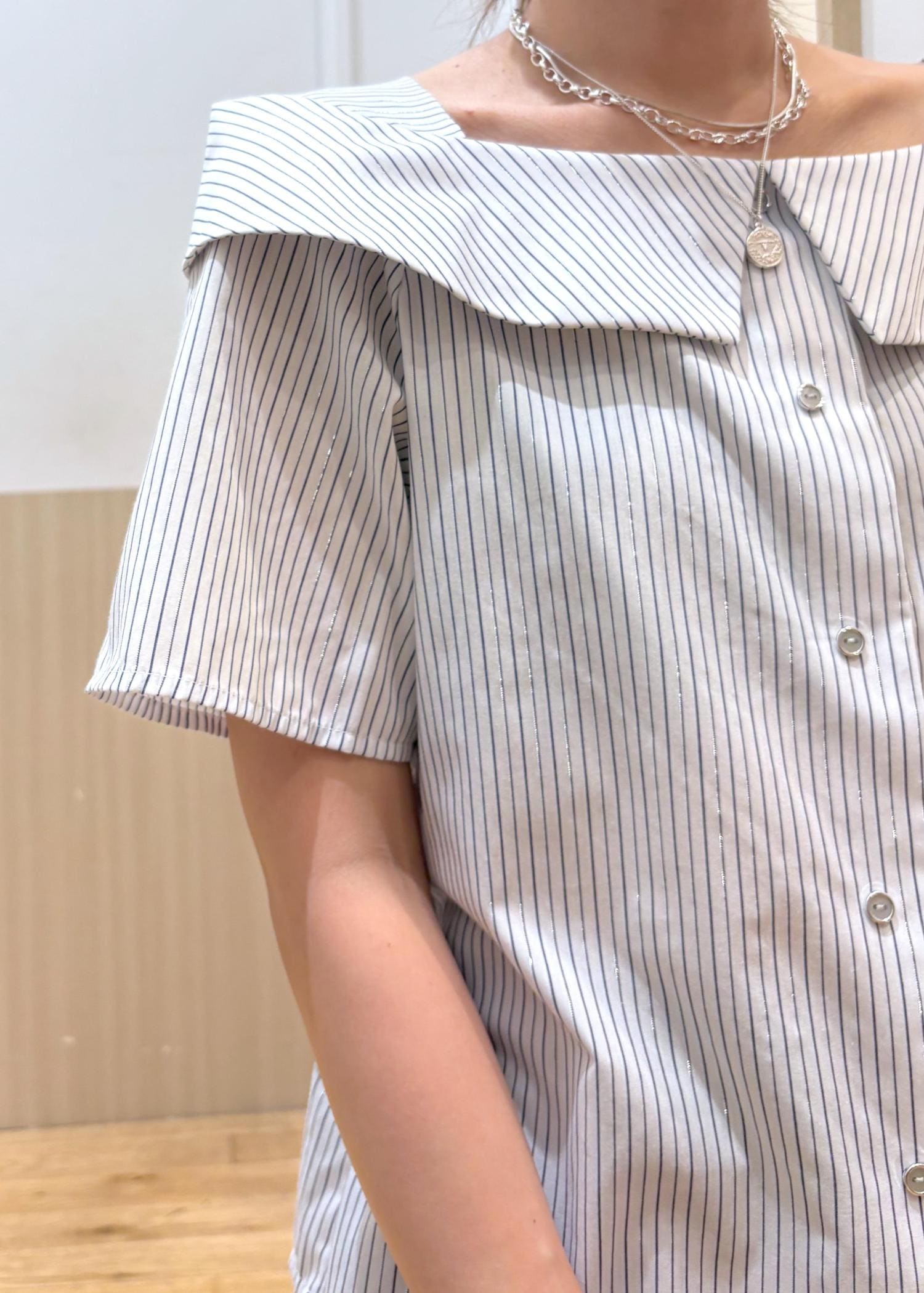 VIS【新色追加】【防シワ】ラメミックスオフショルダー風ストライプシャツホワイト系 / F¥5,489レビュー肩紐が見えないような工夫がされている便利なシャツです。
